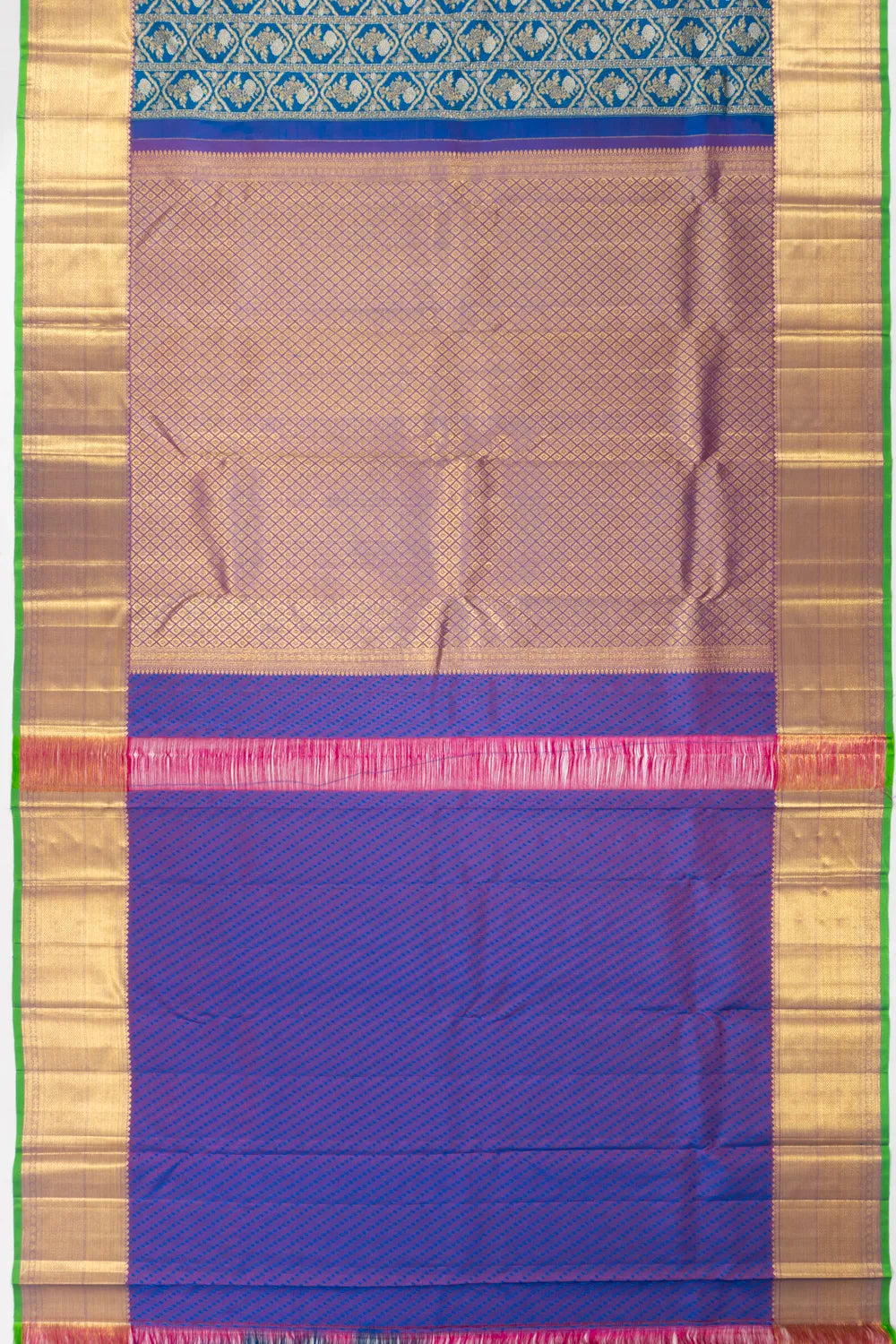 Contrasting purple medium border adorned with gold zari brocade featuring diagonal lines, finished with a vibrant green edge for added richness.