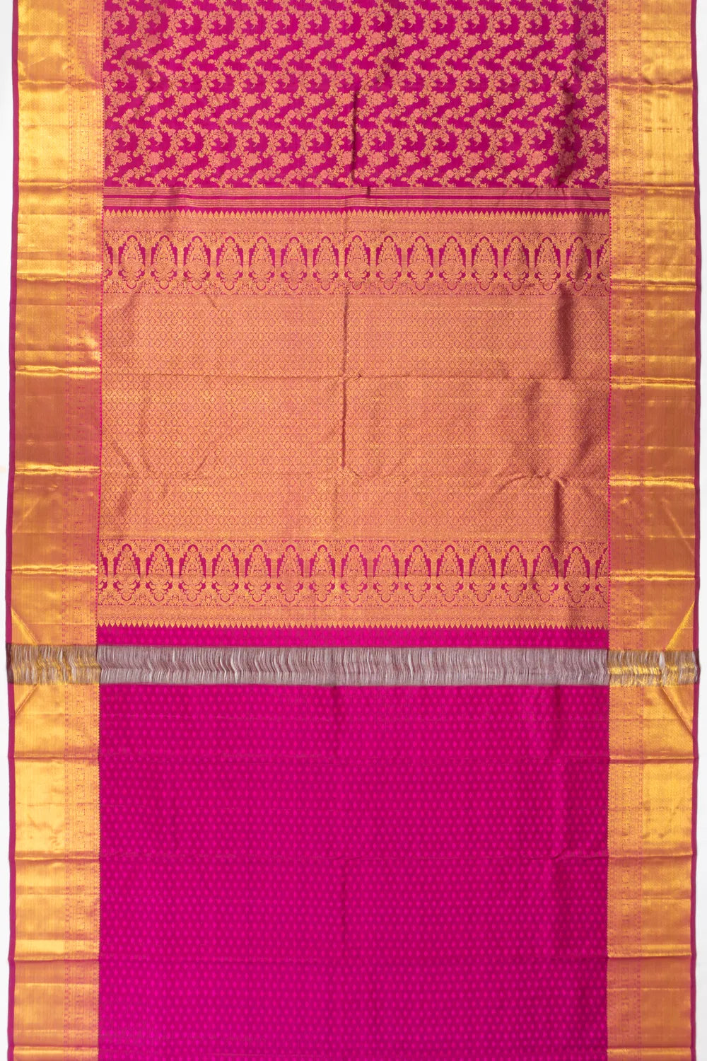 Self gold zari medium border featuring zig-zag lines with peacock motifs woven in elegant sequence.