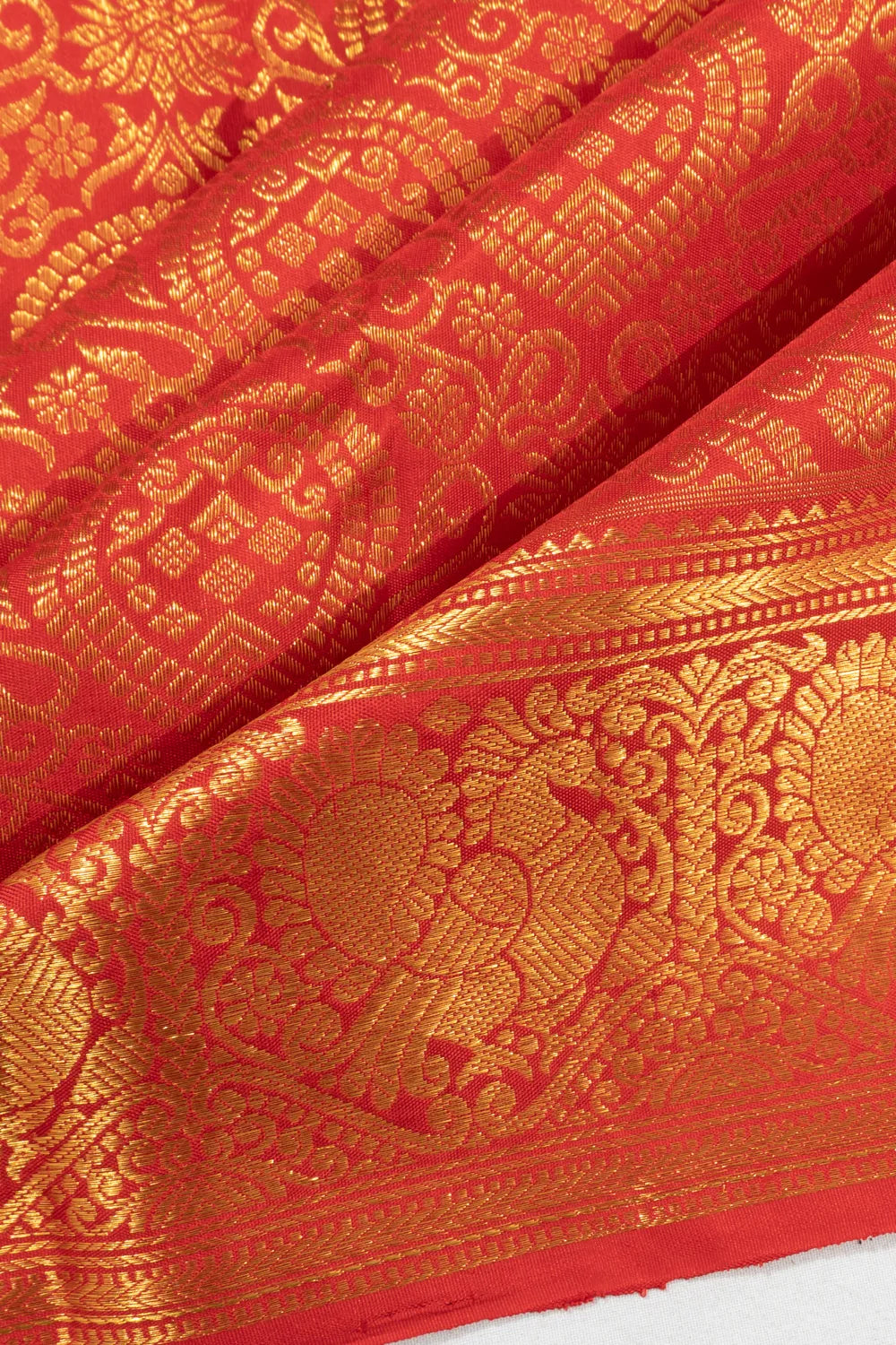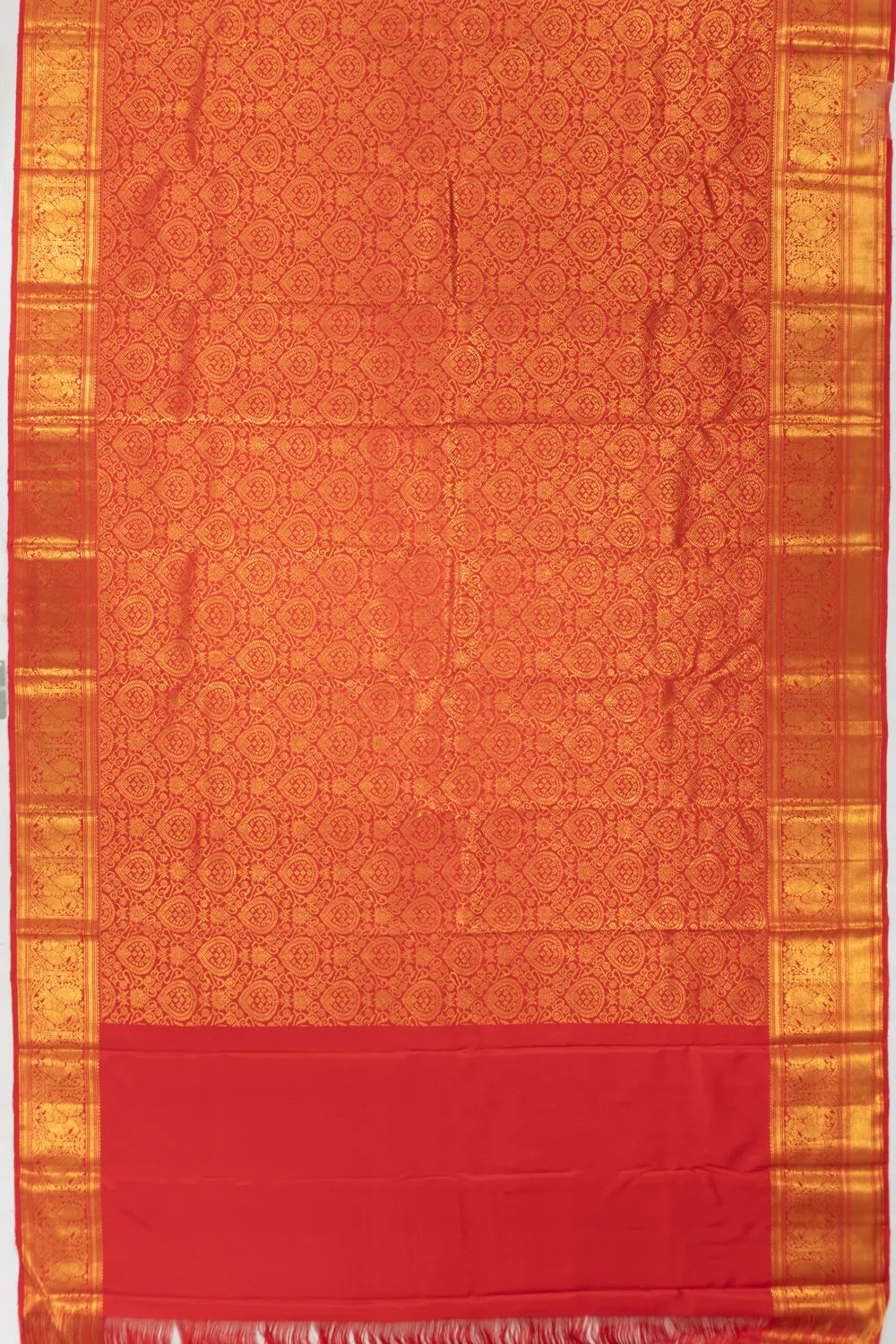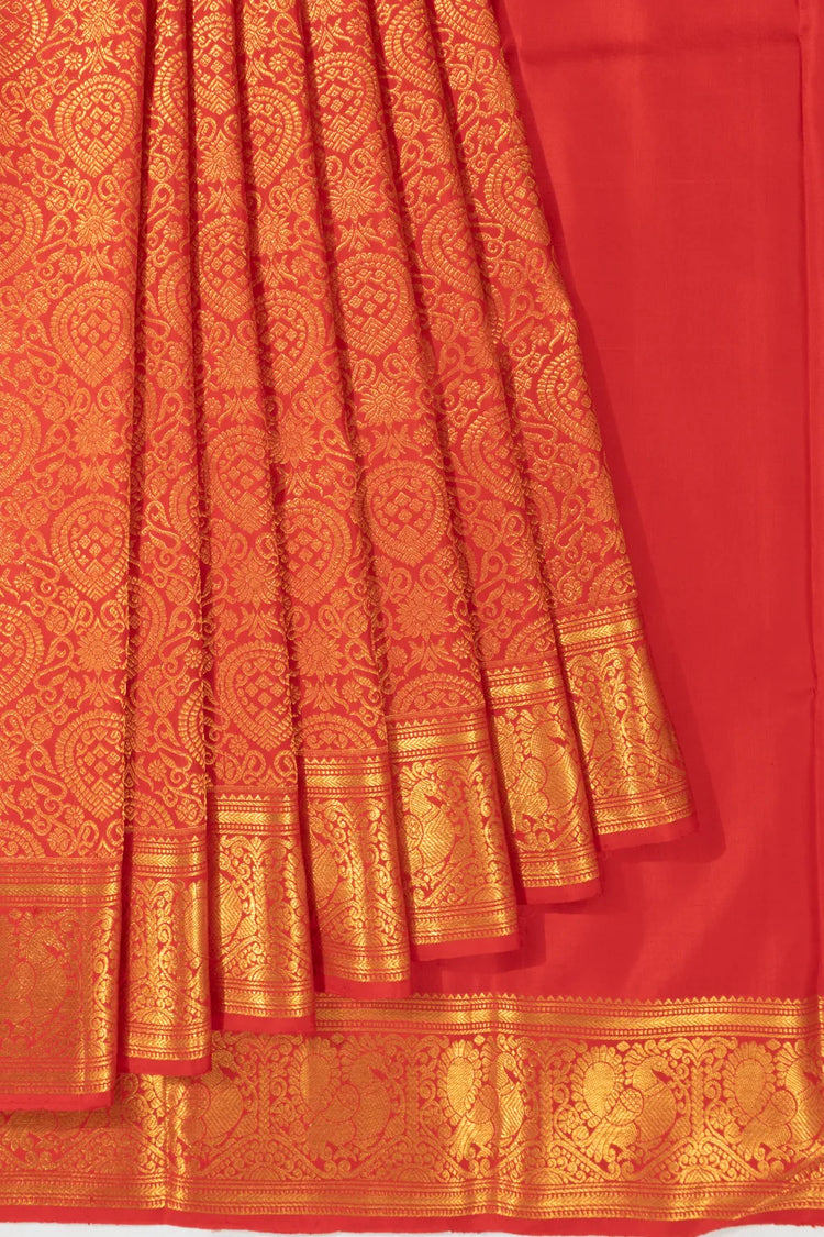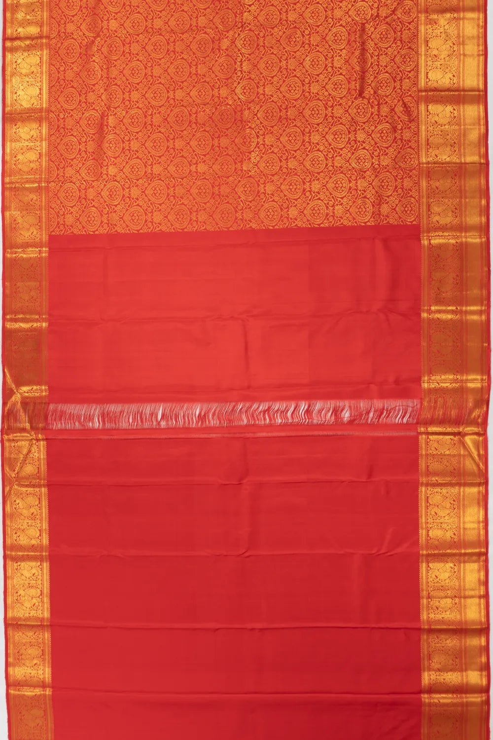 Classic red base with all-over gold zari floral brocade, lending a rich and festive charm.