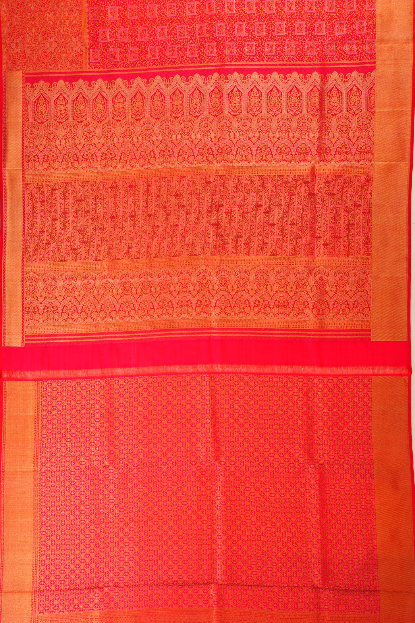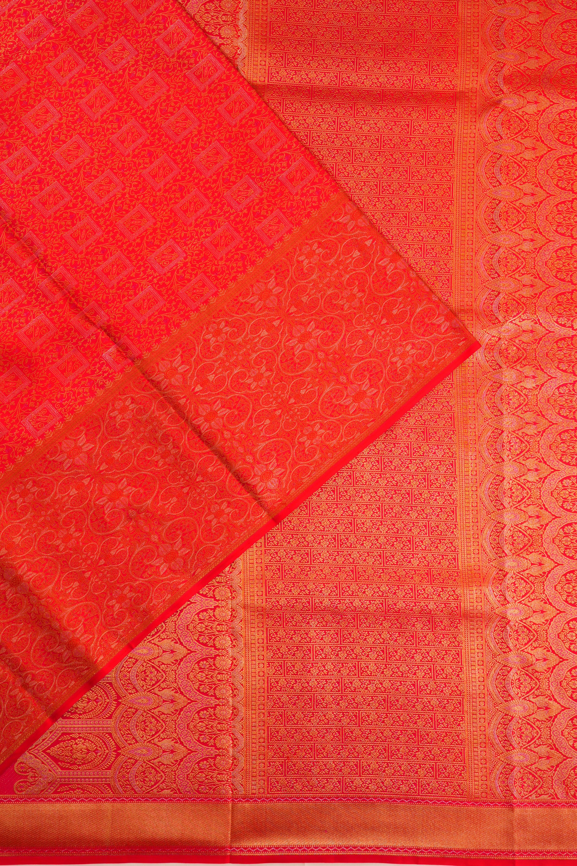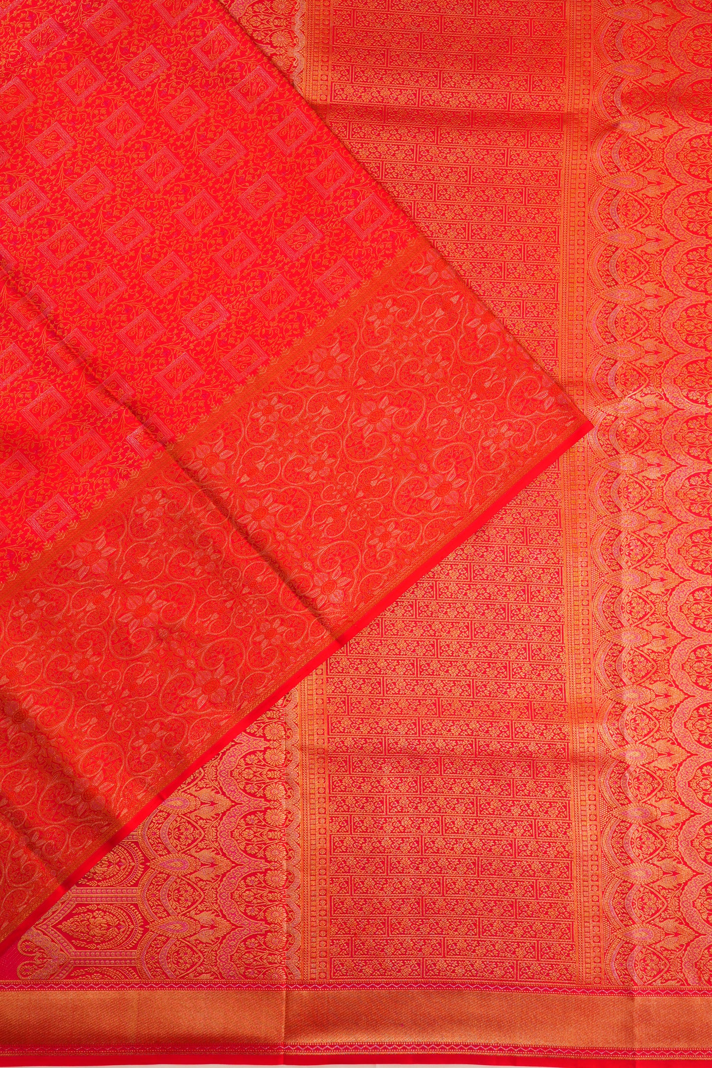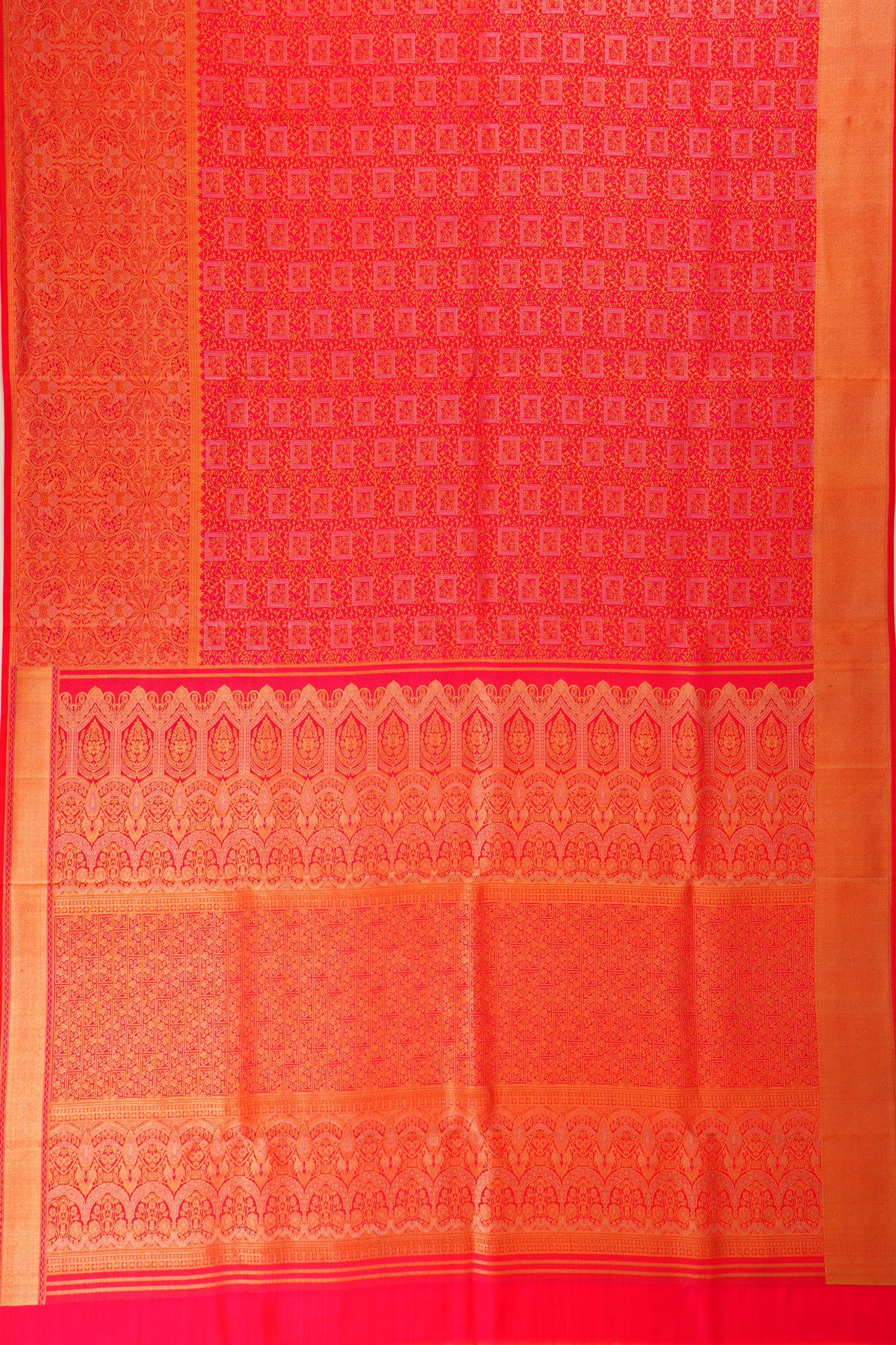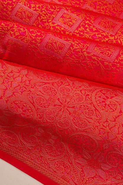 A striking red canvas comes alive with gold zari floral vines brocade, intricately intersected by silver zari checks, blending opulence with timeless geometry.