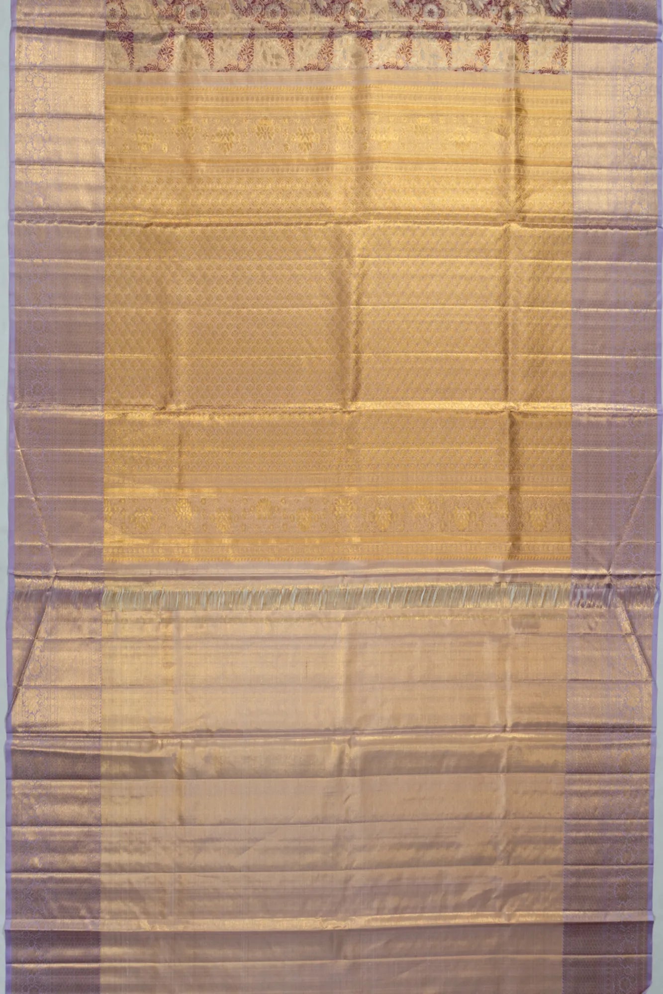 The saree is further enriched with a medium lavender border, harmoniously contrasting with the gold zari brocade and intricately woven with floral vine motifs