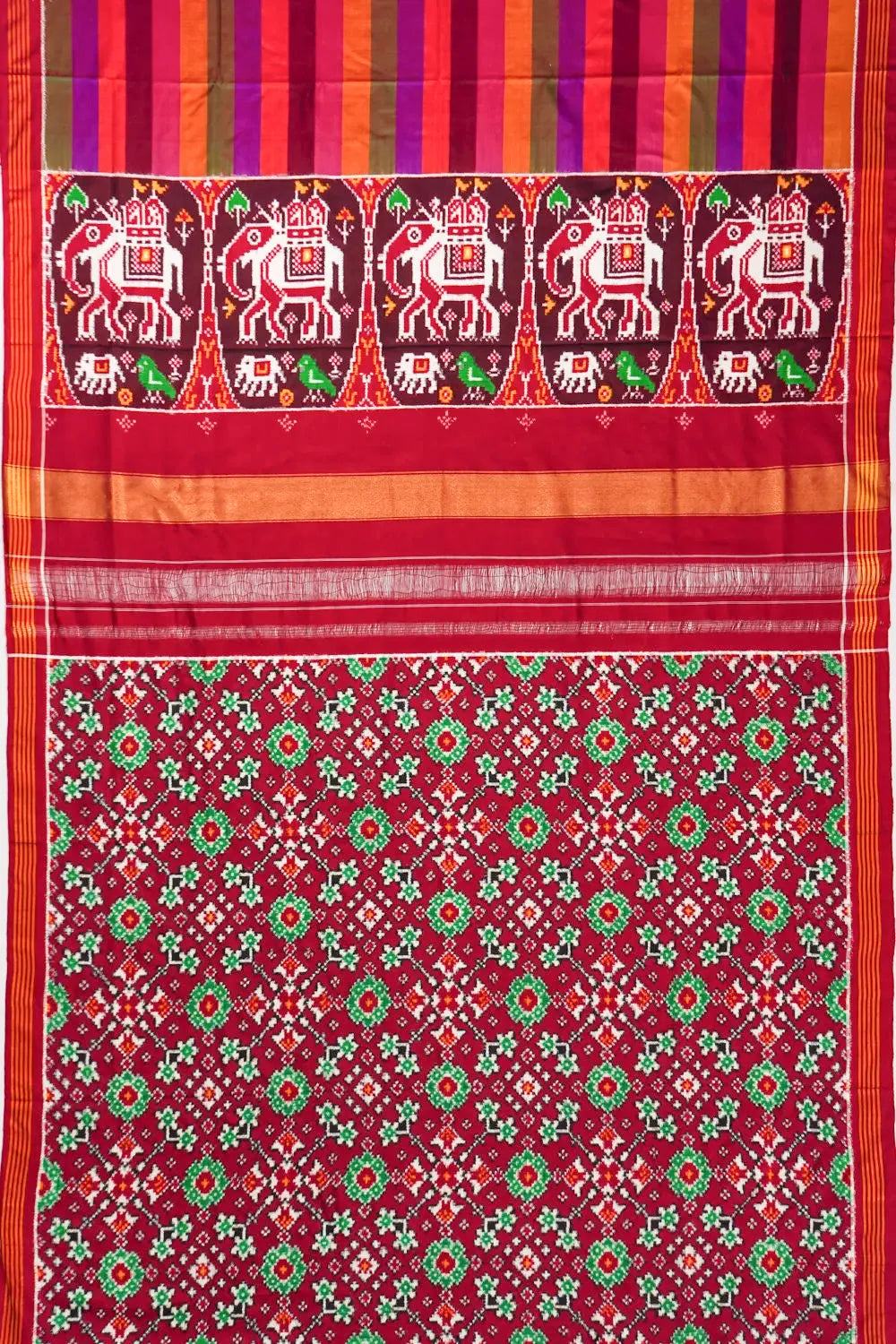 Its maroon border is adorned with contrast ikat horizontal lines, adding a graceful touch of elegance