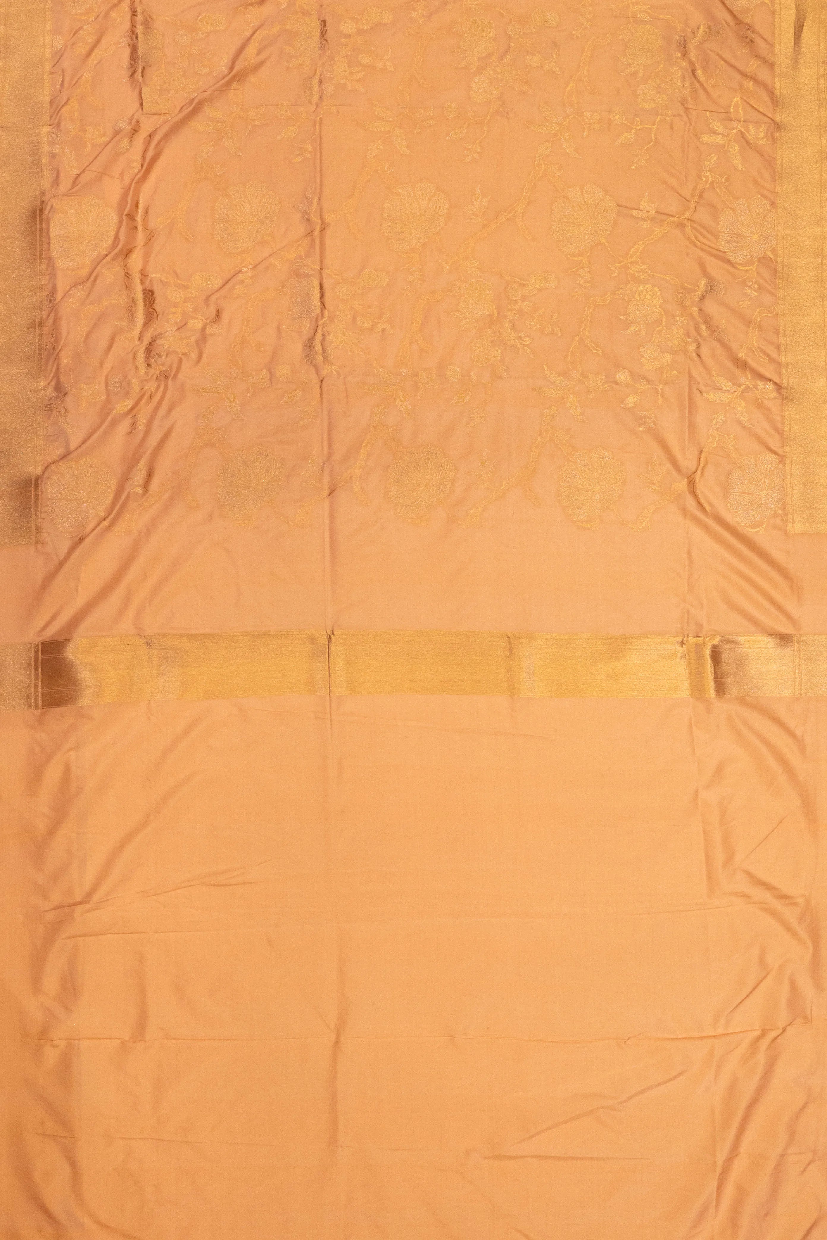 The saree is adorned with an exquisite gold and silver zari floral jaal pattern that dances gracefully across the peach silk, creating a mesmerizing blend of classic motifs and modern elegance