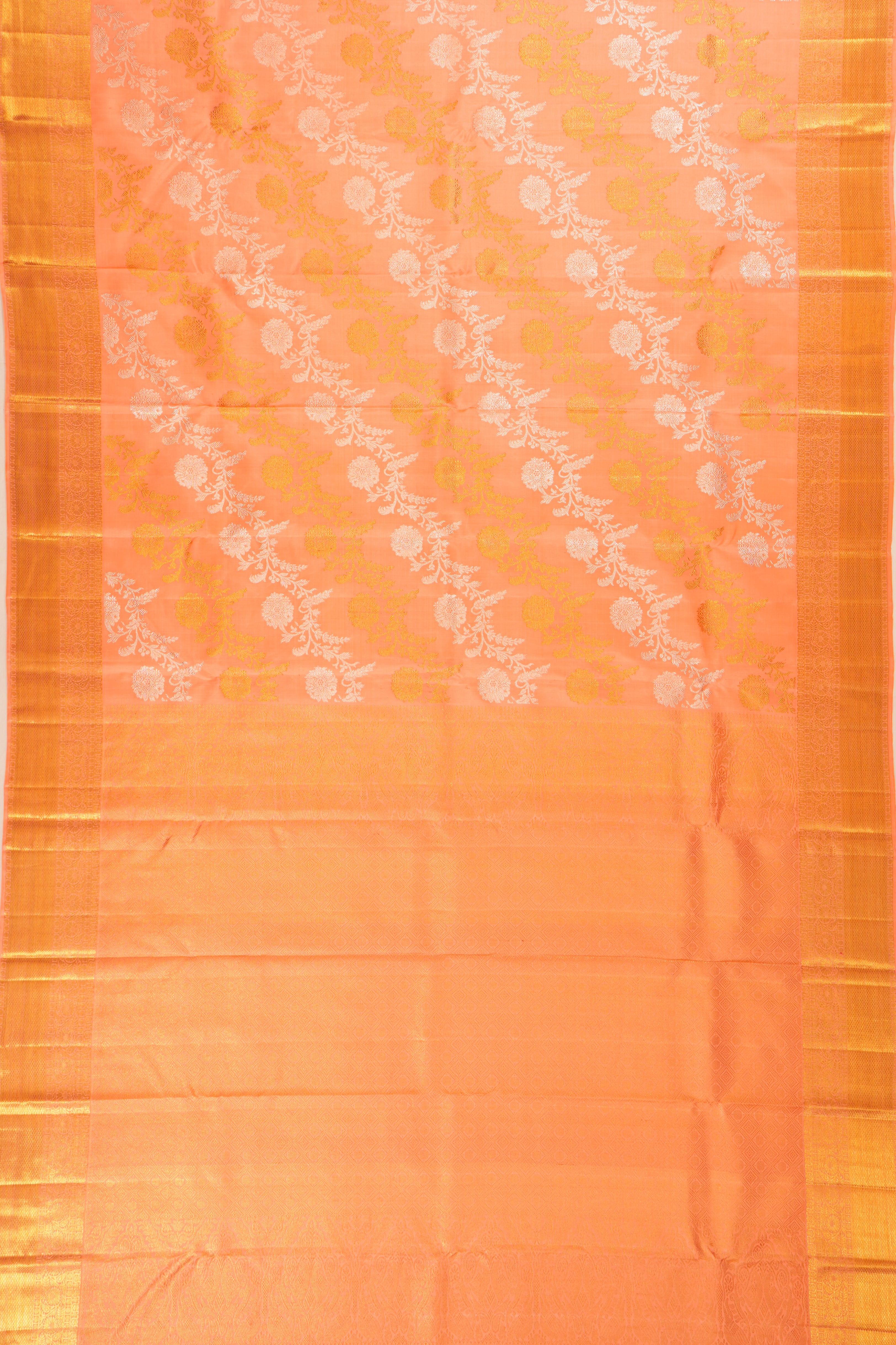 A captivating gold and silver zari floral jaal brocade spreads across a warm peach base, offering a perfect blend of vibrance and elegance.