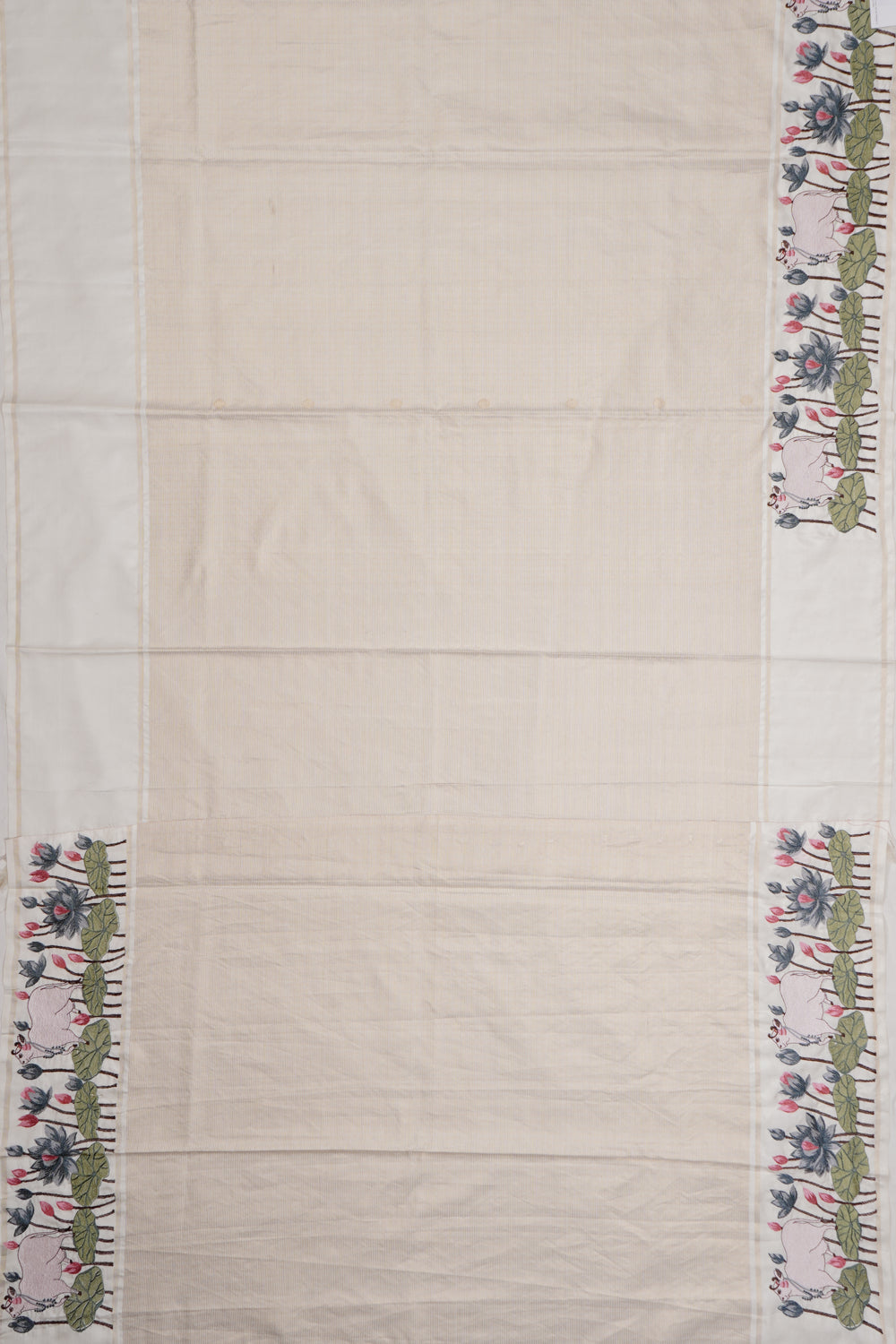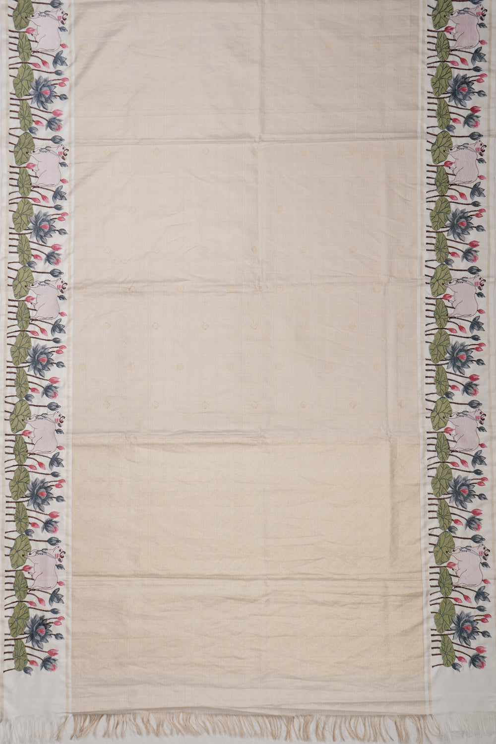 Banarasi Silk Checks And Butta White Saree With Pichwai Embroidery Border