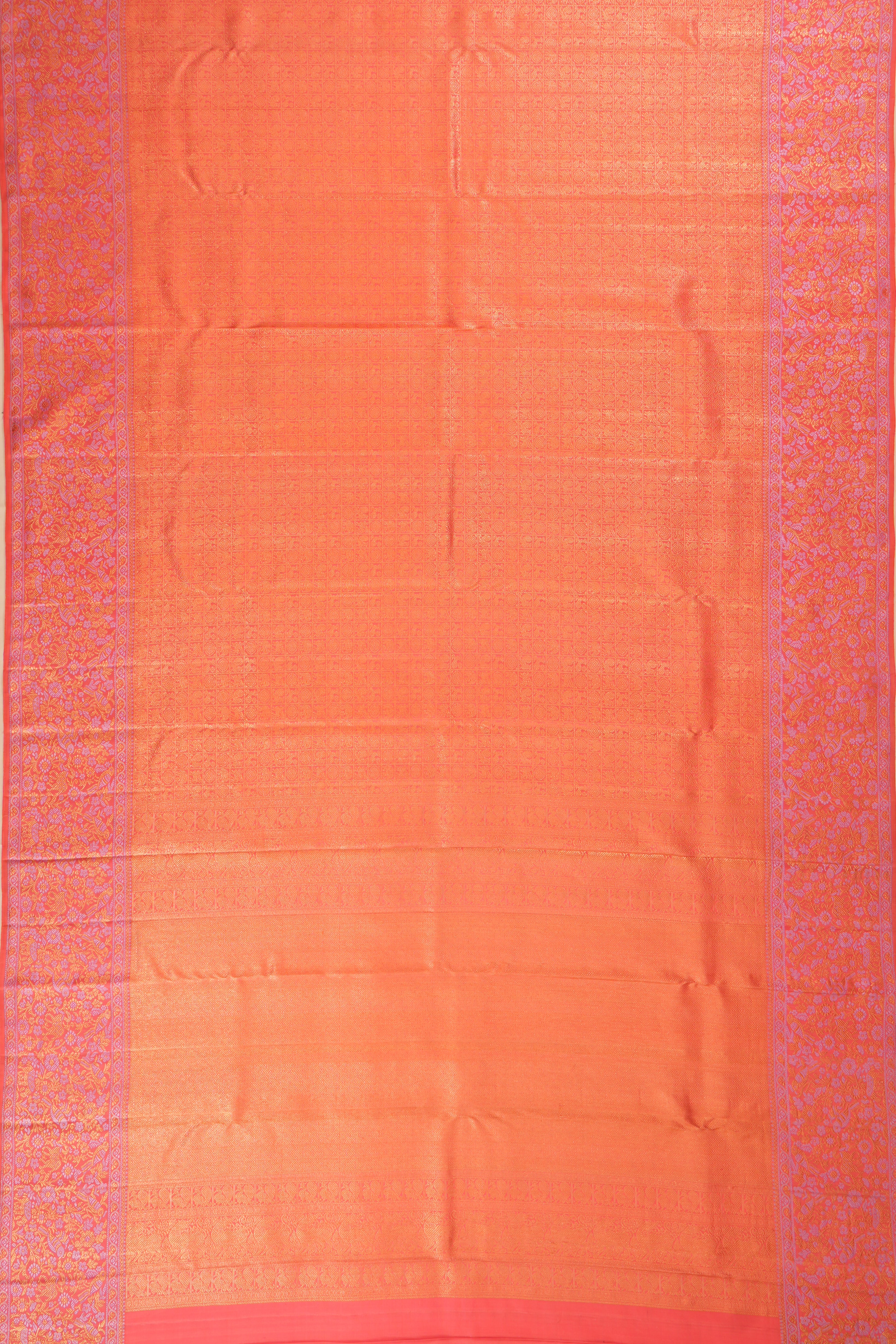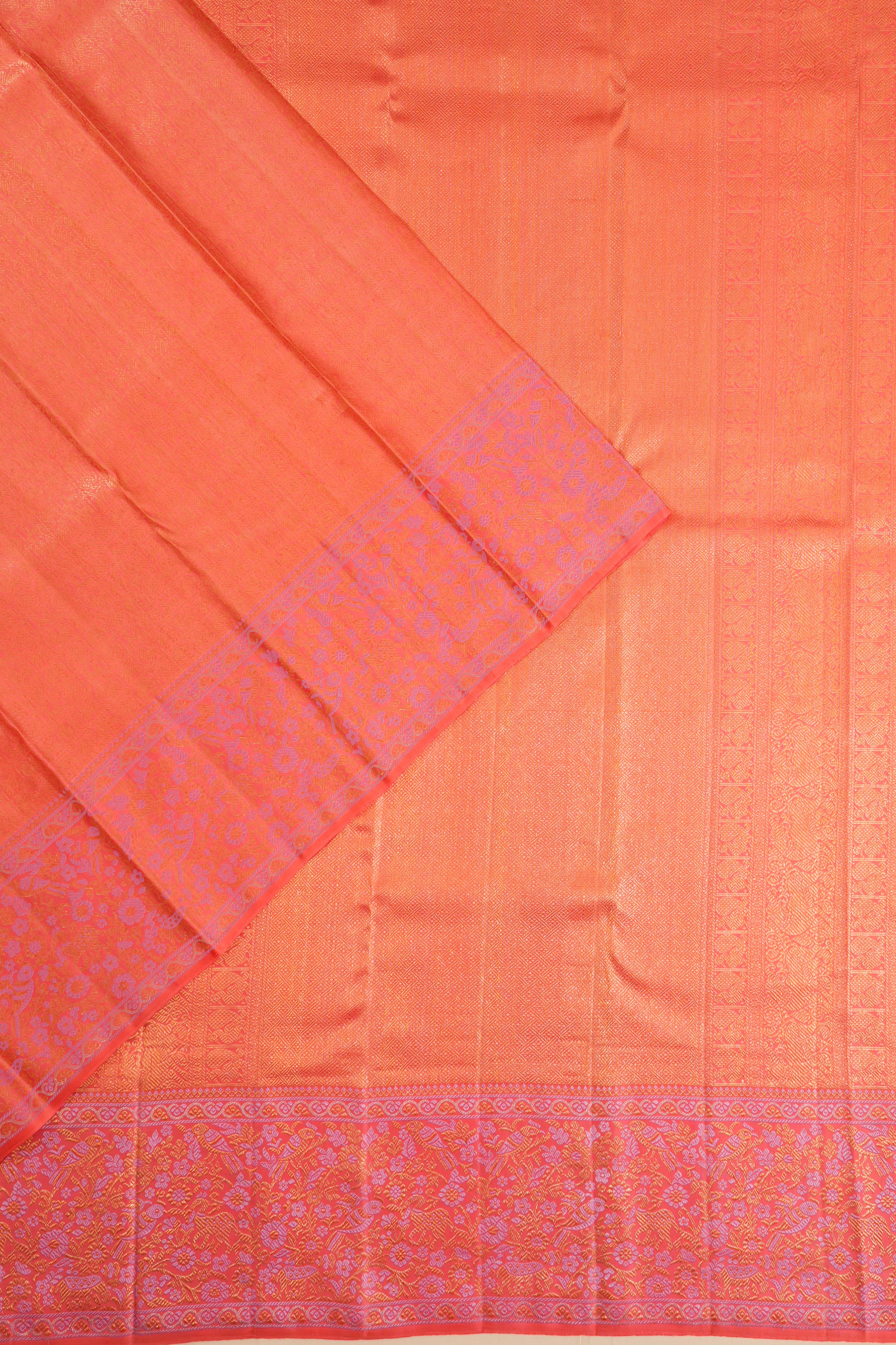 A self medium border in gold zari, detailed with floral patterns interspersed with animal motifs, lends a touch of mythological richness.