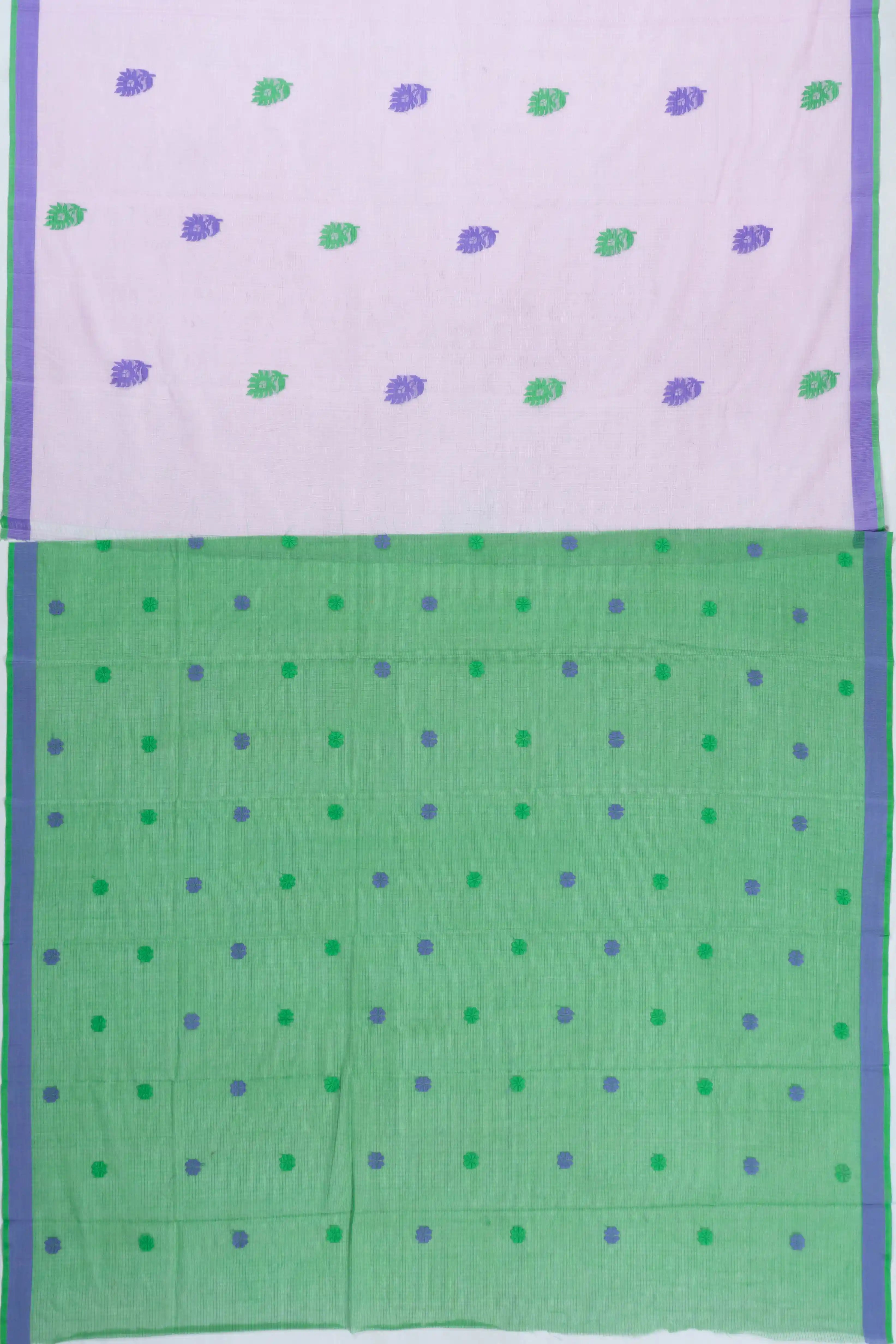 Accompanied by a complementary green blouse with floral buttas, this saree offers a refined and coordinated appearance