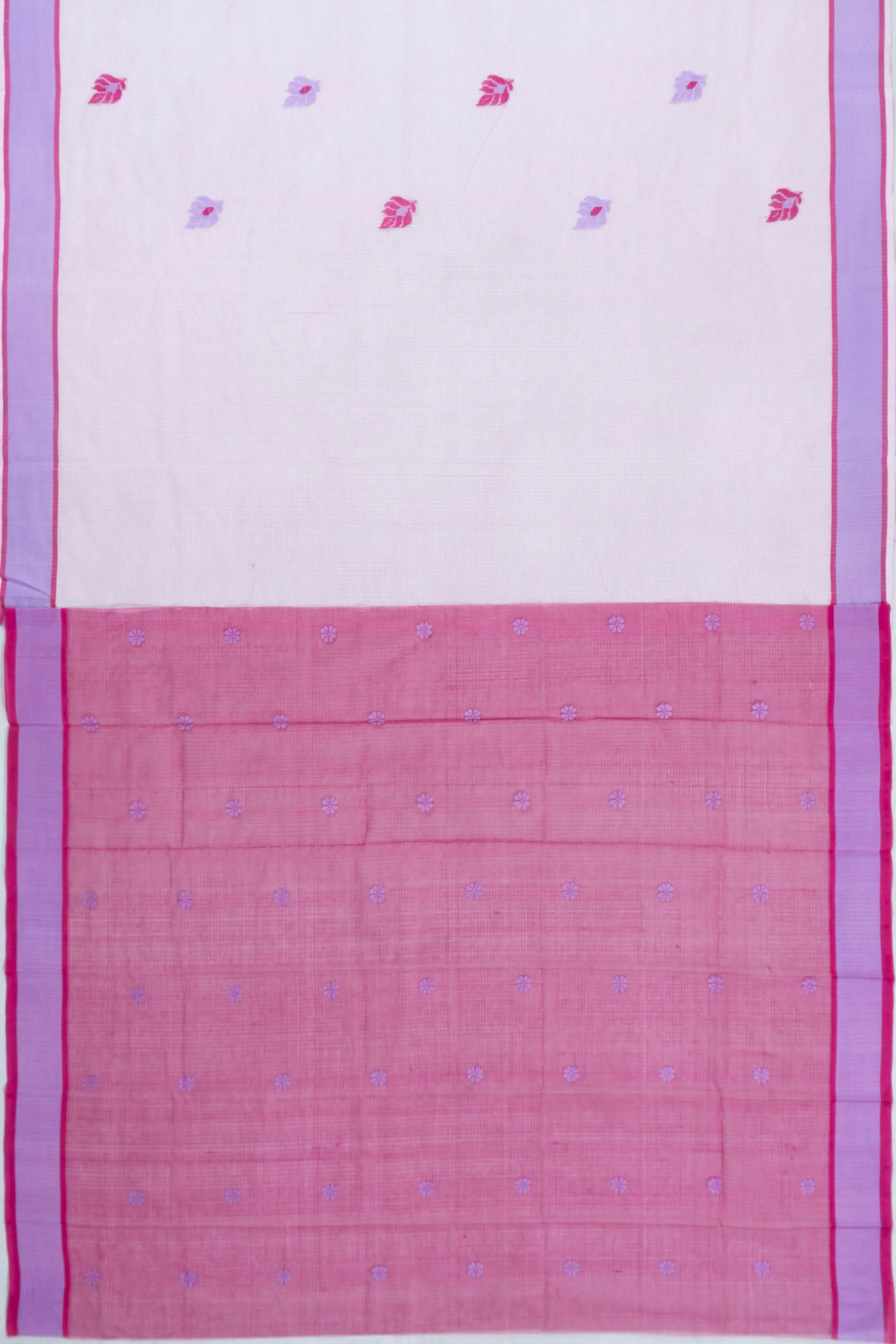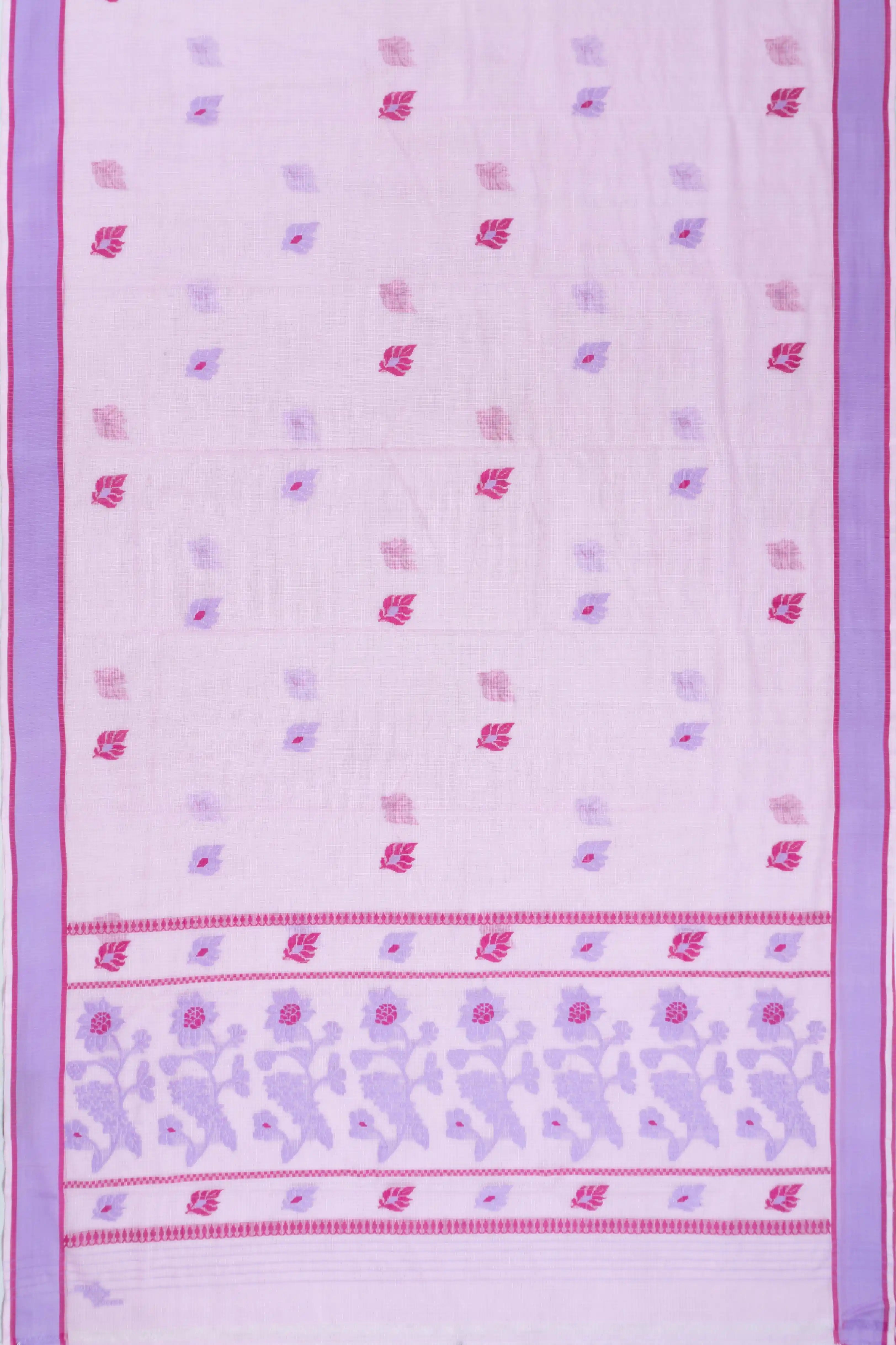 Its contrast lavender border, featuring subtle horizontal lines, adds a modern touch while enhancing the saree’s classic charm