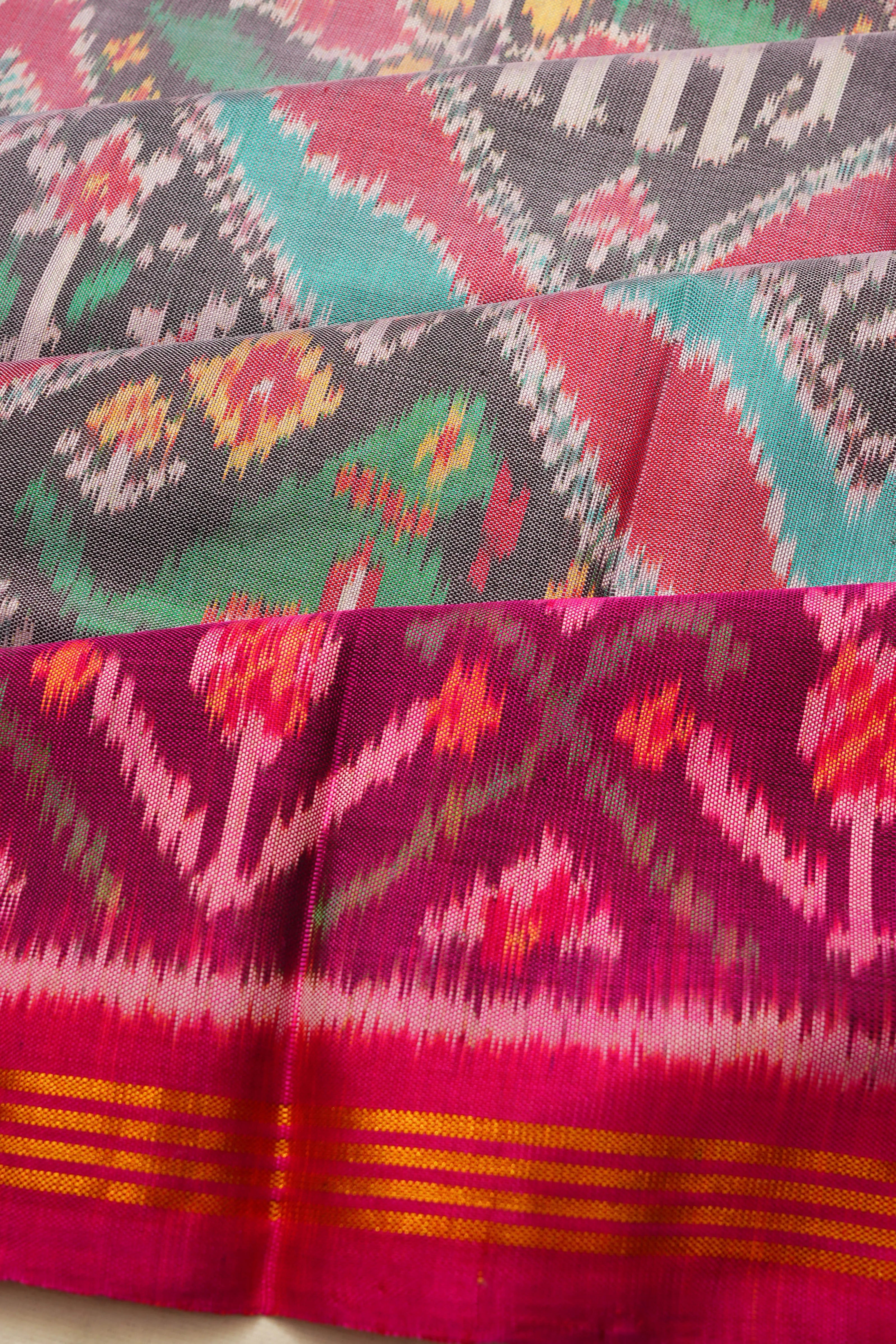The contrast floral Ikat pink medium border, featuring horizontal lines, complements the motifs and adds a bold touch to the saree.