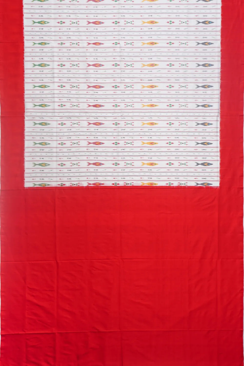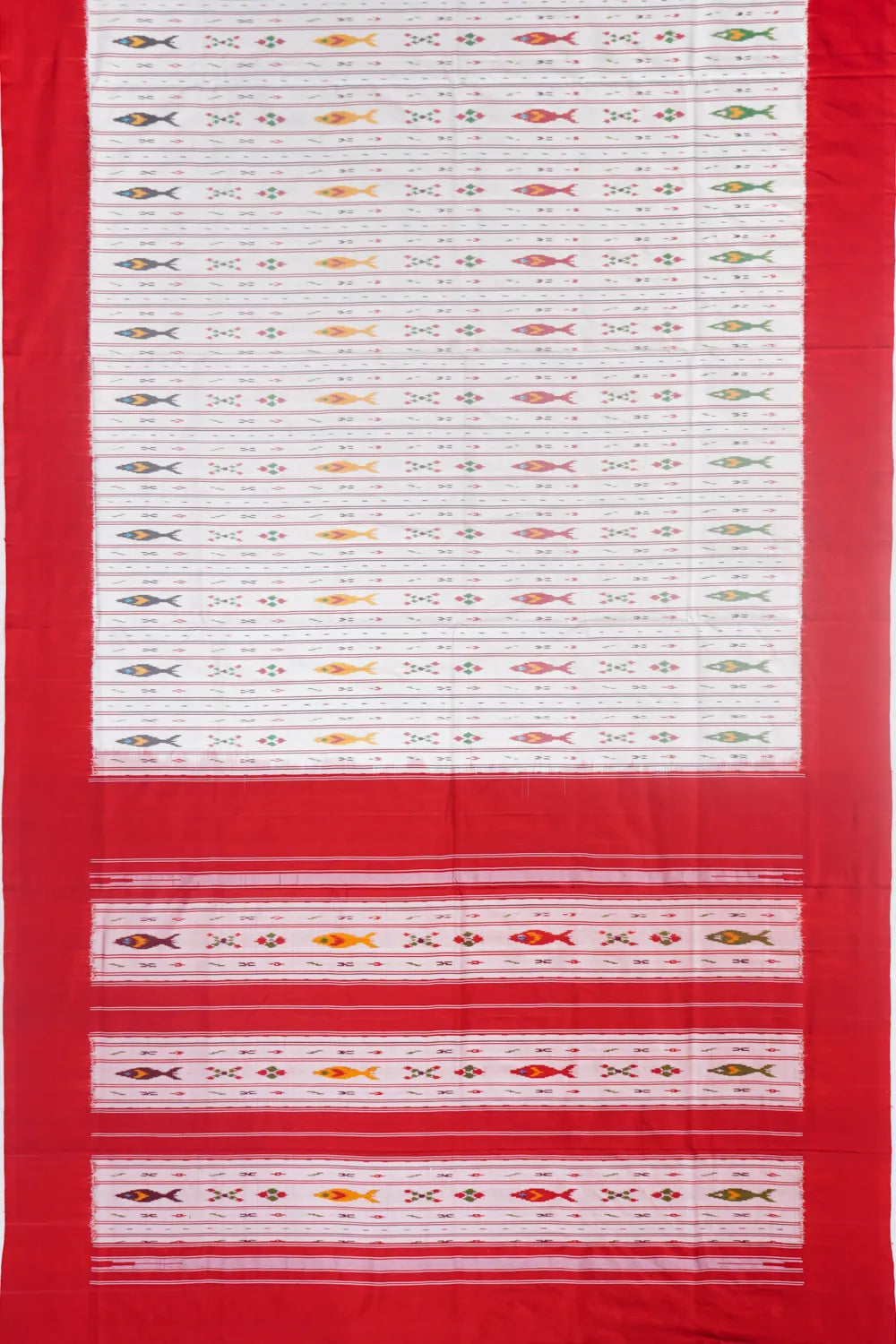 The pallu, with its contrasting ikat vertical lines and fish motifs, mirrors the intricate detailing of the saree body