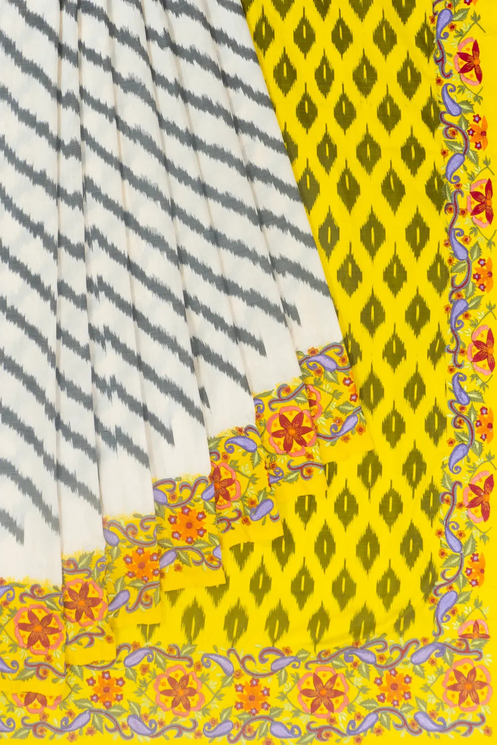 Pochampally Silk Ikat White Saree WIth Embroidery Border