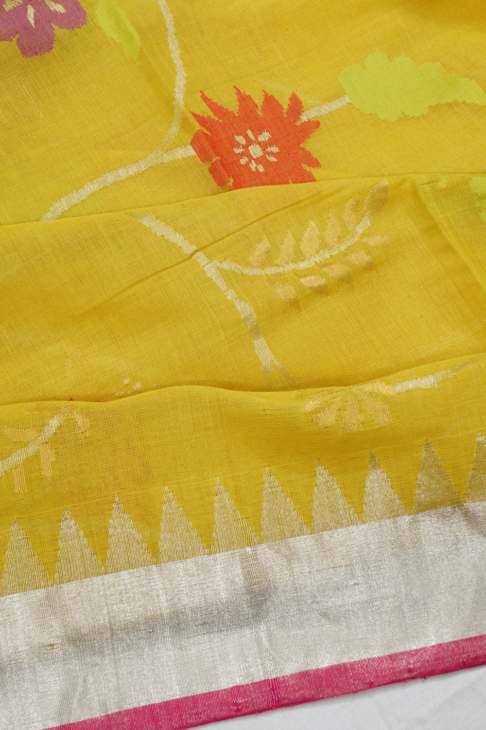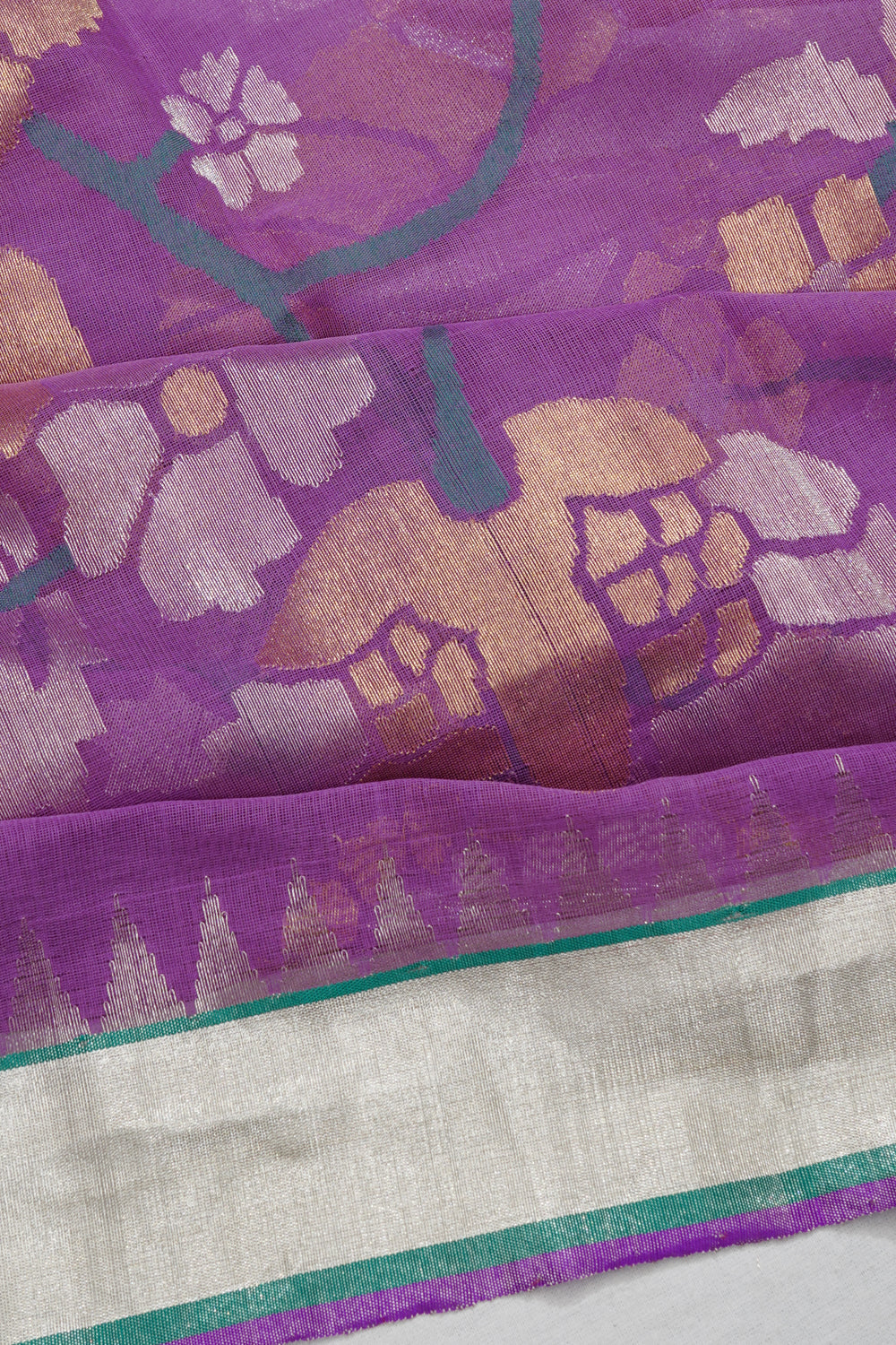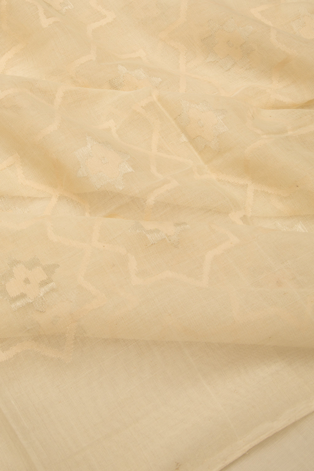 Jamdani is a labor-intensive technique where weavers hand-lift individual warp threads to create designs based on paper patterns beneath the loom. This creates intricate motifs that are woven into the fabric, not printed or embroidered. All-over jamdani Ponduru sarees can take weeks to complete.