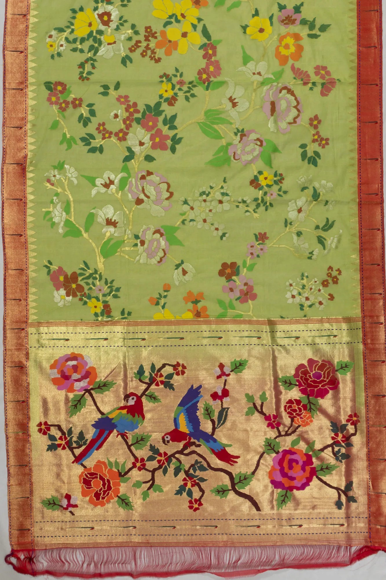 Ponduru Handspun Cotton All Over Jamdani Green Saree With Paithani Muniya Border