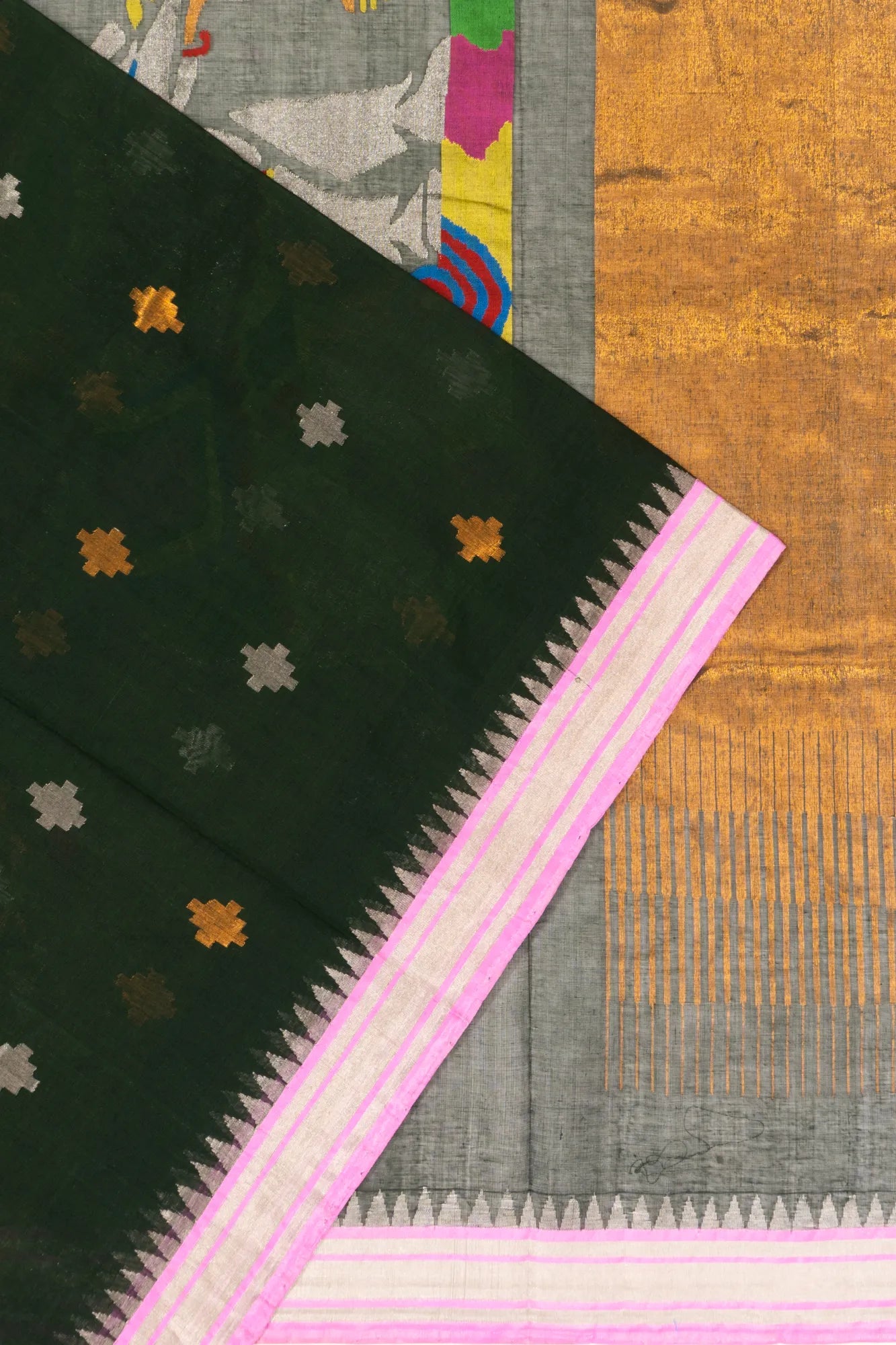 Ponduru Handspun Cotton Butta Bottle Green Saree With Jamdani Pallu