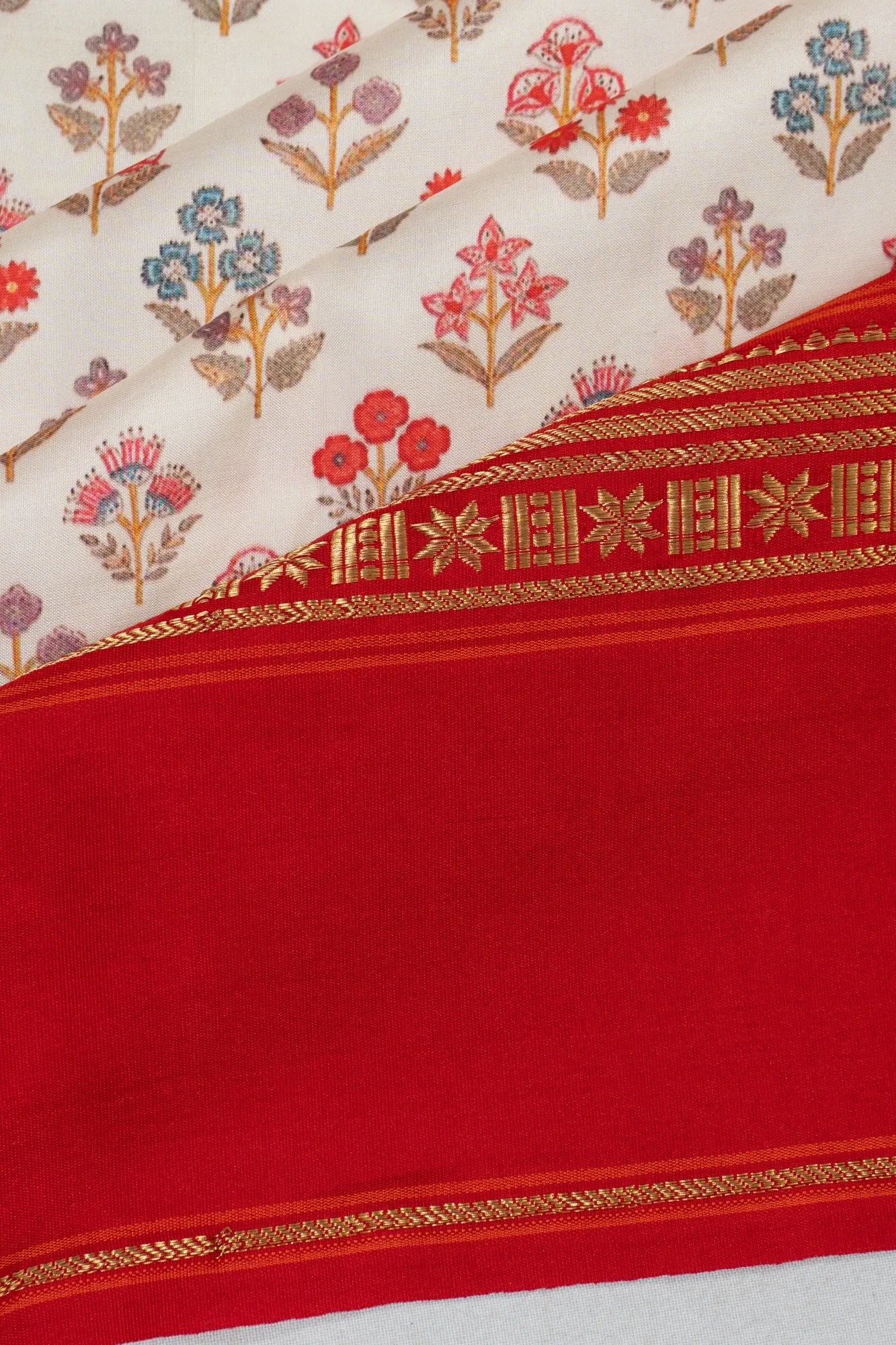Accentuated by a striking contrast, the medium red border features gold zari floral brocade, creating a harmonious blend of colors and textures