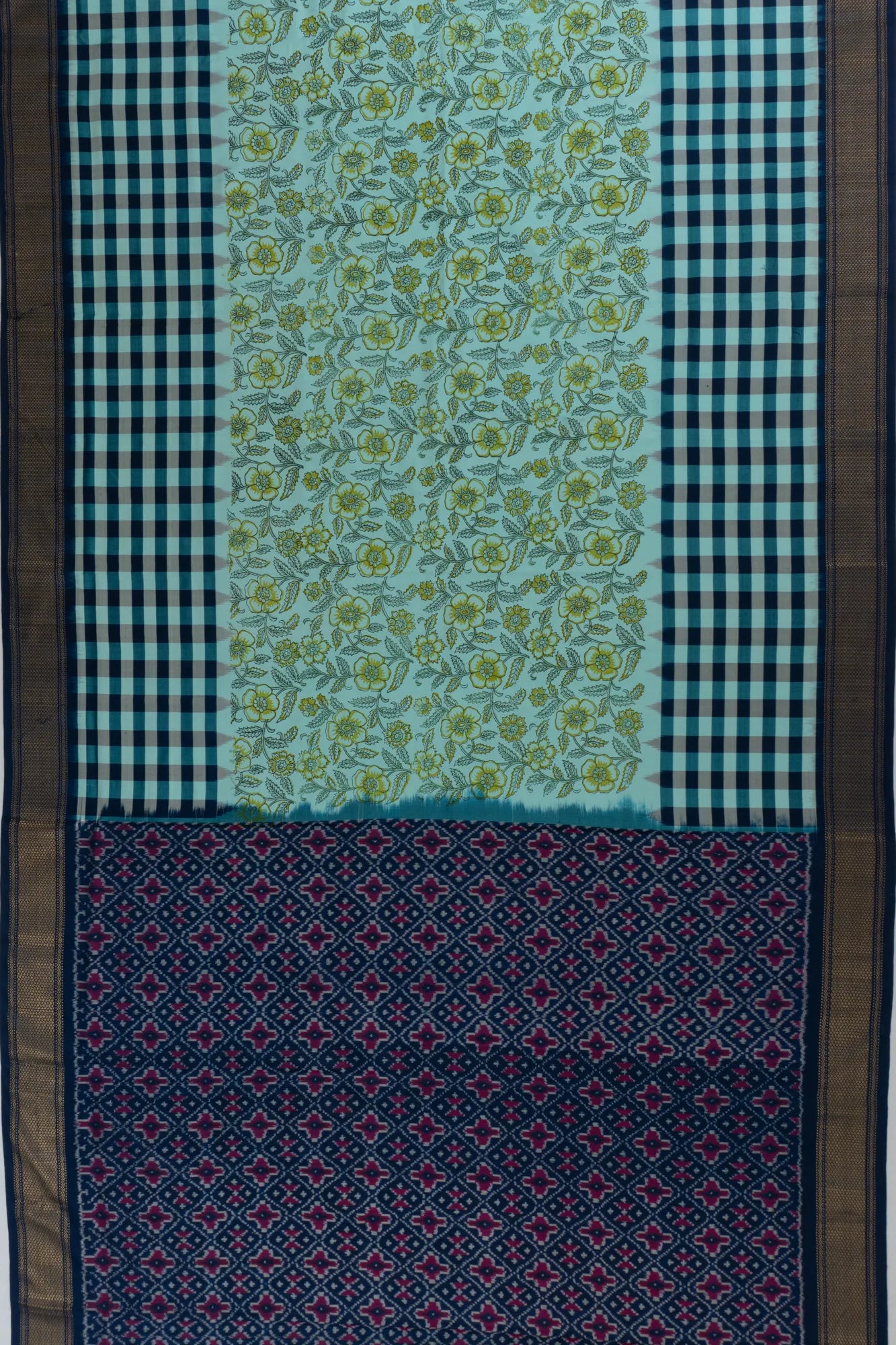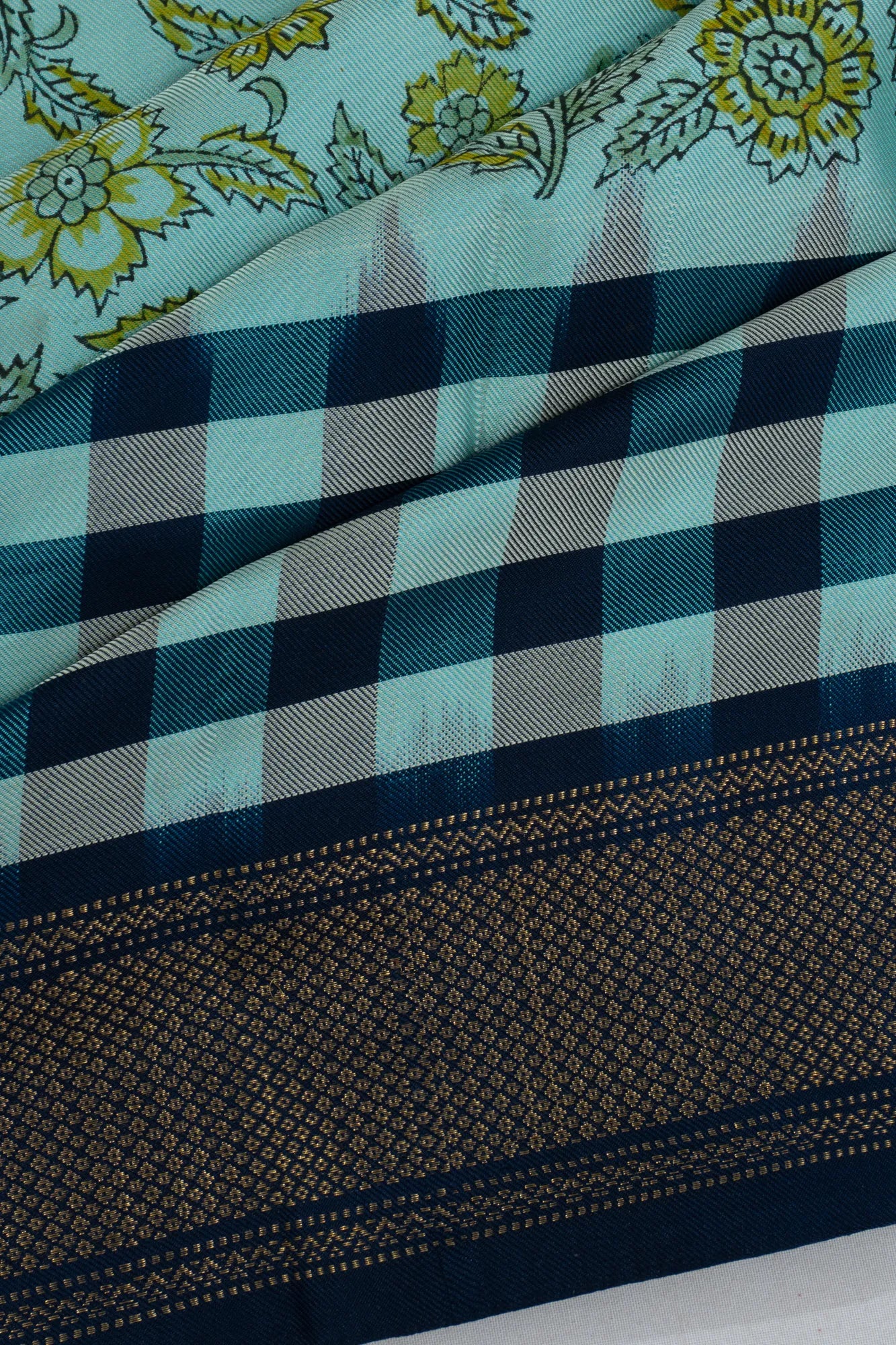 The saree's body is adorned with delicate floral prints intertwined with subtle checks on its pleats, creating a visual symphony that captivates and enchants