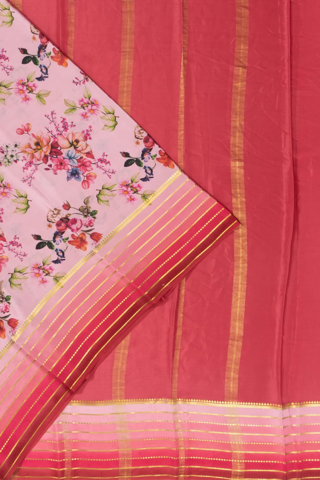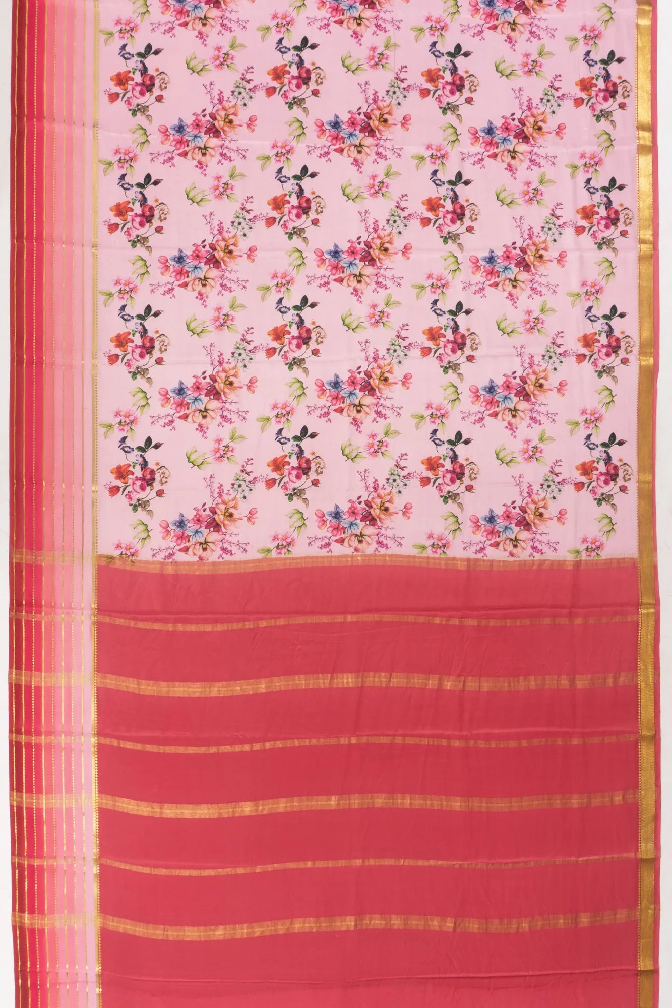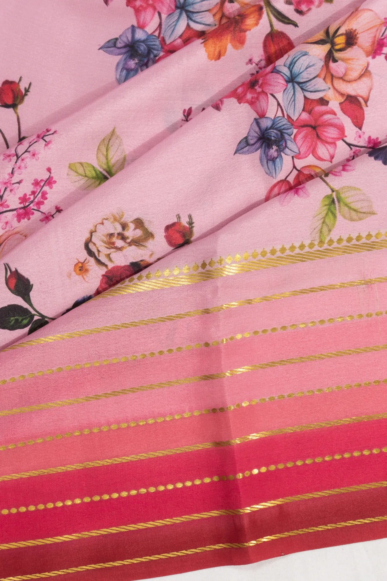Set against a gentle baby pink backdrop, the saree is adorned with floral prints that evoke a soft and elegant charm.