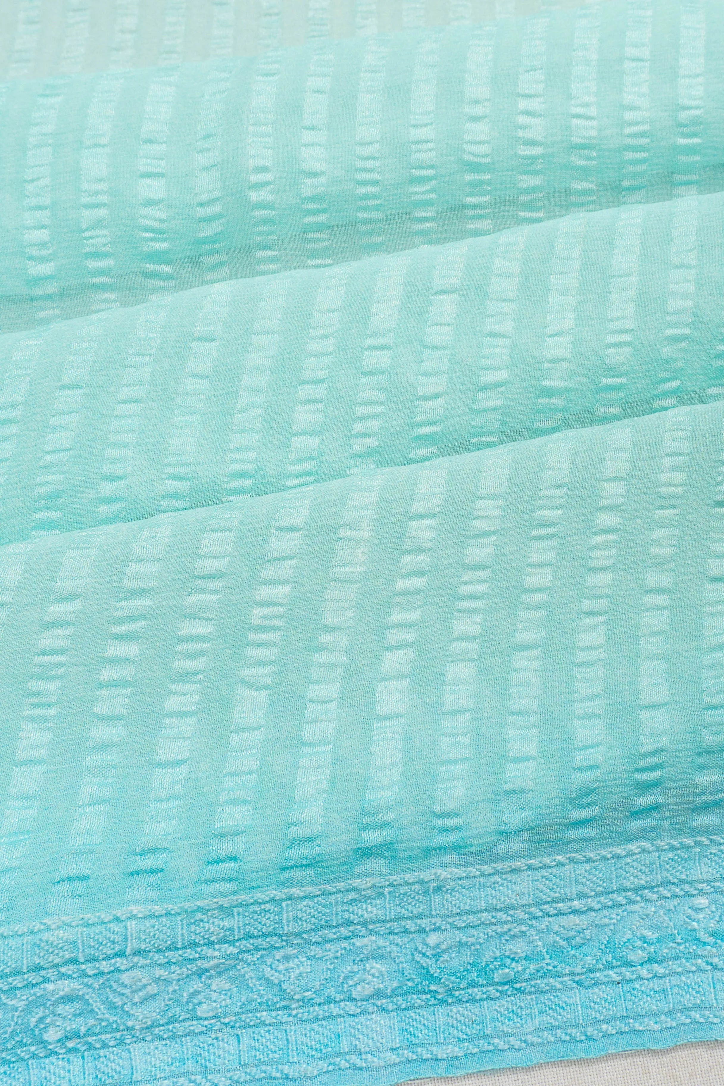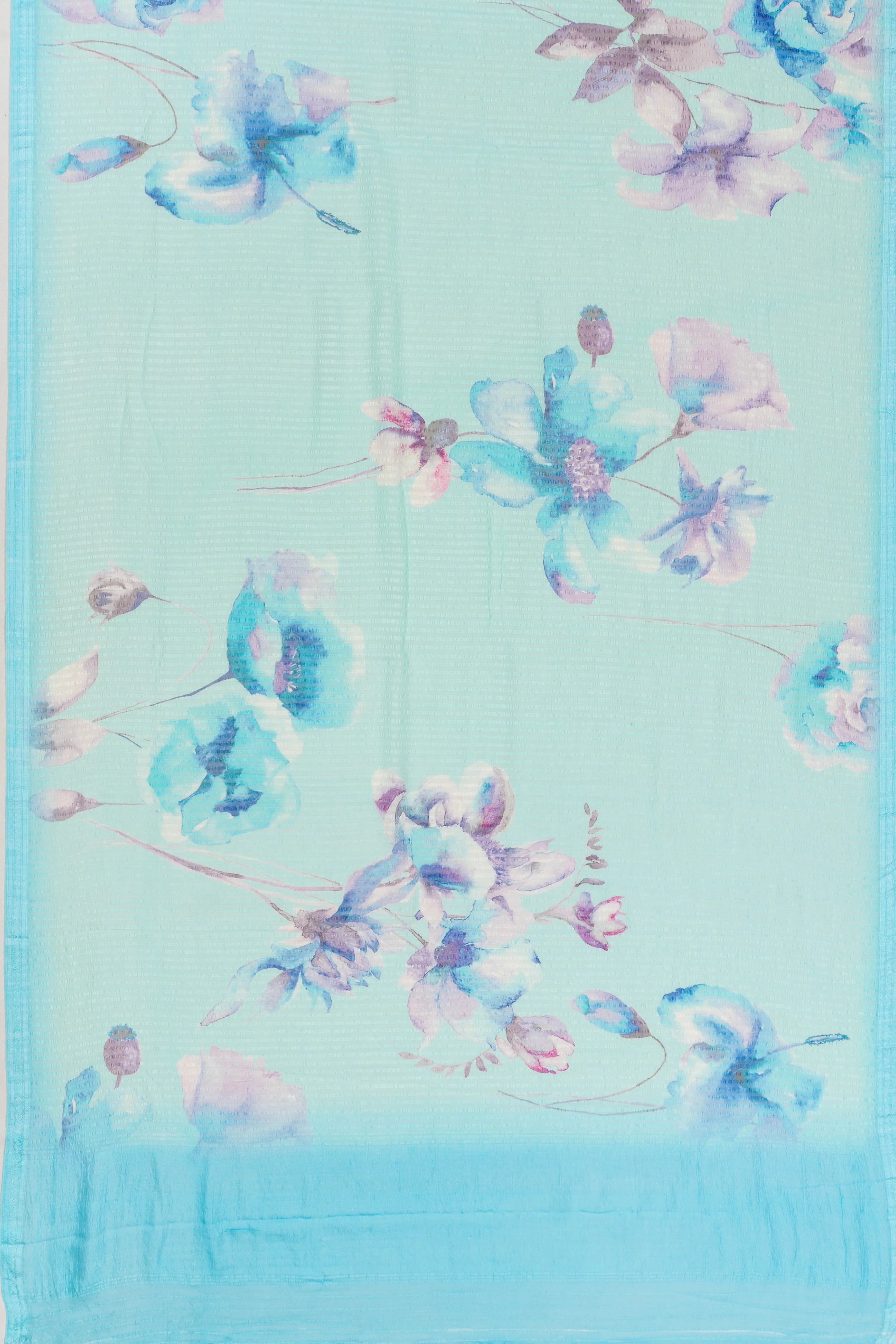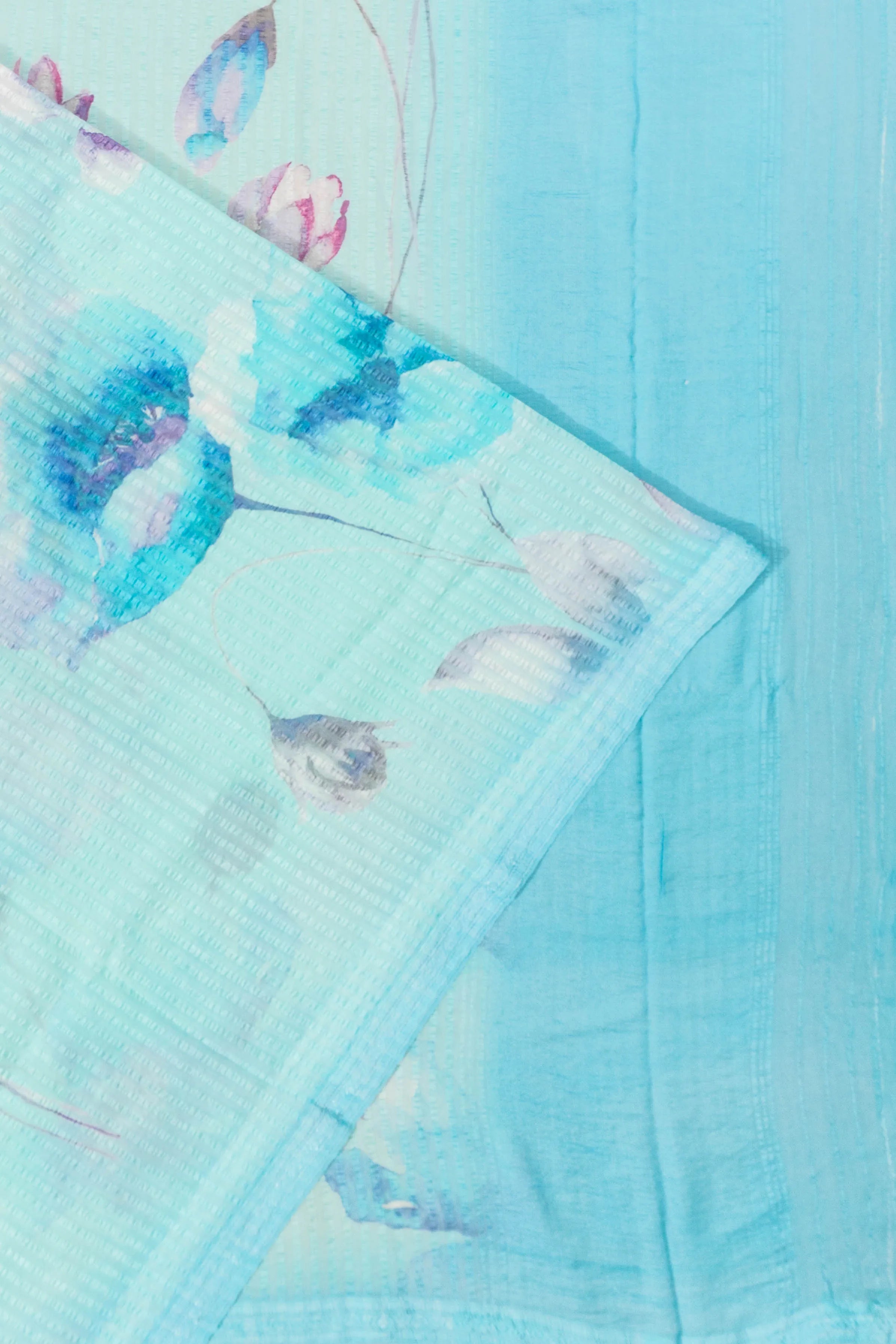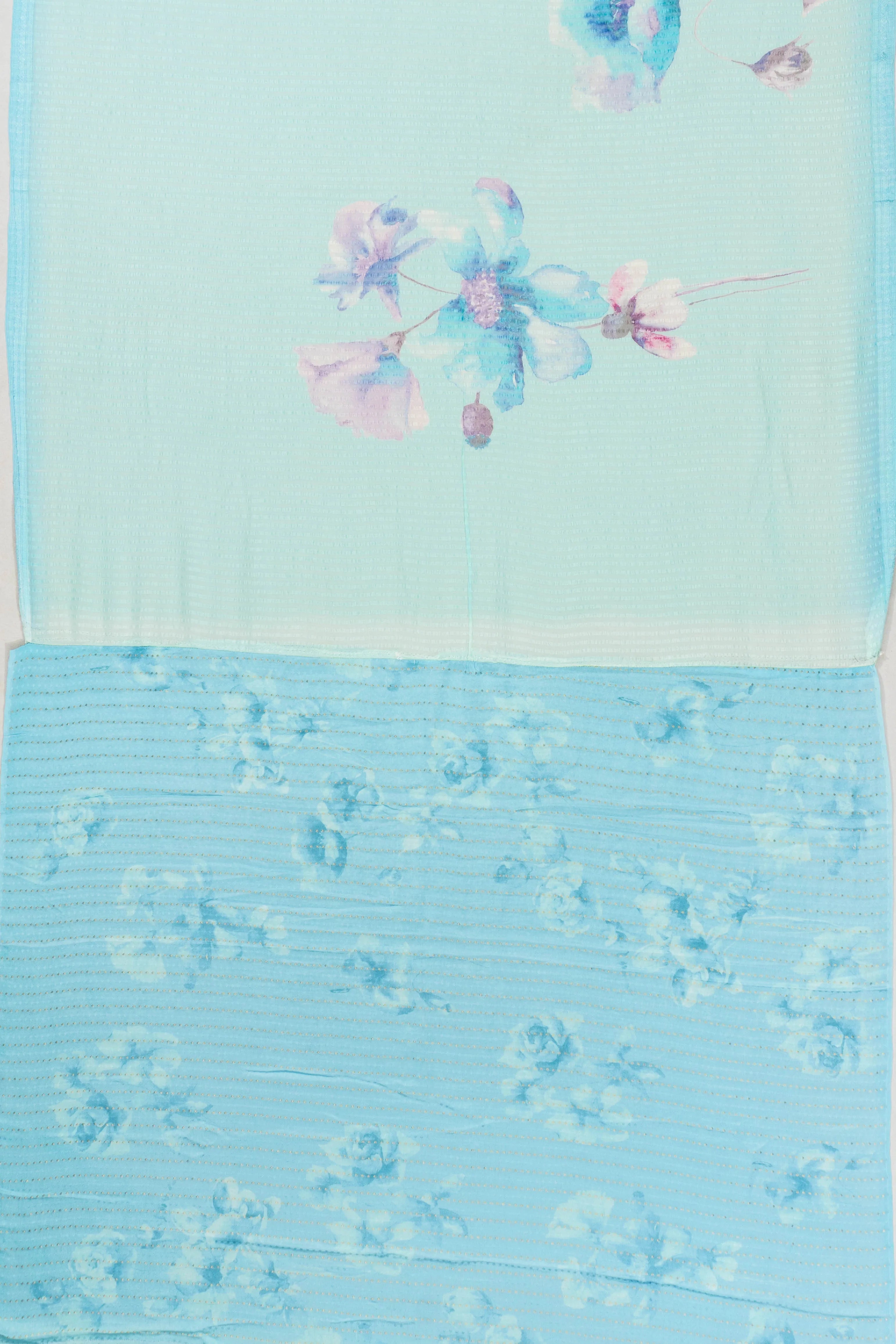 Chiffon Georgette Vertical Lines And Floral Printed Sea Blue Saree