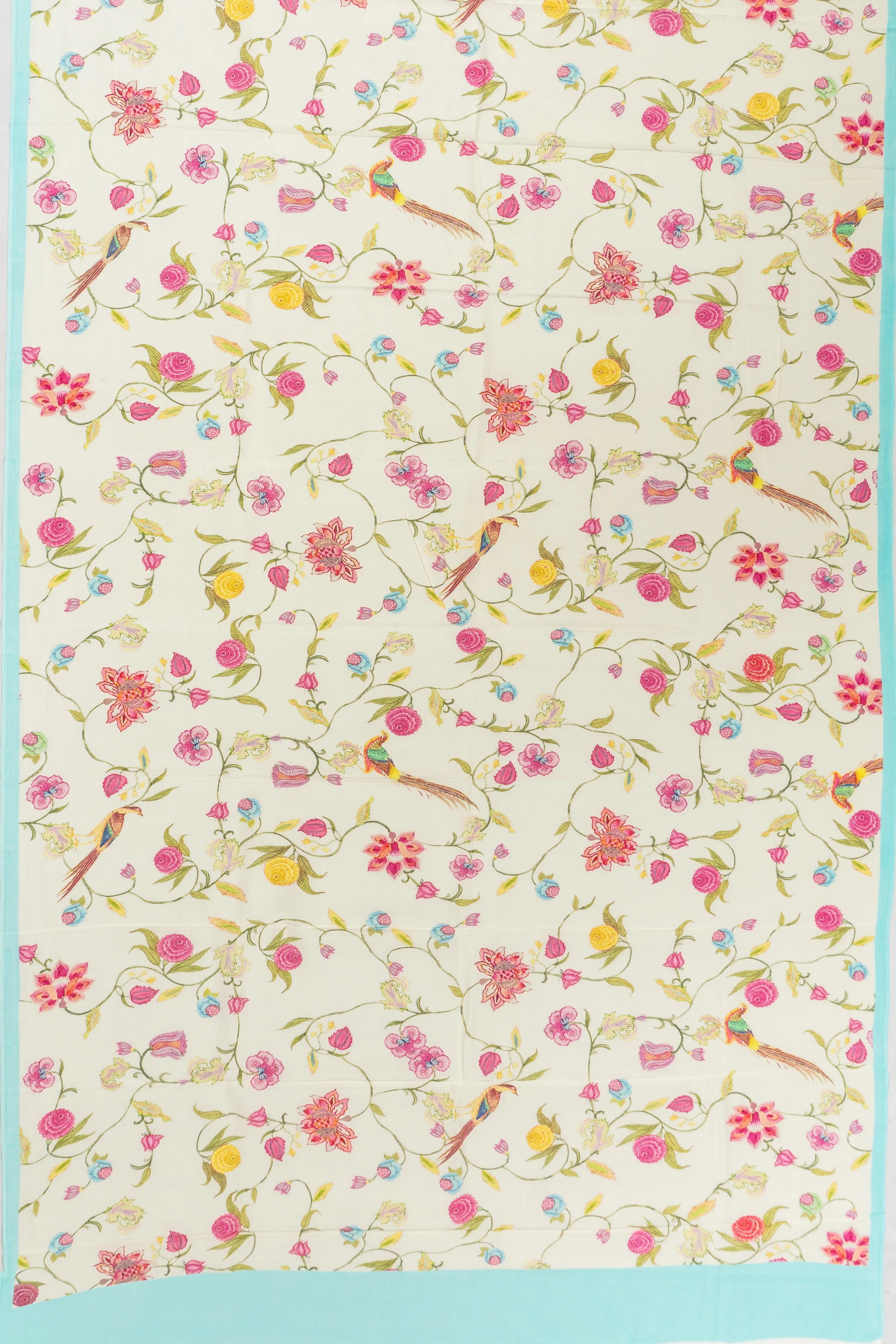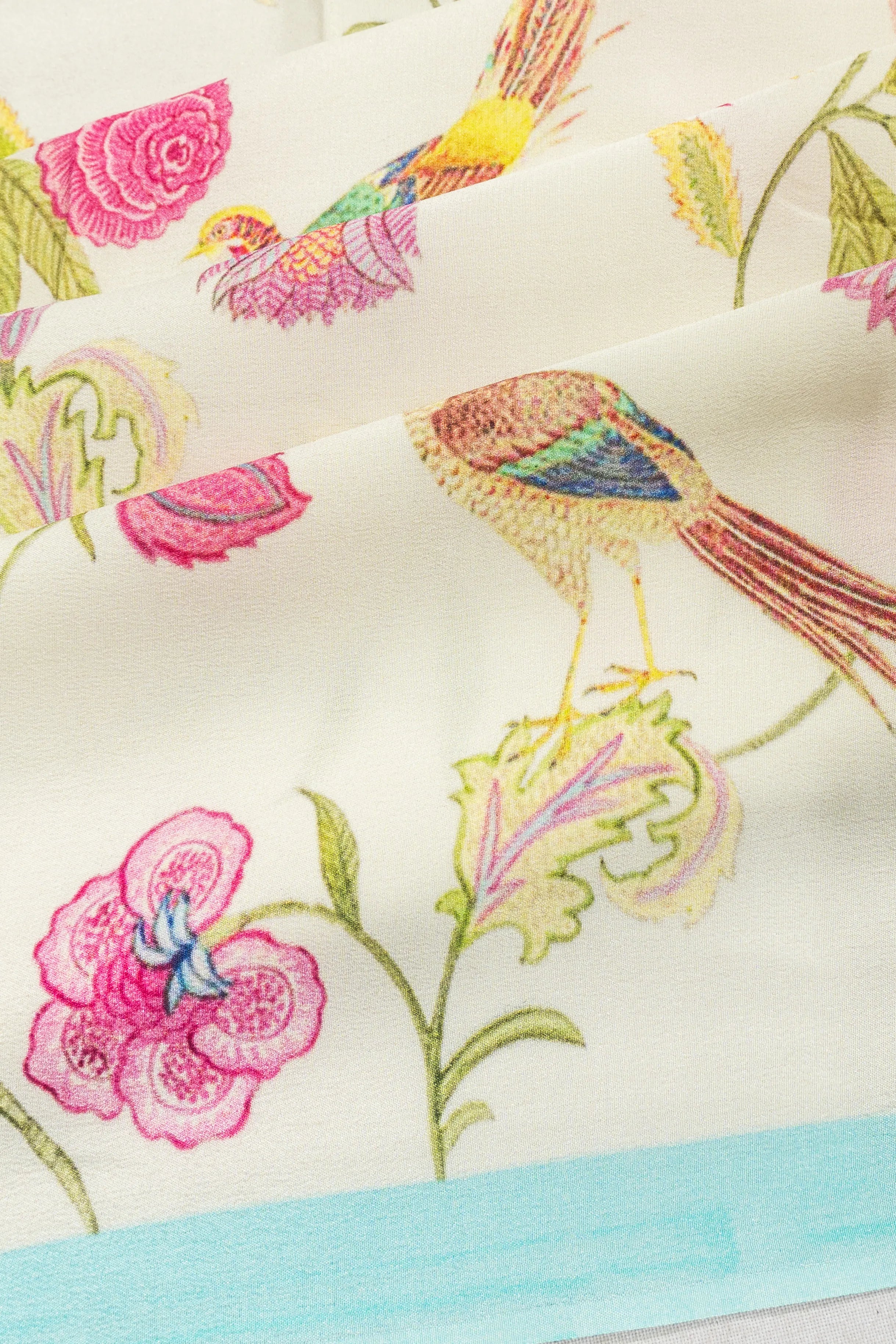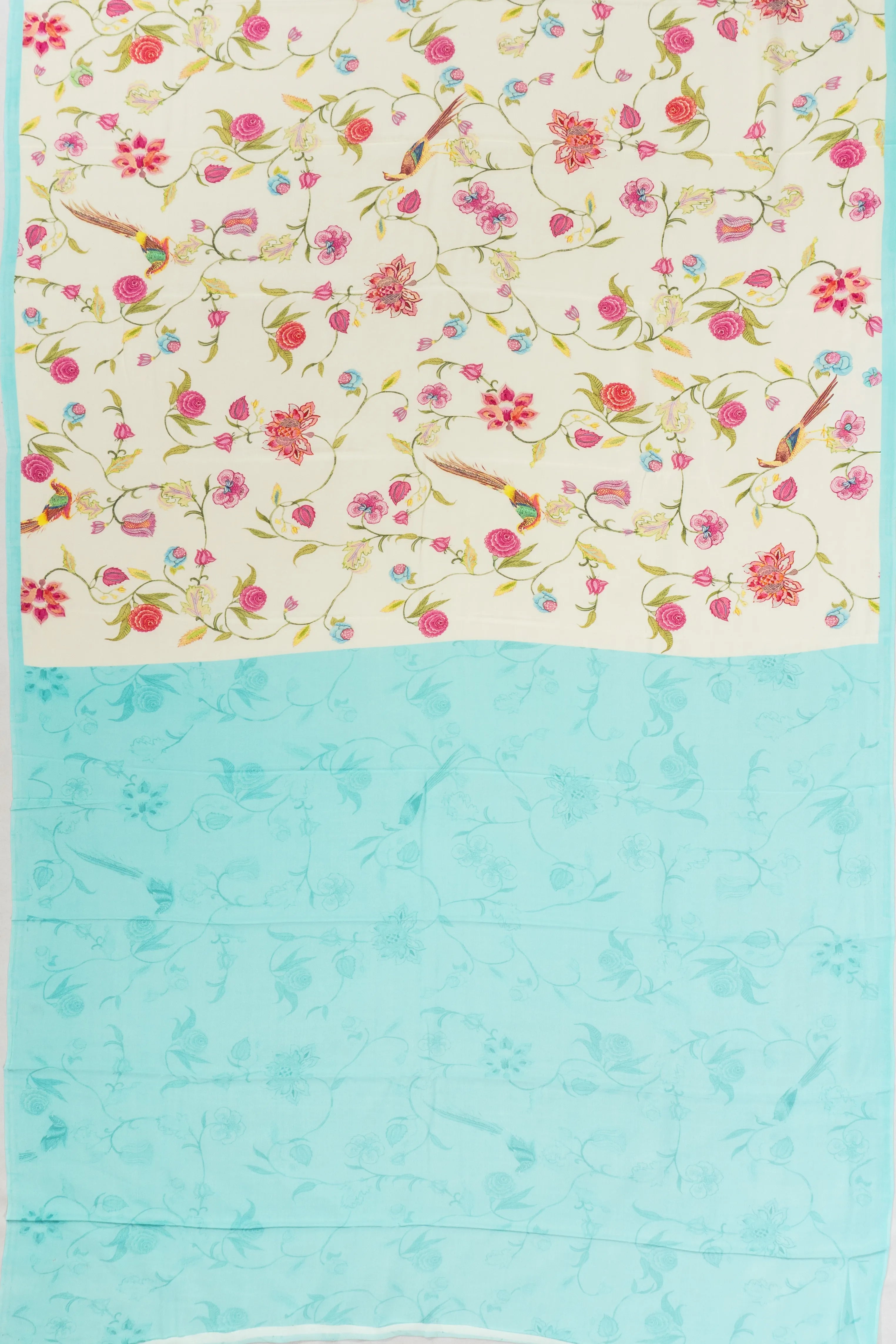 The pallu carries forward the theme with a self-printed floral vine and bird motif, showcasing meticulous artistry and cultural richness