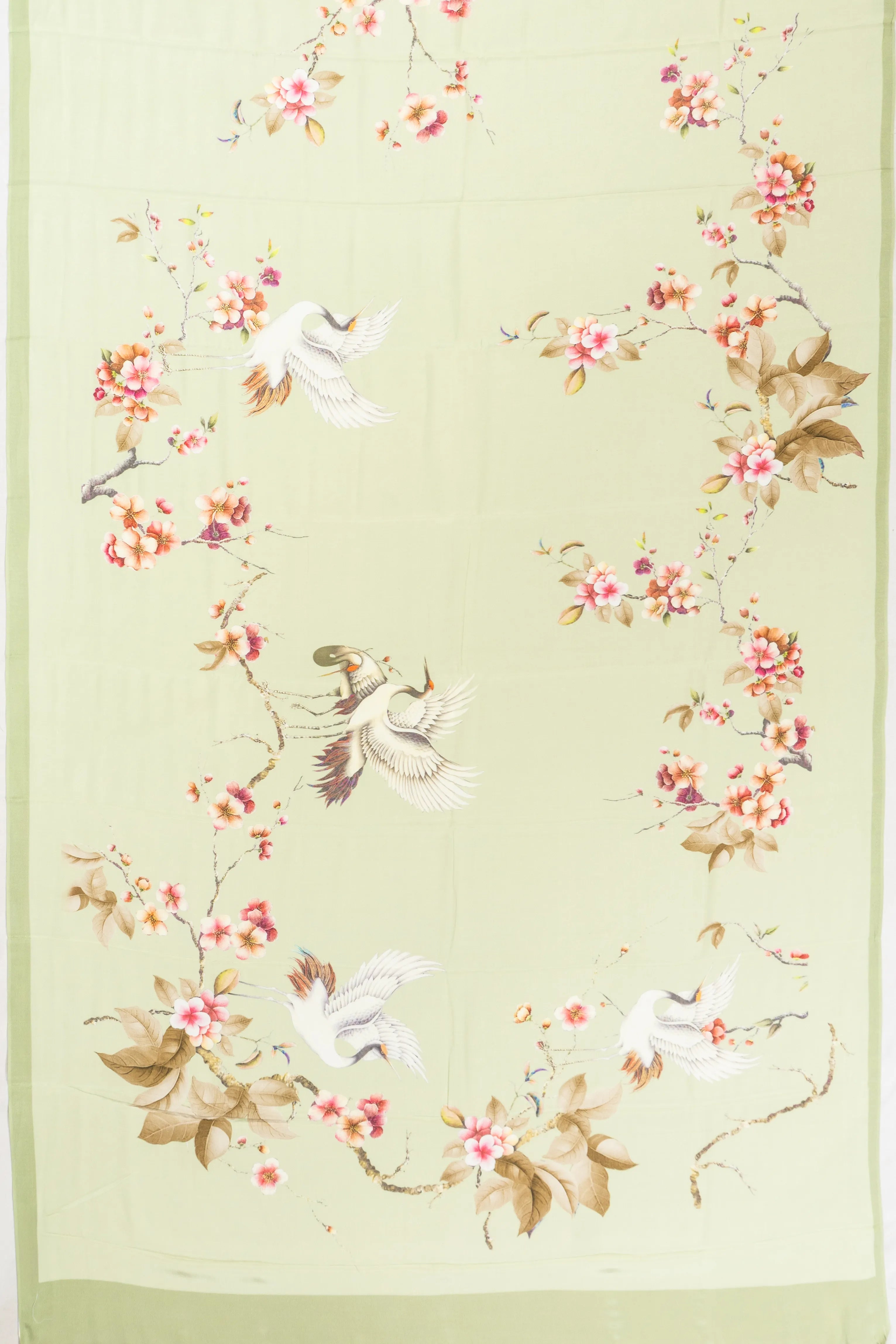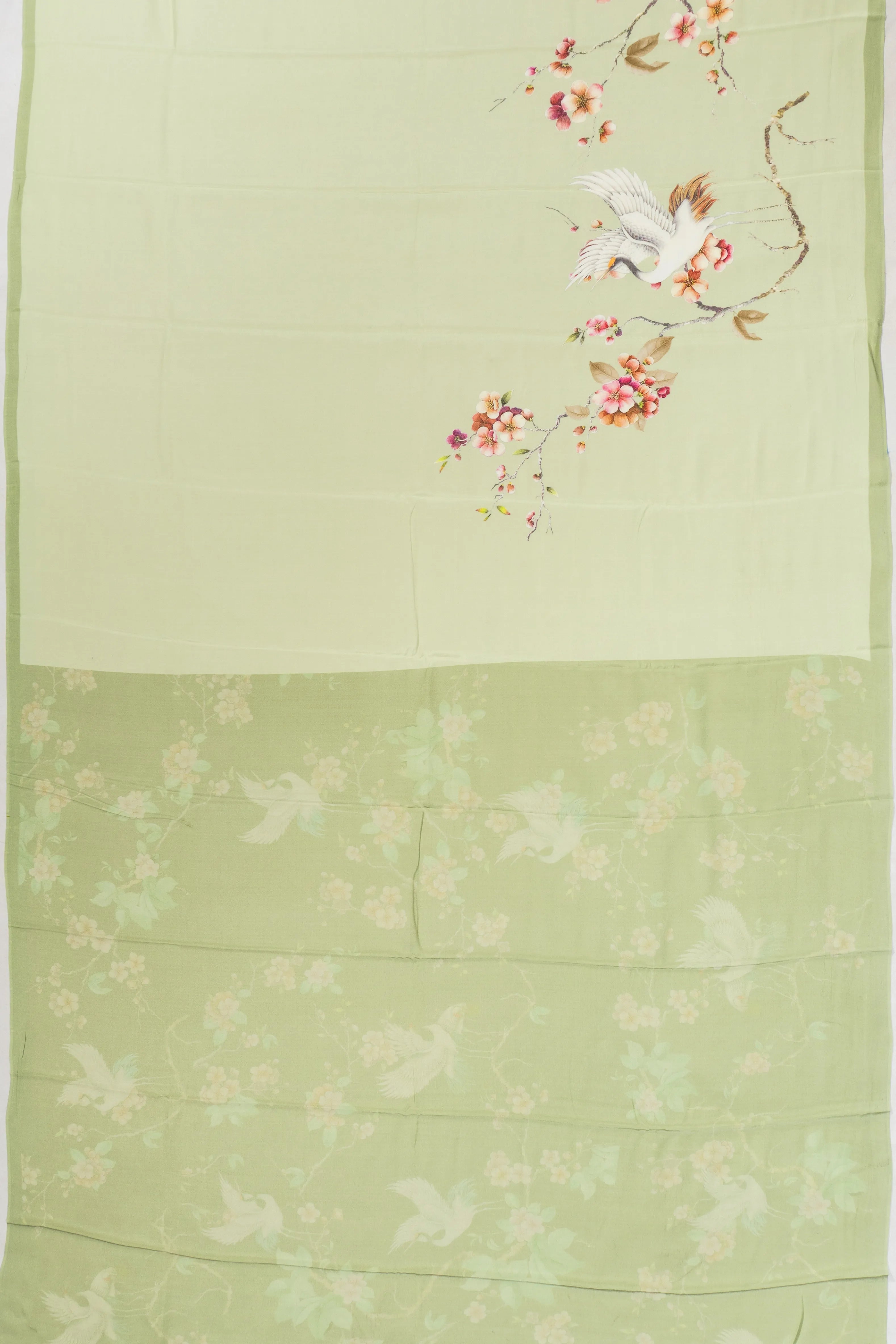 The self-printed pallu, adorned with floral vine and crane motifs, adds a layer of sophistication, making it a perfect choice for those who appreciate timeless craftsmanship