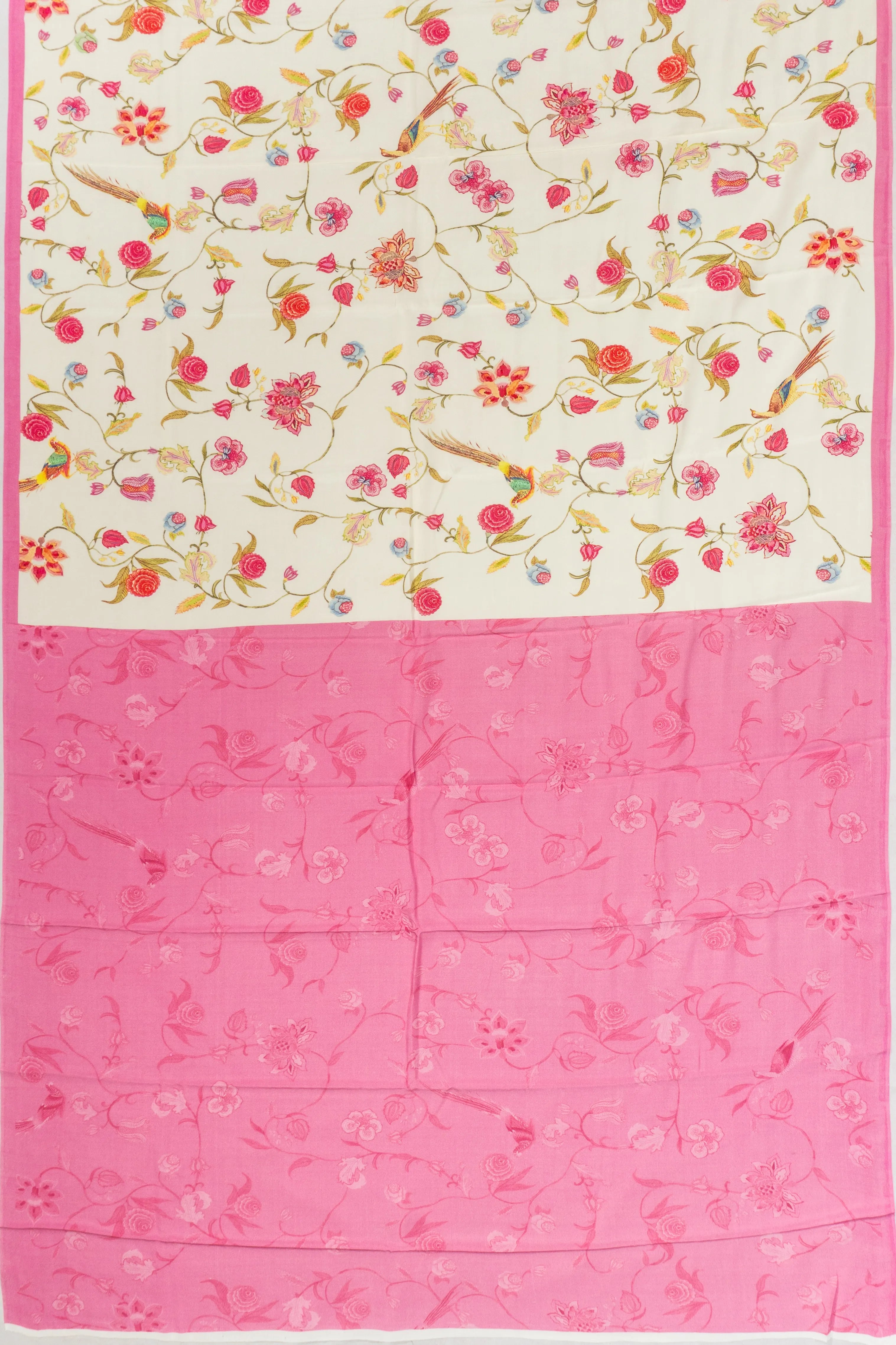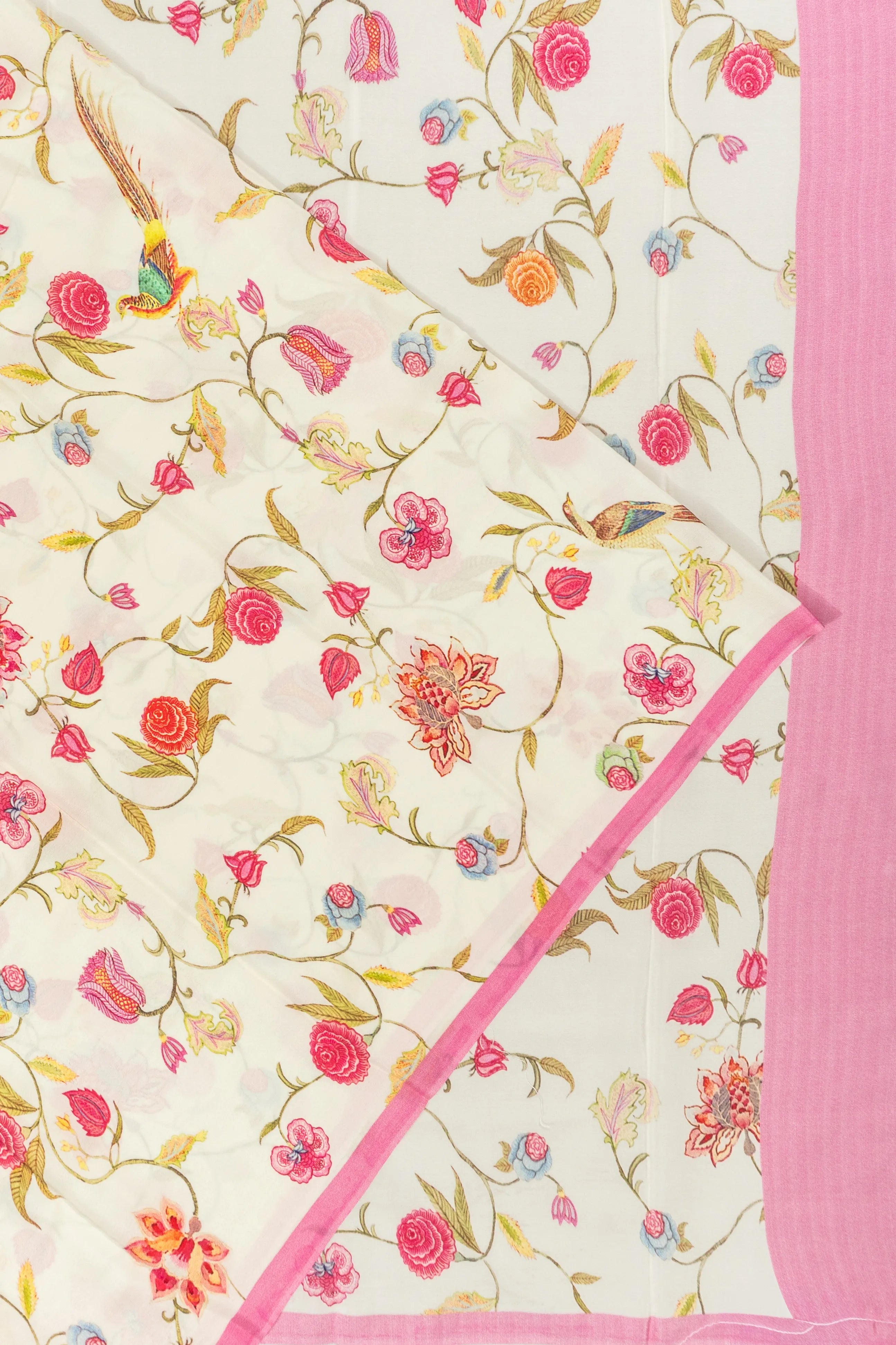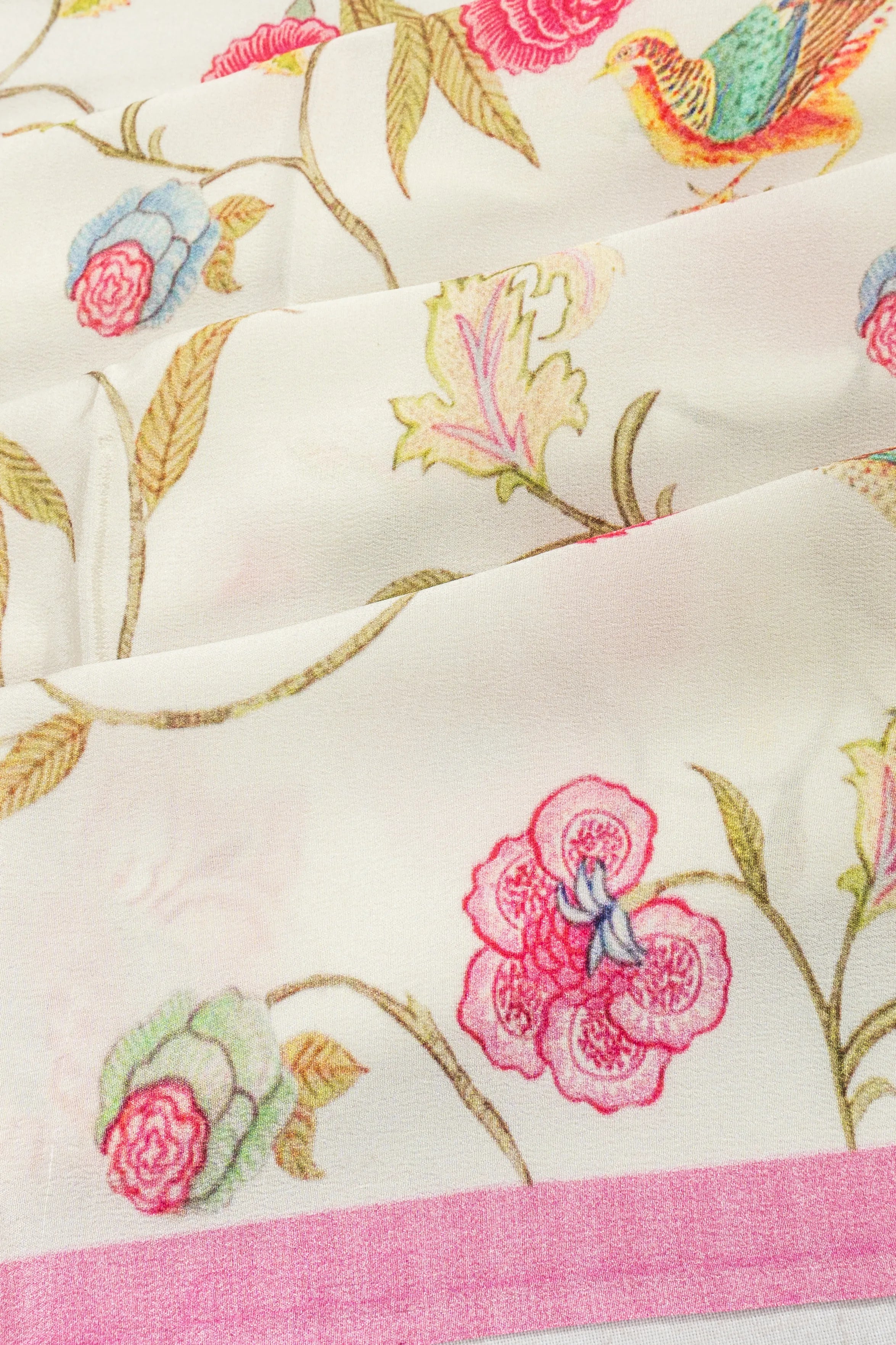 Paired with a coordinated pink blouse featuring floral vine and peacock motif prints, this saree is perfect for those who appreciate the fusion of classic charm and modern elegance