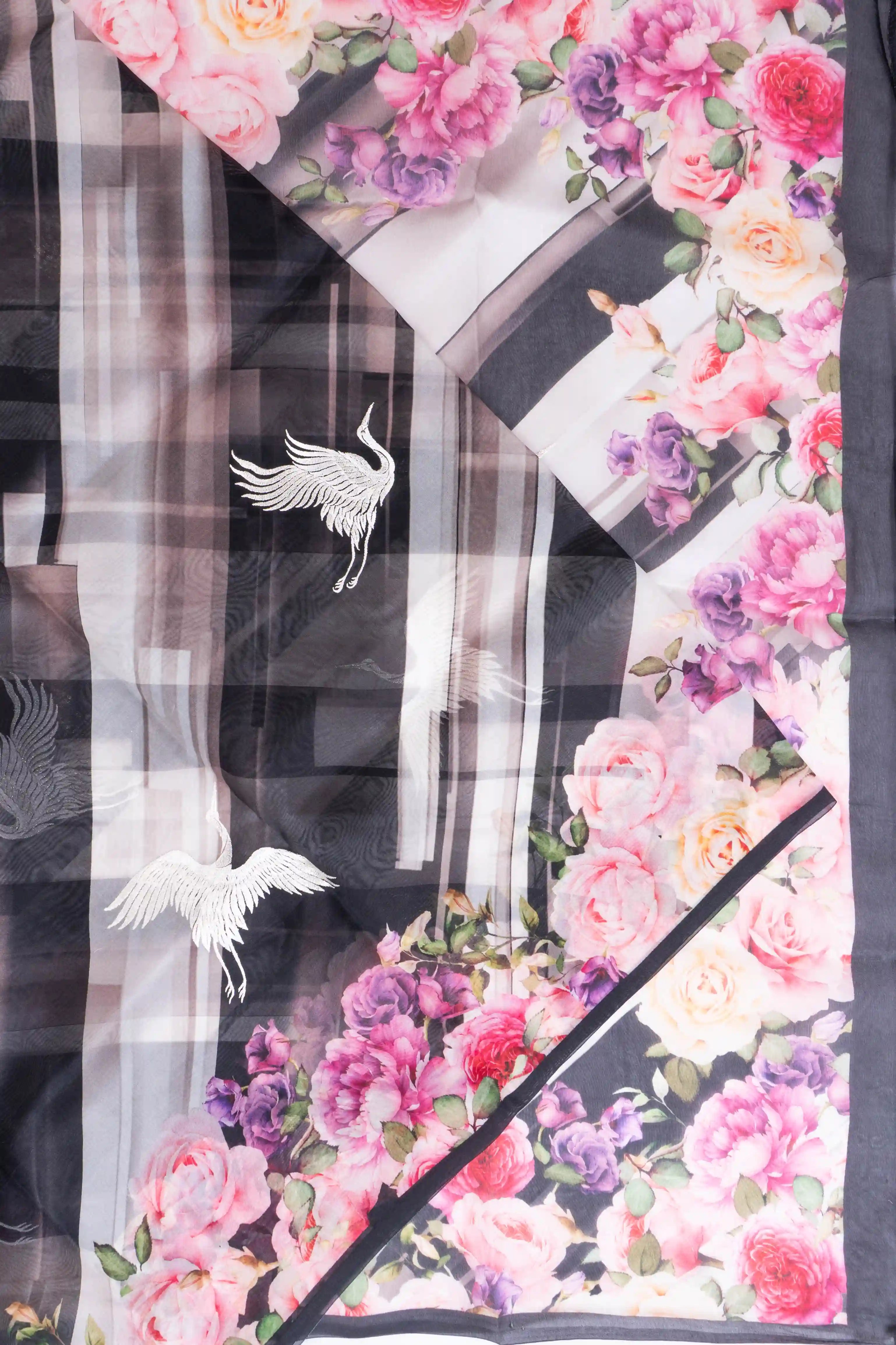The saree gracefully showcases a printed line with delicate embroidery bird motif buttas, exuding an air of sophistication and timeless beauty