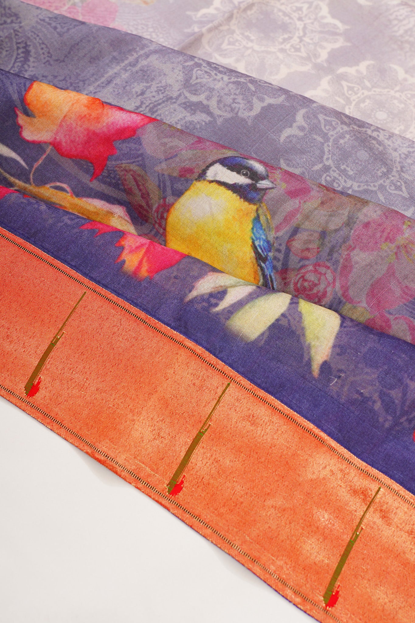 The body of the saree boasts exquisite flora prints, interwoven with enchanting bird motifs on its pleats, offering a vivid portrayal of nature's beauty