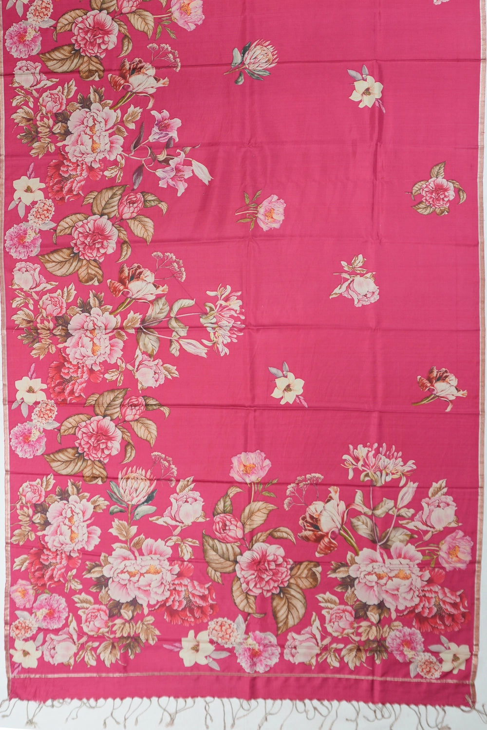 The saree's silk body is adorned with delicate floral prints, offering a vibrant yet elegant expression of artful design