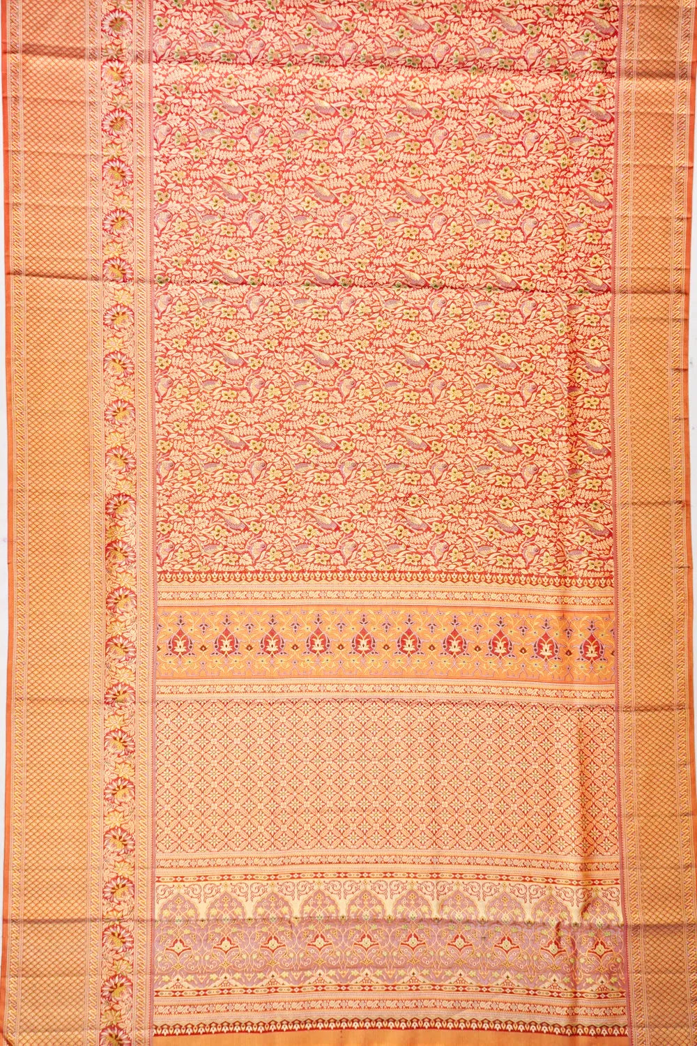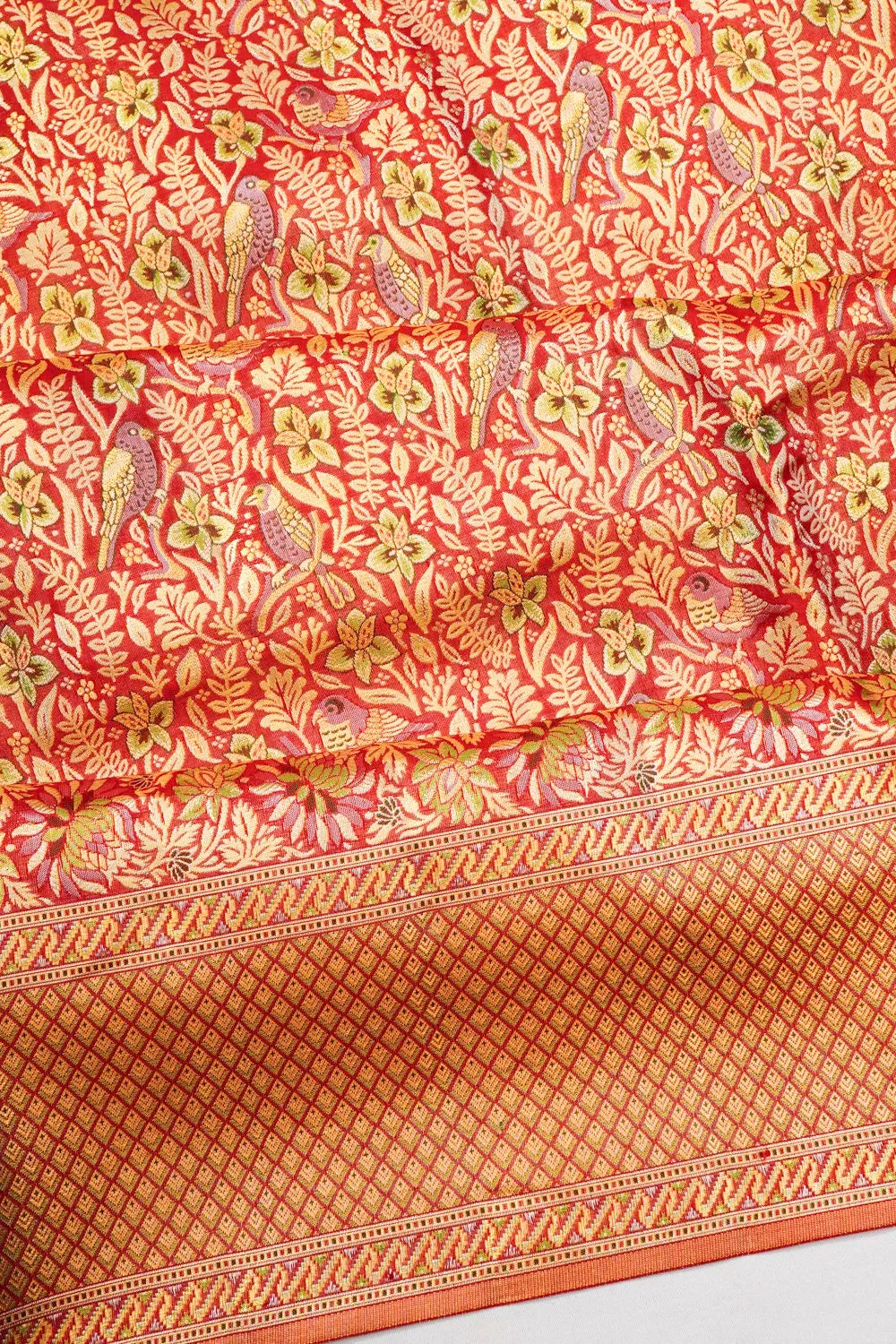The body of the saree is adorned with gold zari floral brocade interspersed with exquisite bird motifs, creating a resplendent tapestry of tradition and elegance