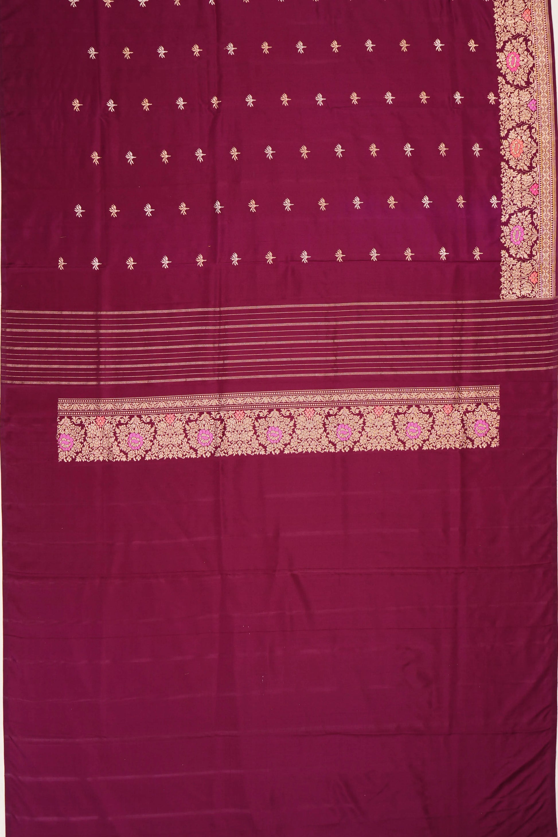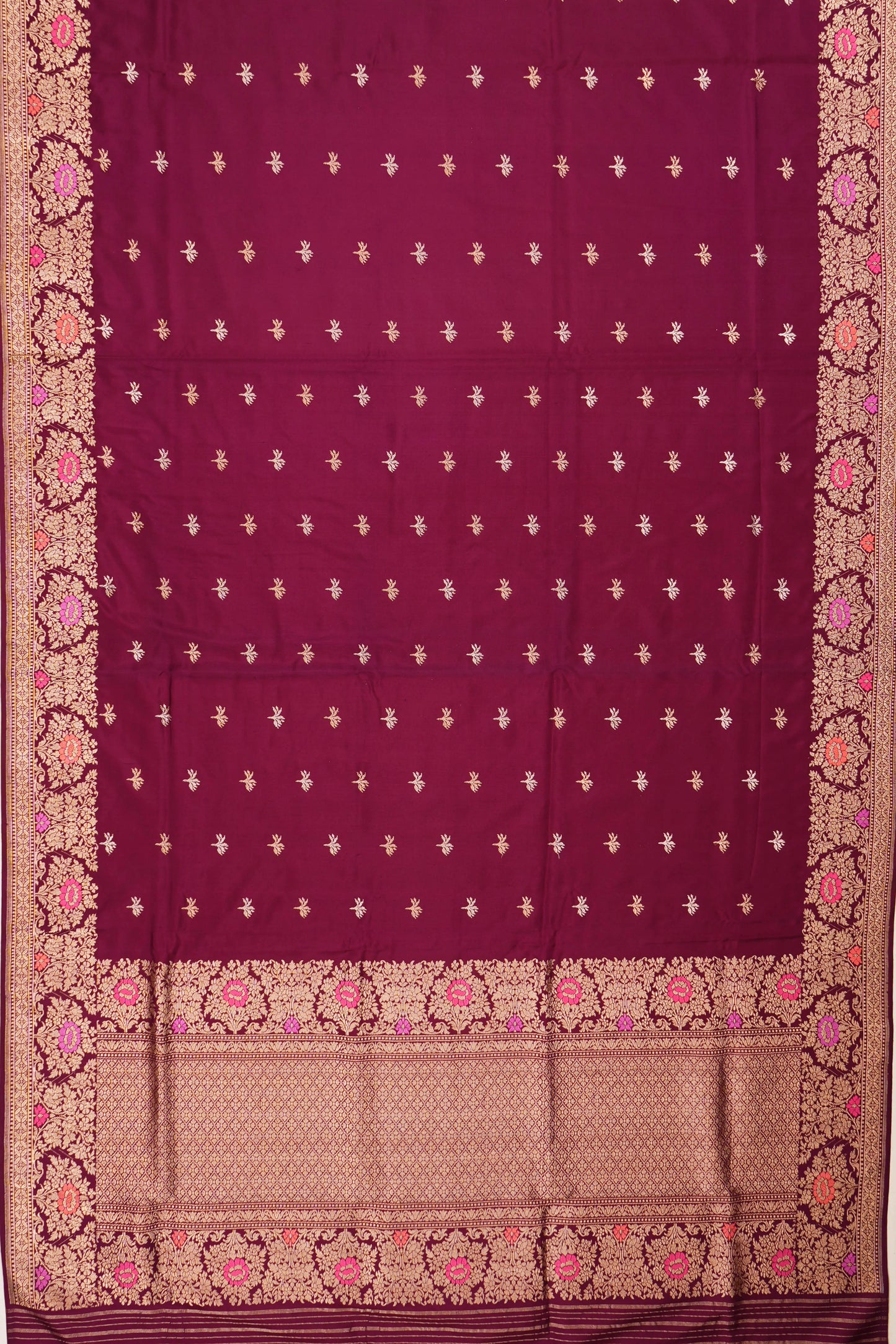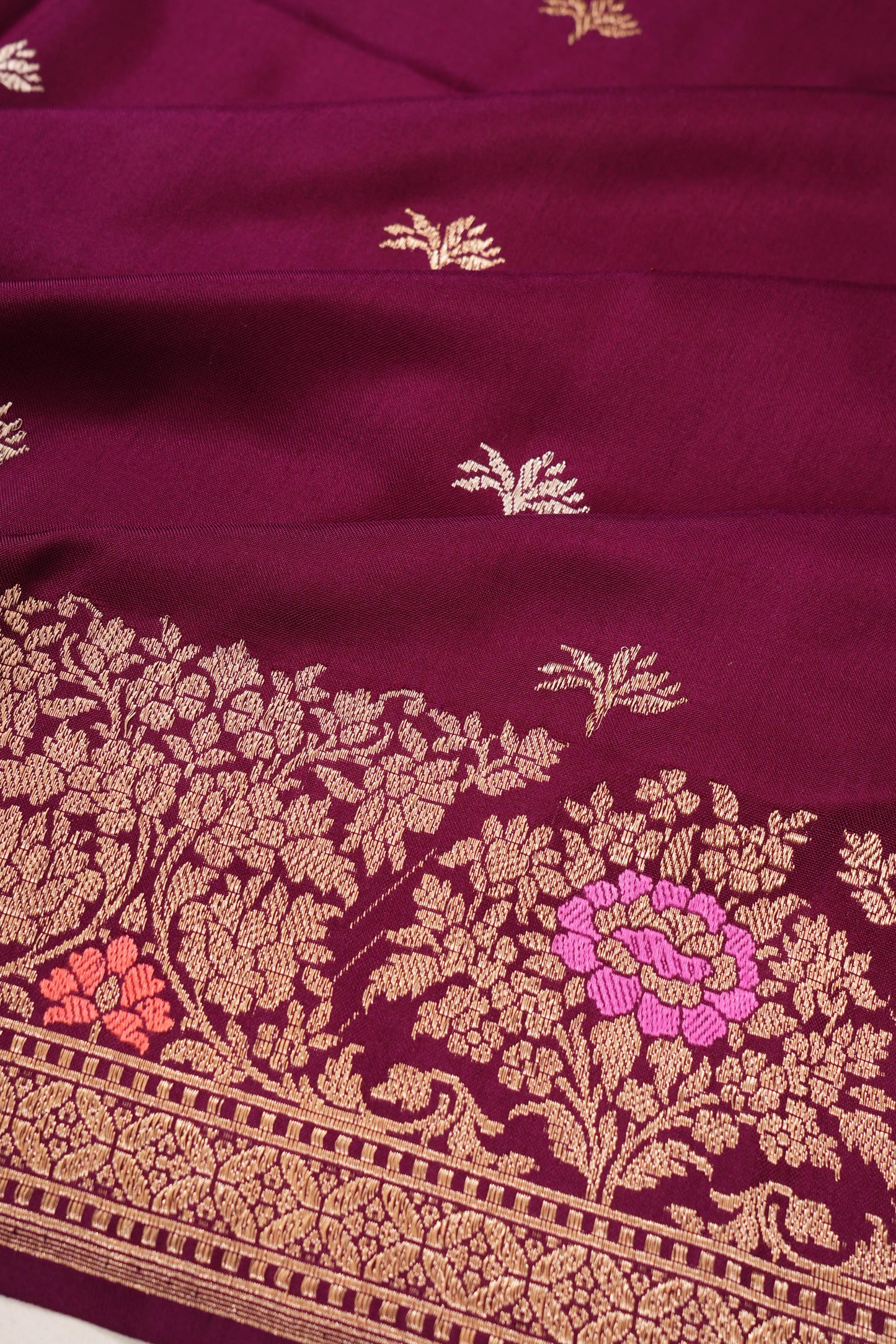 The self gold zari floral brocade small border with pink and orange meenakari adds a pop of vibrant color to the saree, enhancing the traditional beauty with detailed meenakari work in pink and orange.