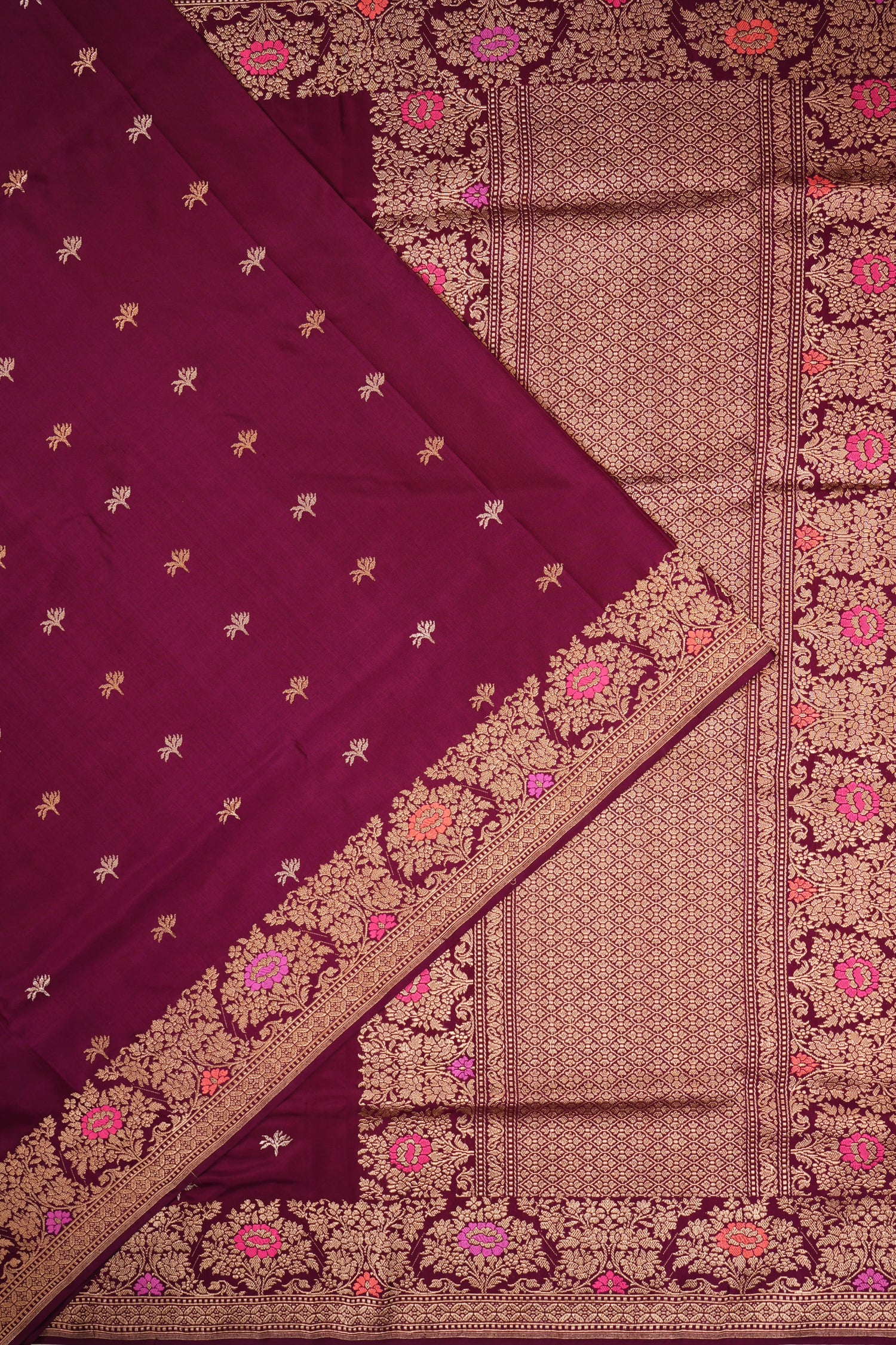 The self gold zari floral brocade pallu with pink and orange meenakari mirrors the border’s design, bringing together the richness of gold zari with the colorful meenakari accents, creating a beautiful and balanced finish.
