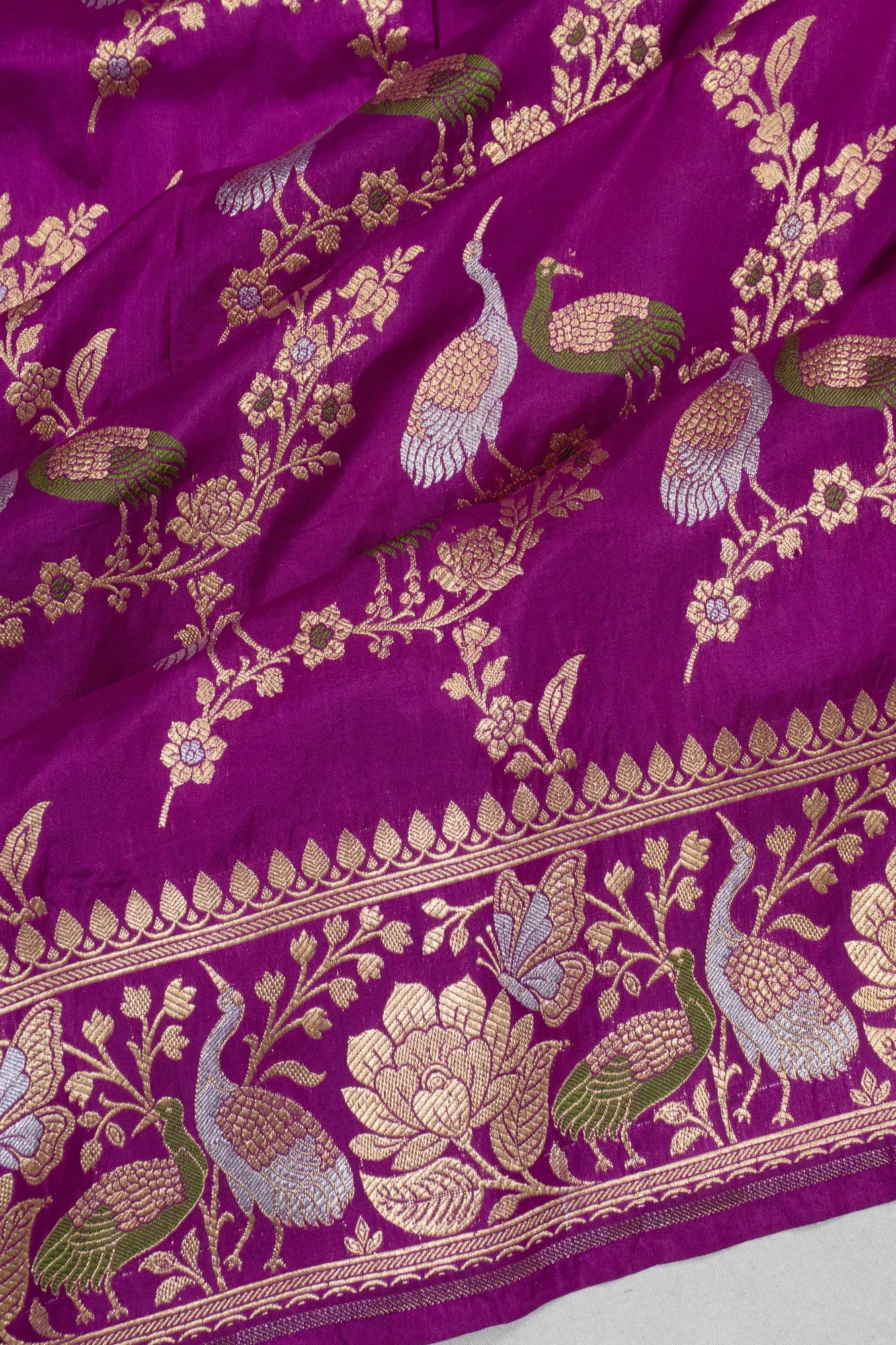 The saree's body is adorned with a captivating gold and silver zari floral jaal, interspersed with elegant swan motifs and meenakari detailing, creating a mesmerizing tapestry of art and elegance