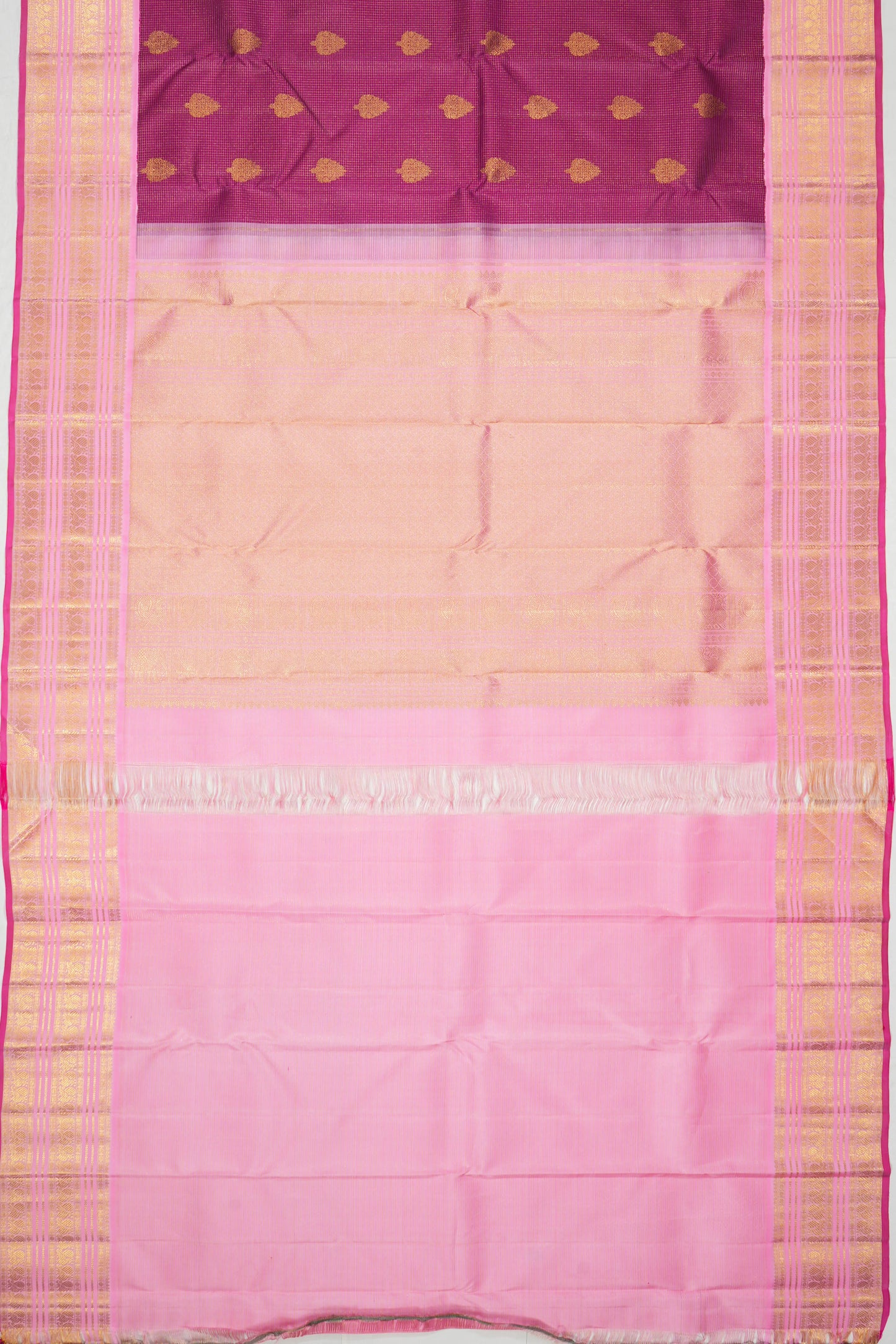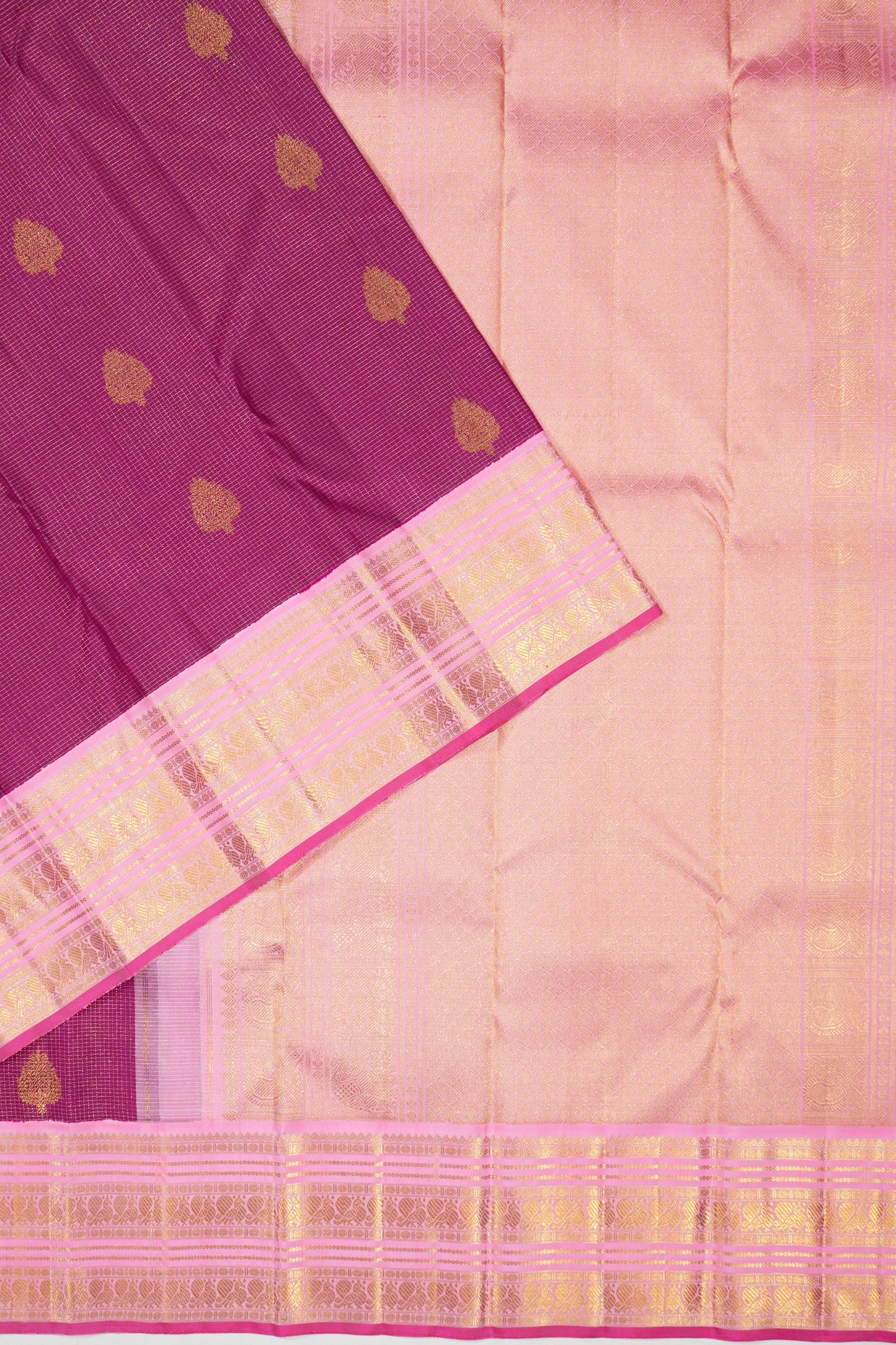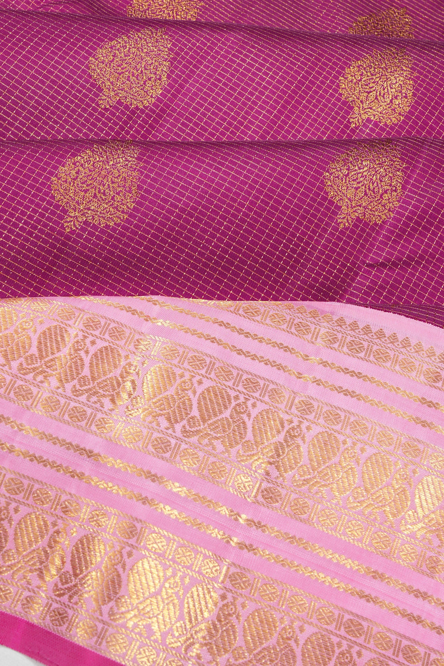 Contrast gold zari floral brocade baby pink small border with peacock motifs in series, followed by a pink edge, offering a soft, beautiful contrast that frames the saree.