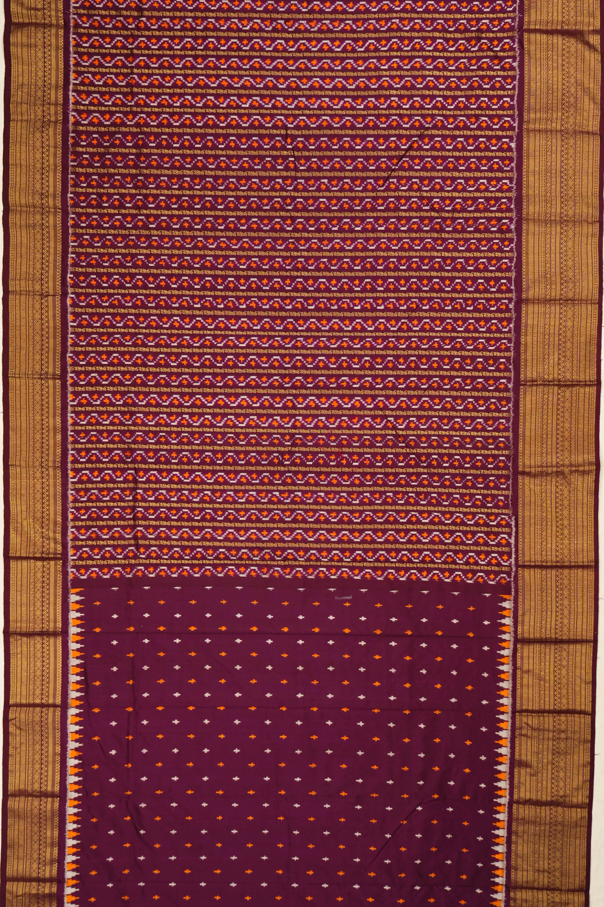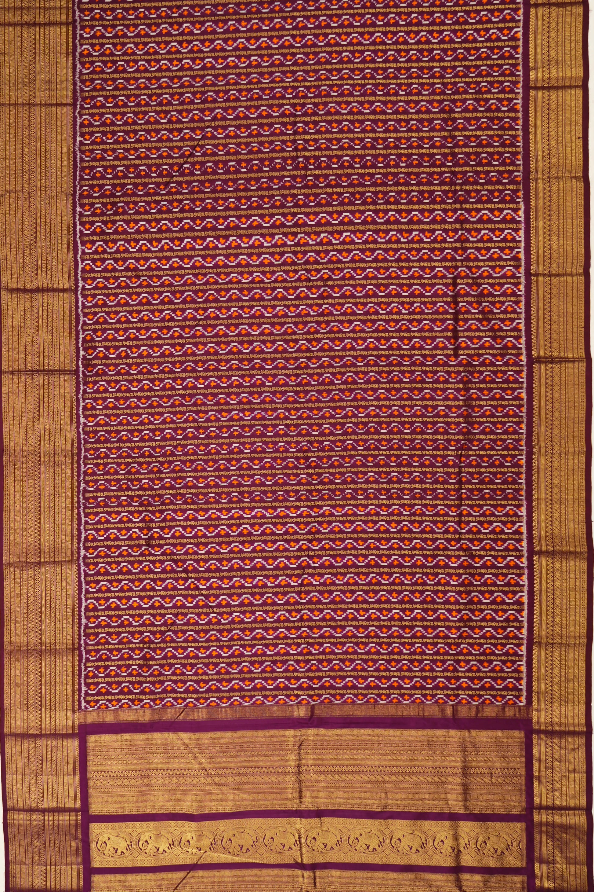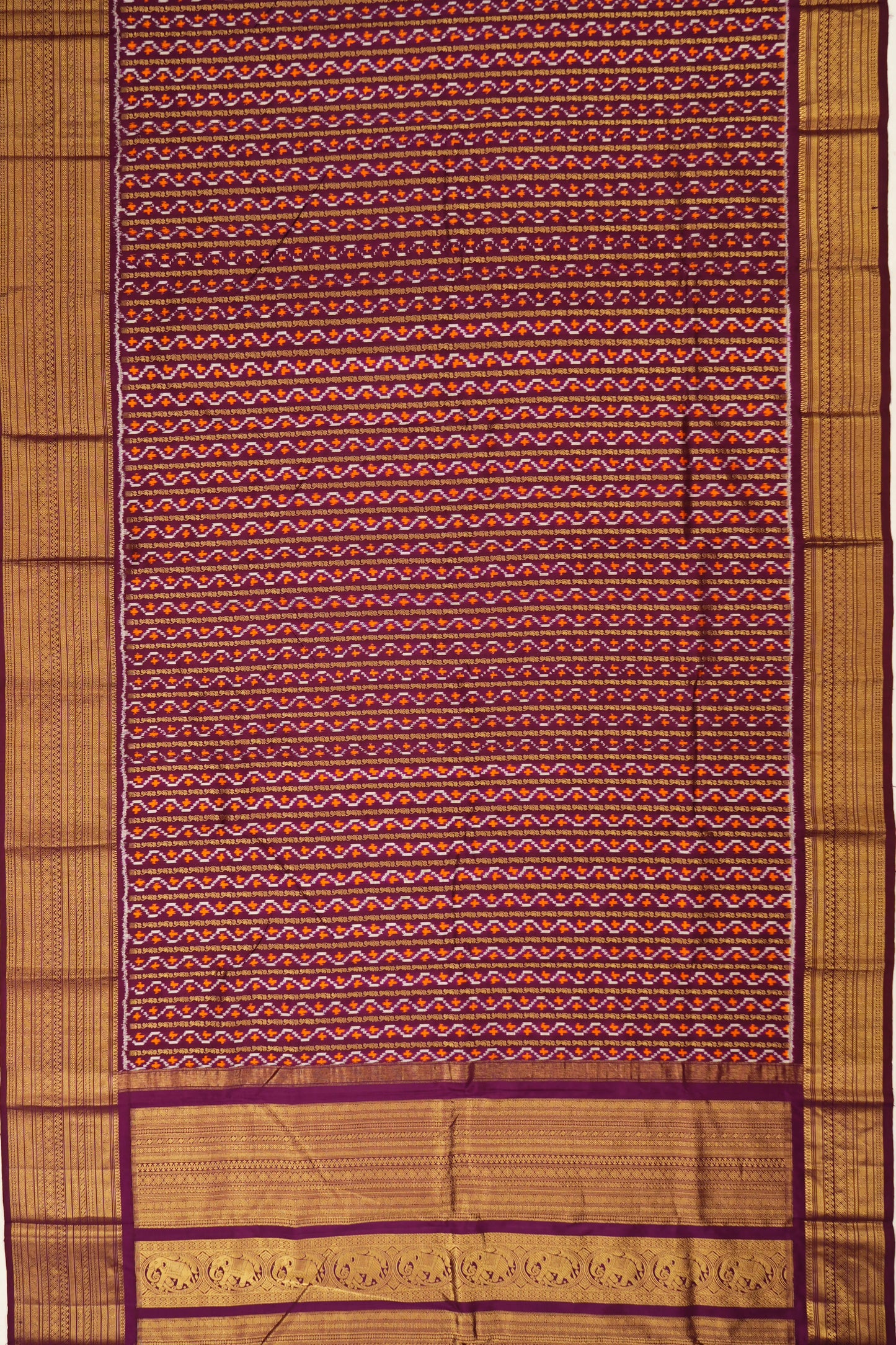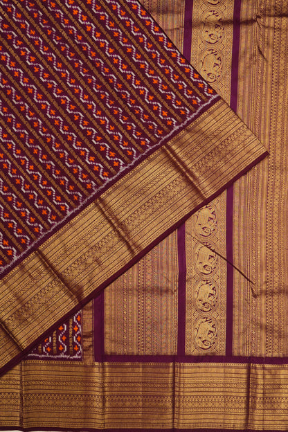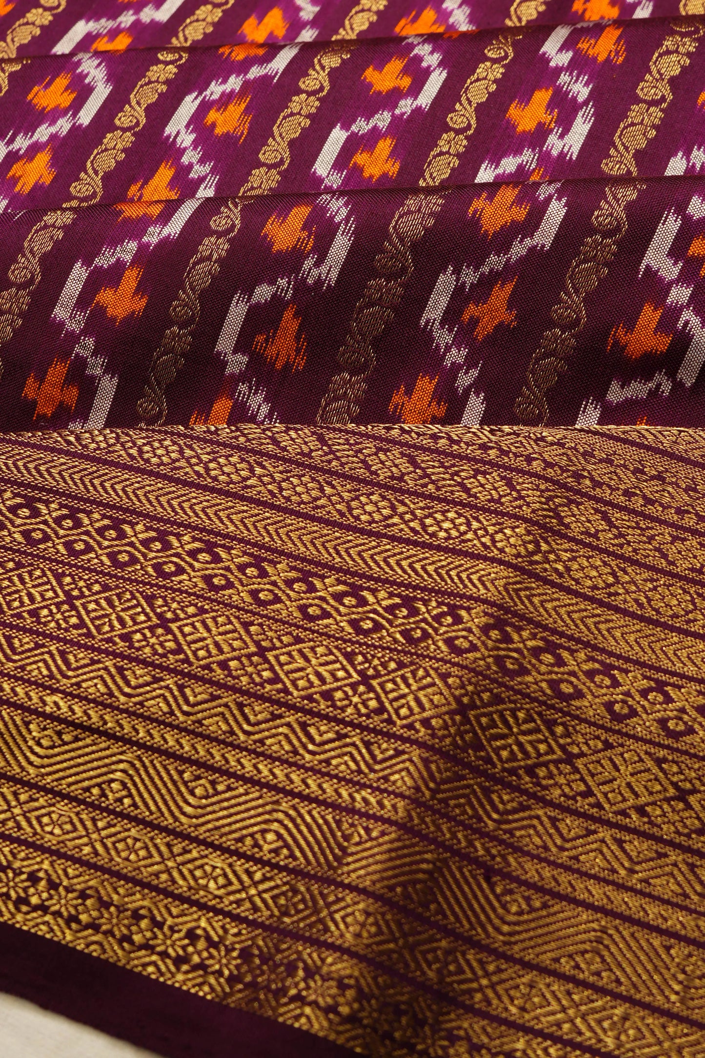 This purple saree combines traditional Ikat patterns with gold zari vertical lines brocade, blending modern design with classic craftsmanship for a distinctive look.