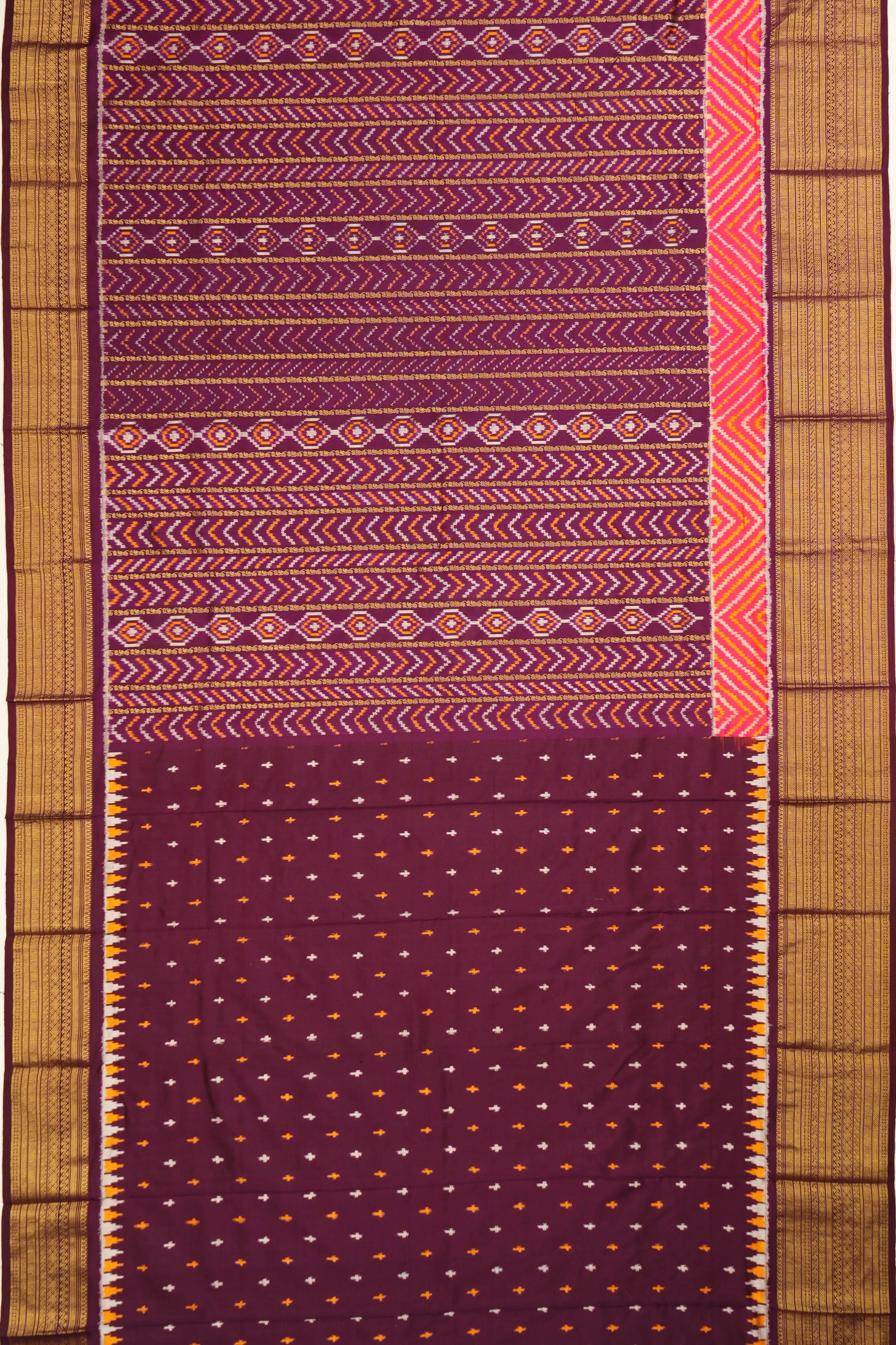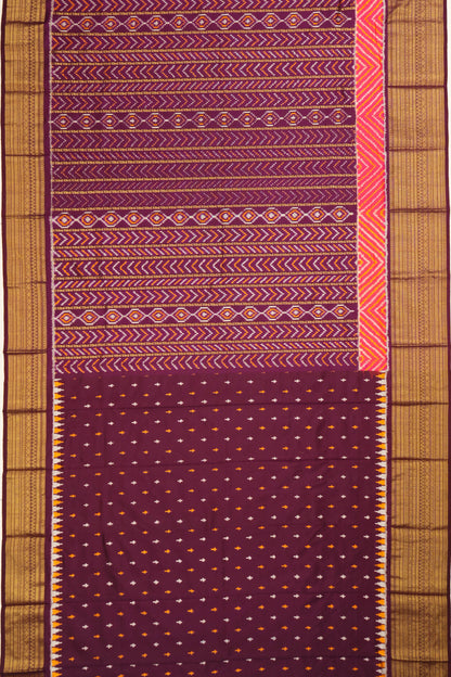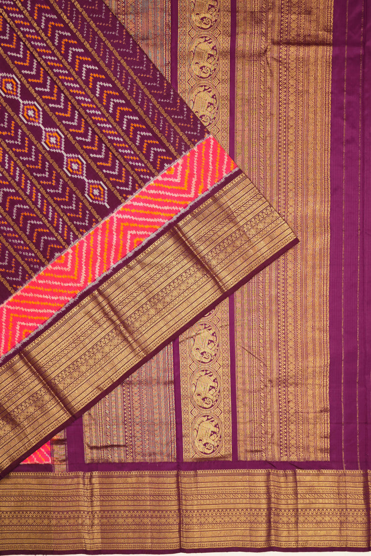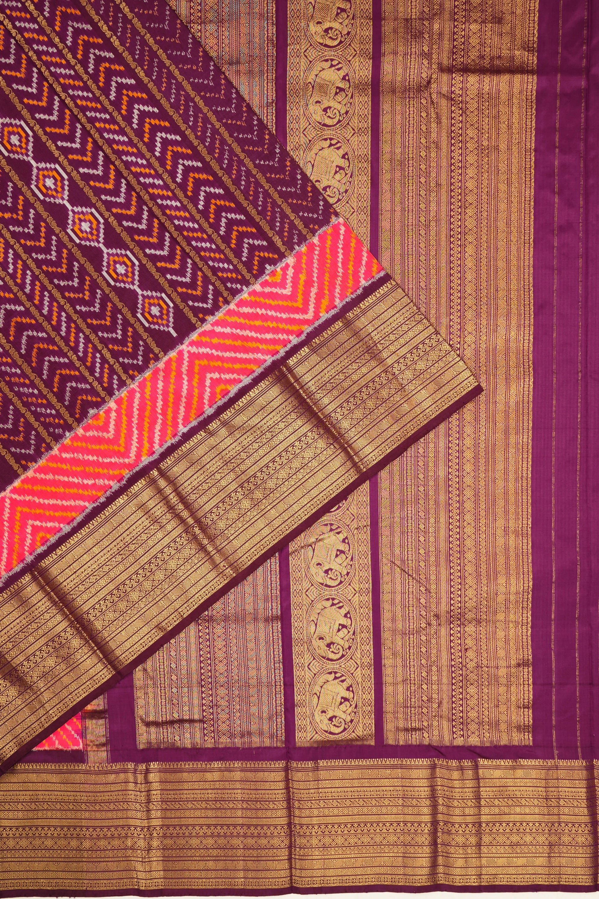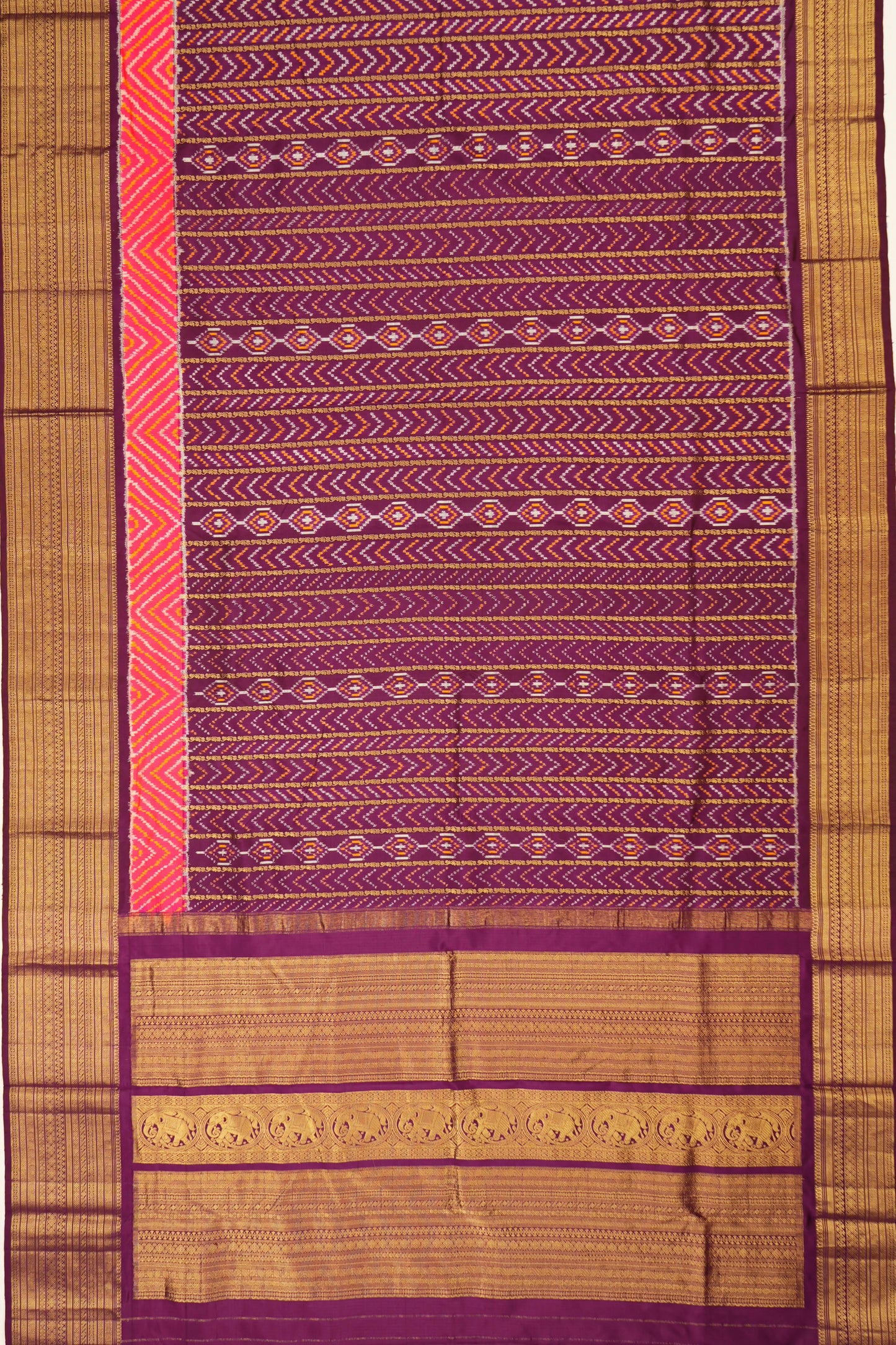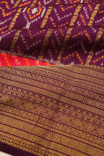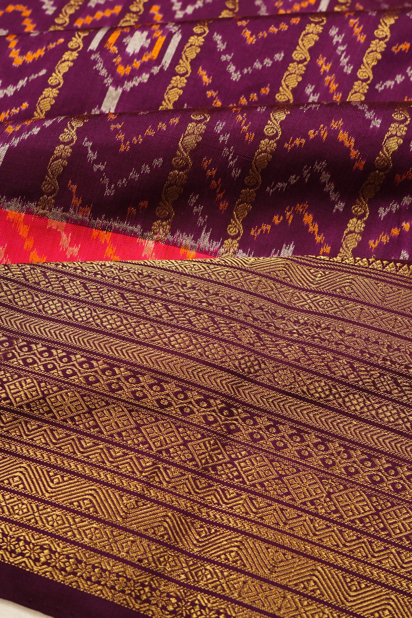 This rich purple saree features a striking blend of Ikat patterns and gold zari vertical lines brocade, combining traditional artistry with contemporary style for a distinctive look.