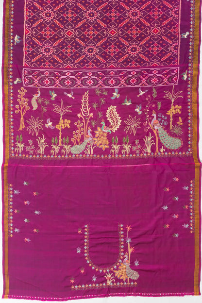 The self-embroidery blouse features peacock motifs around the neck and along the borders, adding an extra layer of beauty and detailing. The embroidery ties in with the overall theme of the saree, creating a coordinated, elegant look