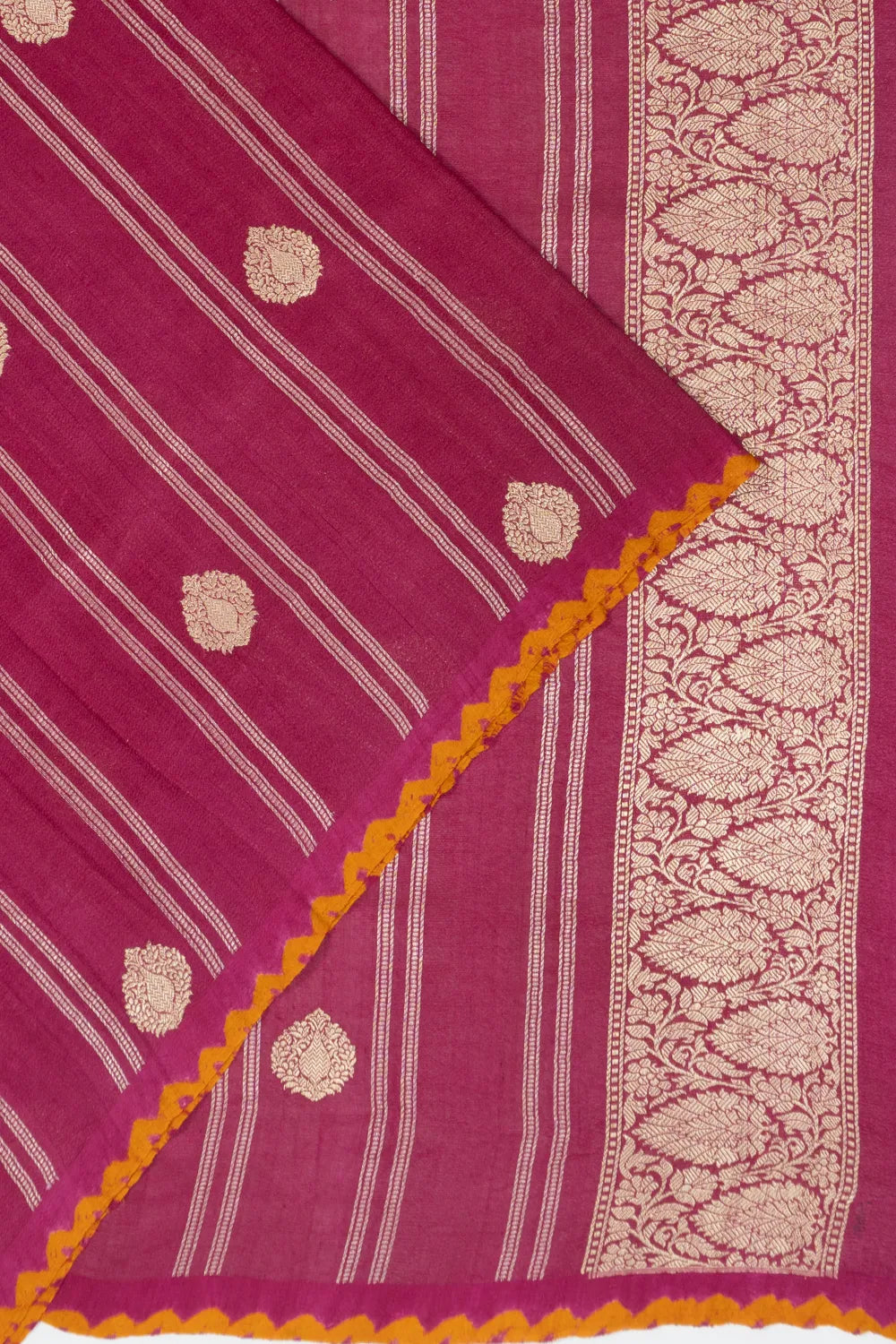 The saree features gold zari vertical lines paired with floral butta, creating a visually striking effect that merges tradition with contemporary elegance.