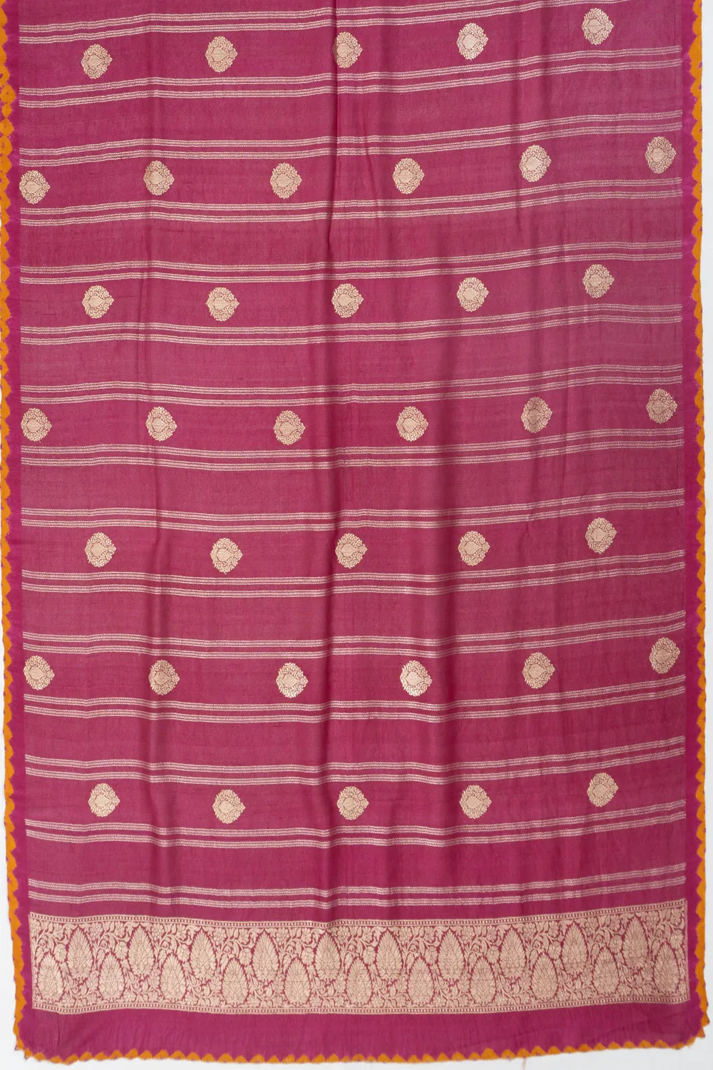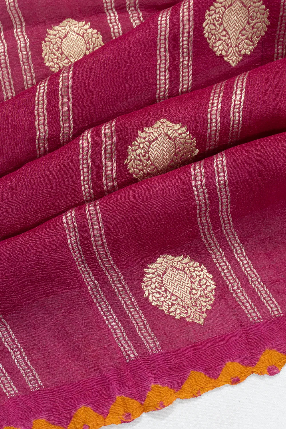 This saree has no traditional border, instead boasting a Bandhani-inspired yellow edge that adds a playful and unique touch to the design, giving it a modern flair while still maintaining the essence of traditional weaving techniques.