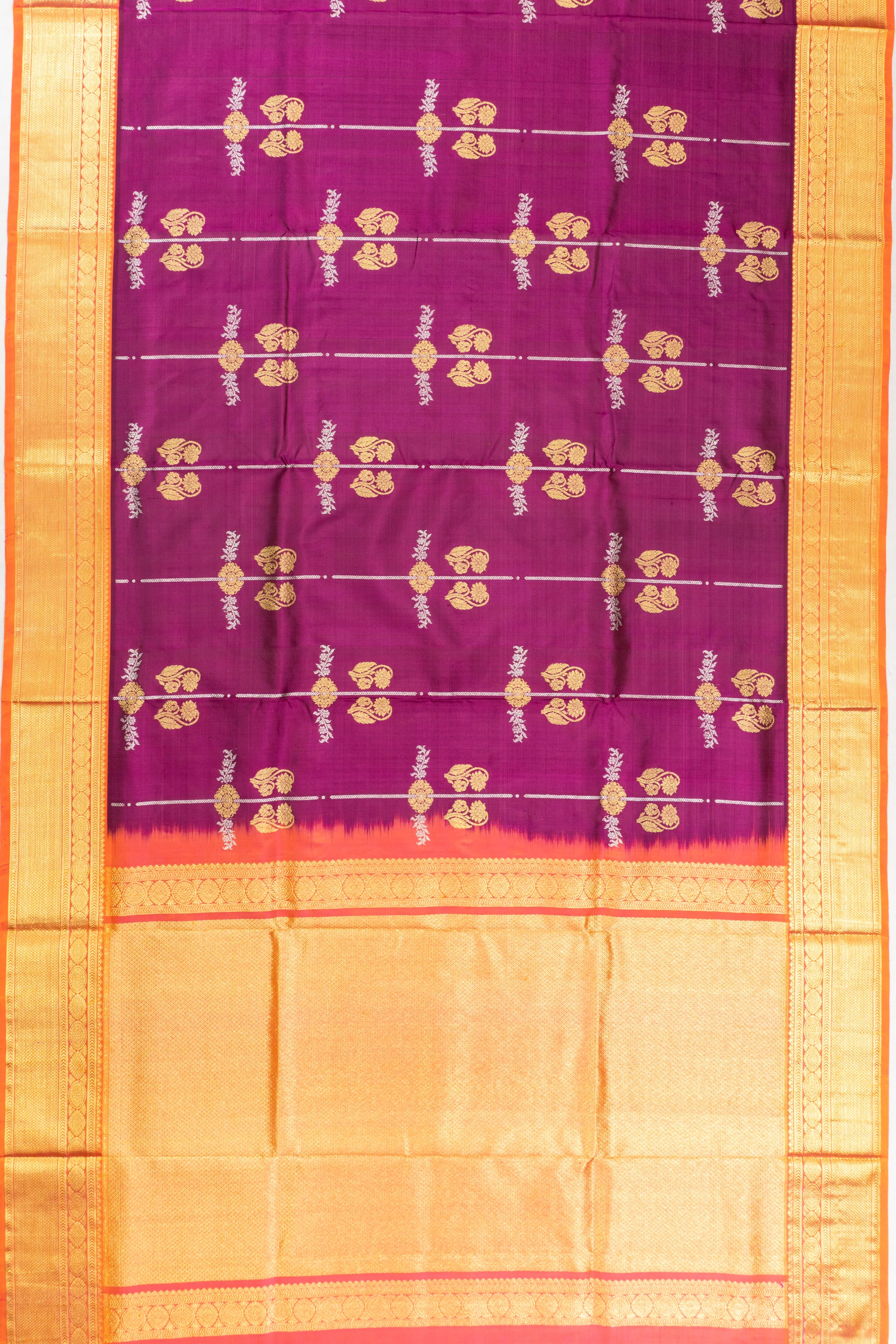 The saree features a mesmerizing array of gold and silver zari floral brocade, seamlessly enveloping the fabric with grace and sophistication