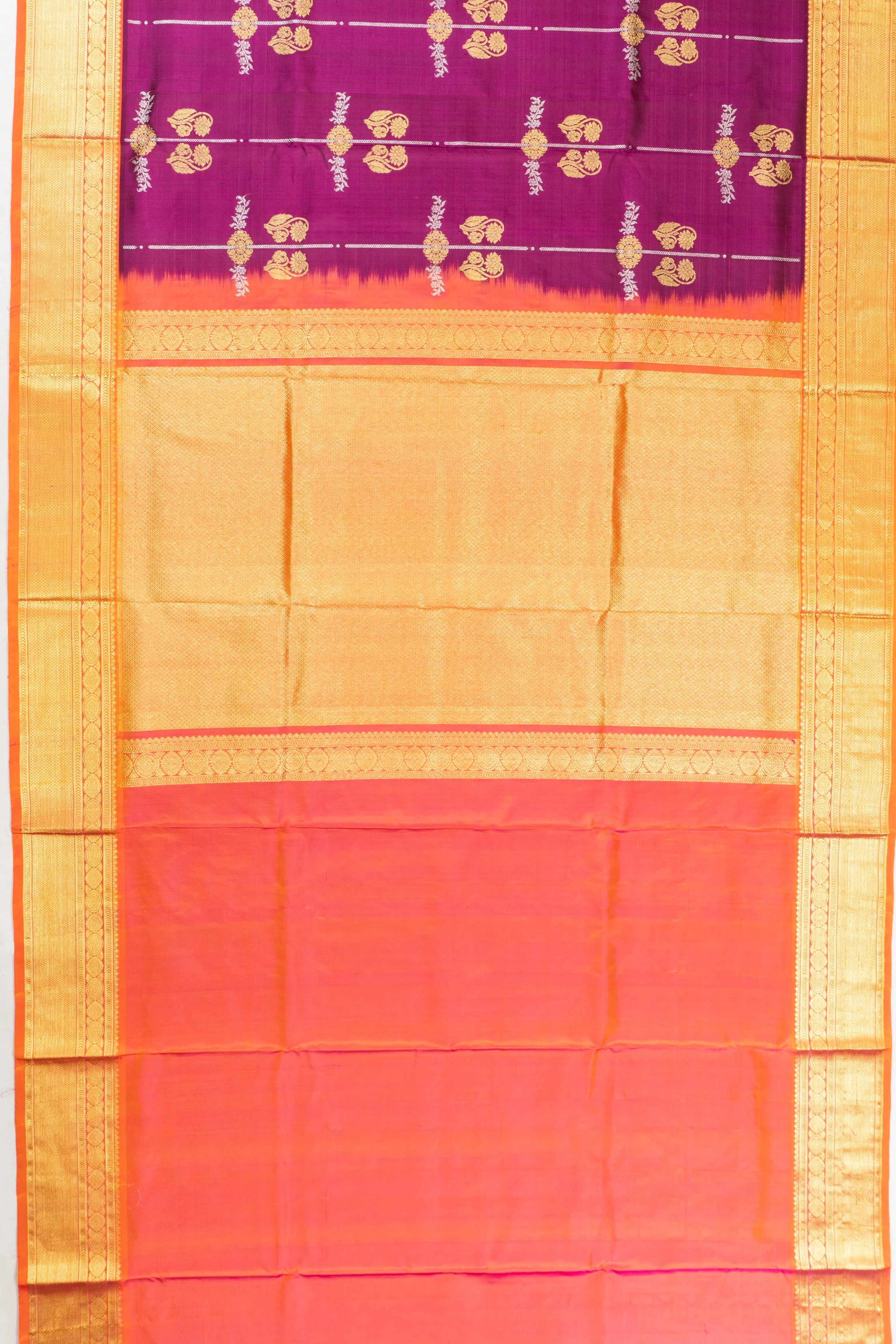 A small orange border, enriched with gold zari brocade and delicate florals, enhances the saree's charm, while the contrast pink pallu, adorned with intricate floral motifs, adds a touch of grandeur