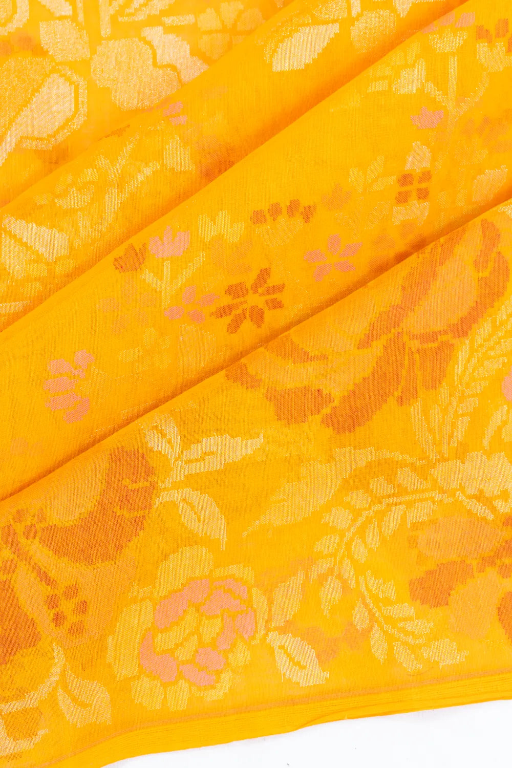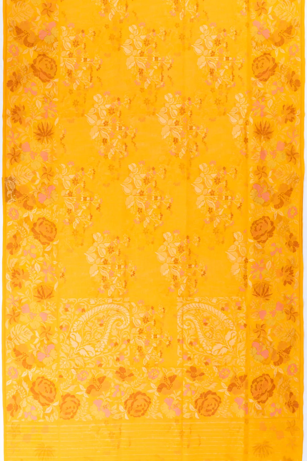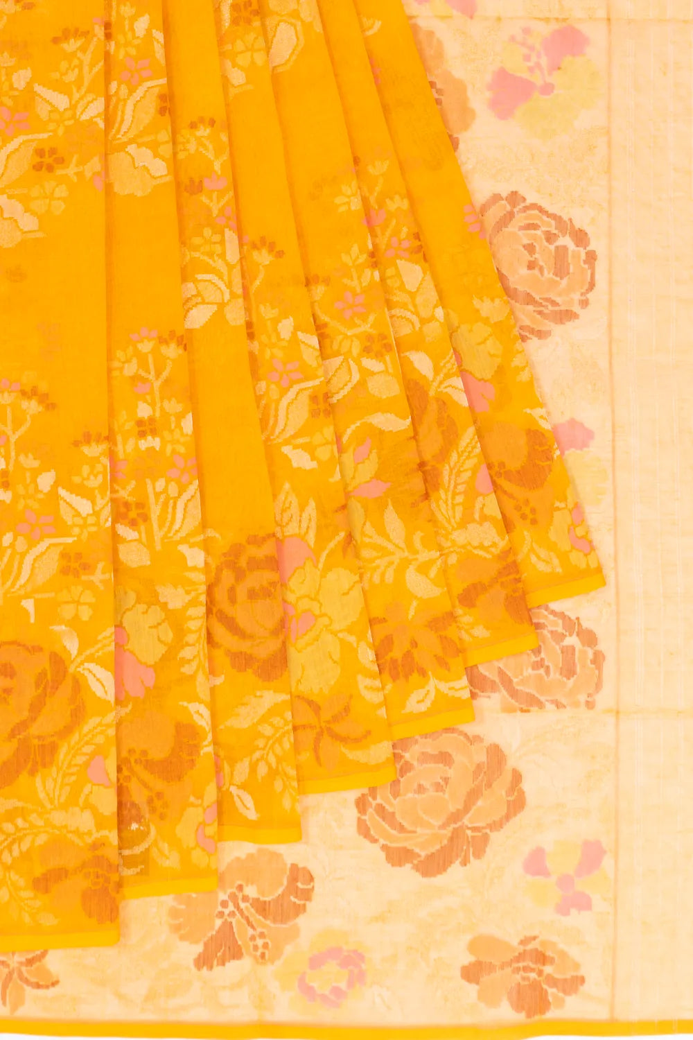 A vibrant Yellow Banarasi Cotton saree intricately woven with floral jamdani motifs across the body, radiating artisanal grace.