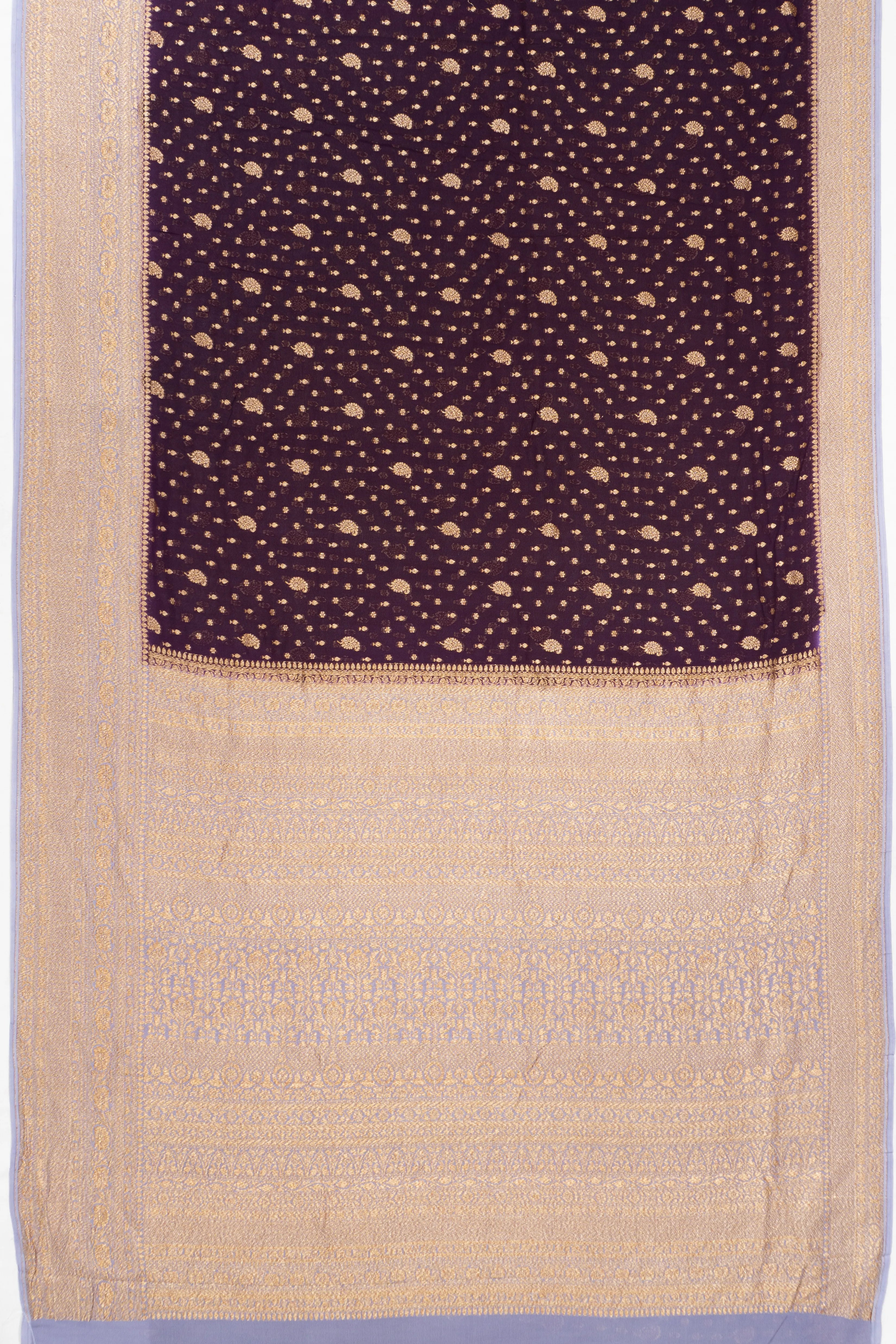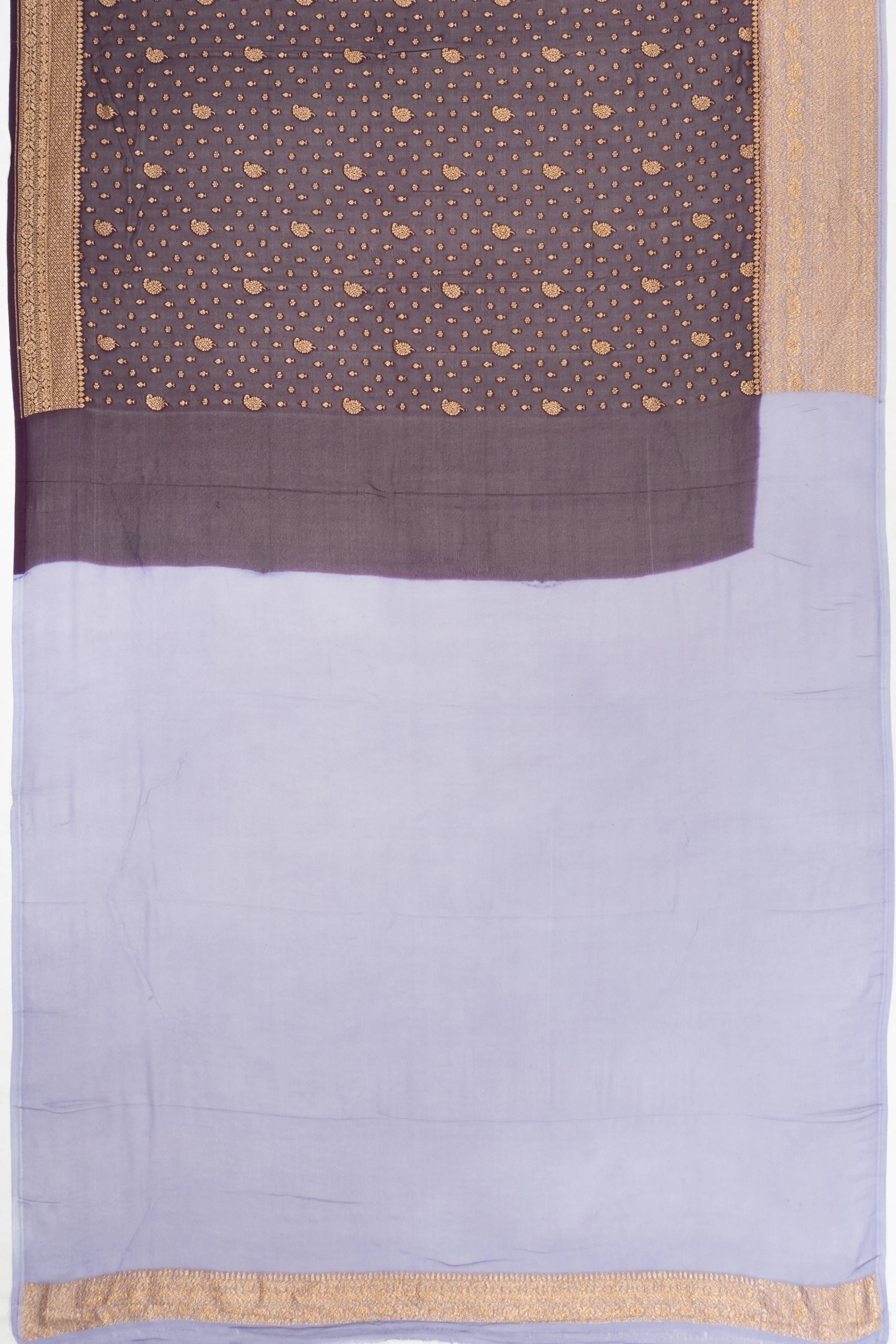 This saree features a pastel blue border, delicately adorned with gold zari floral vines, offering a harmonious contrast