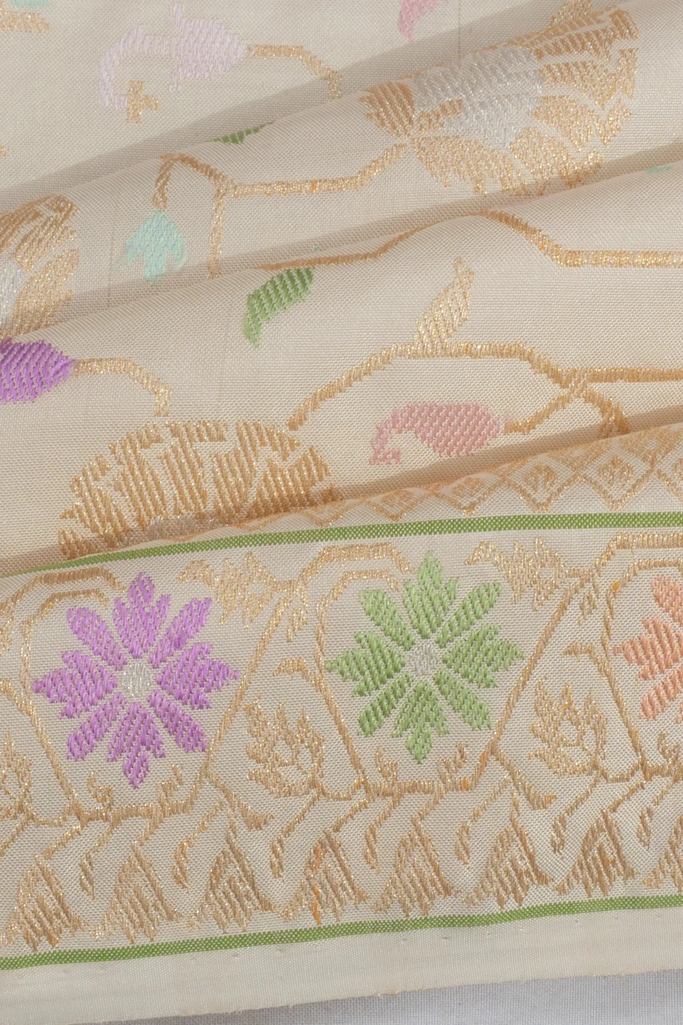 Self gold zari floral vines small border accentuated with multicolour meenakari work, lending a delicate yet colourful finish to the saree’s edges.