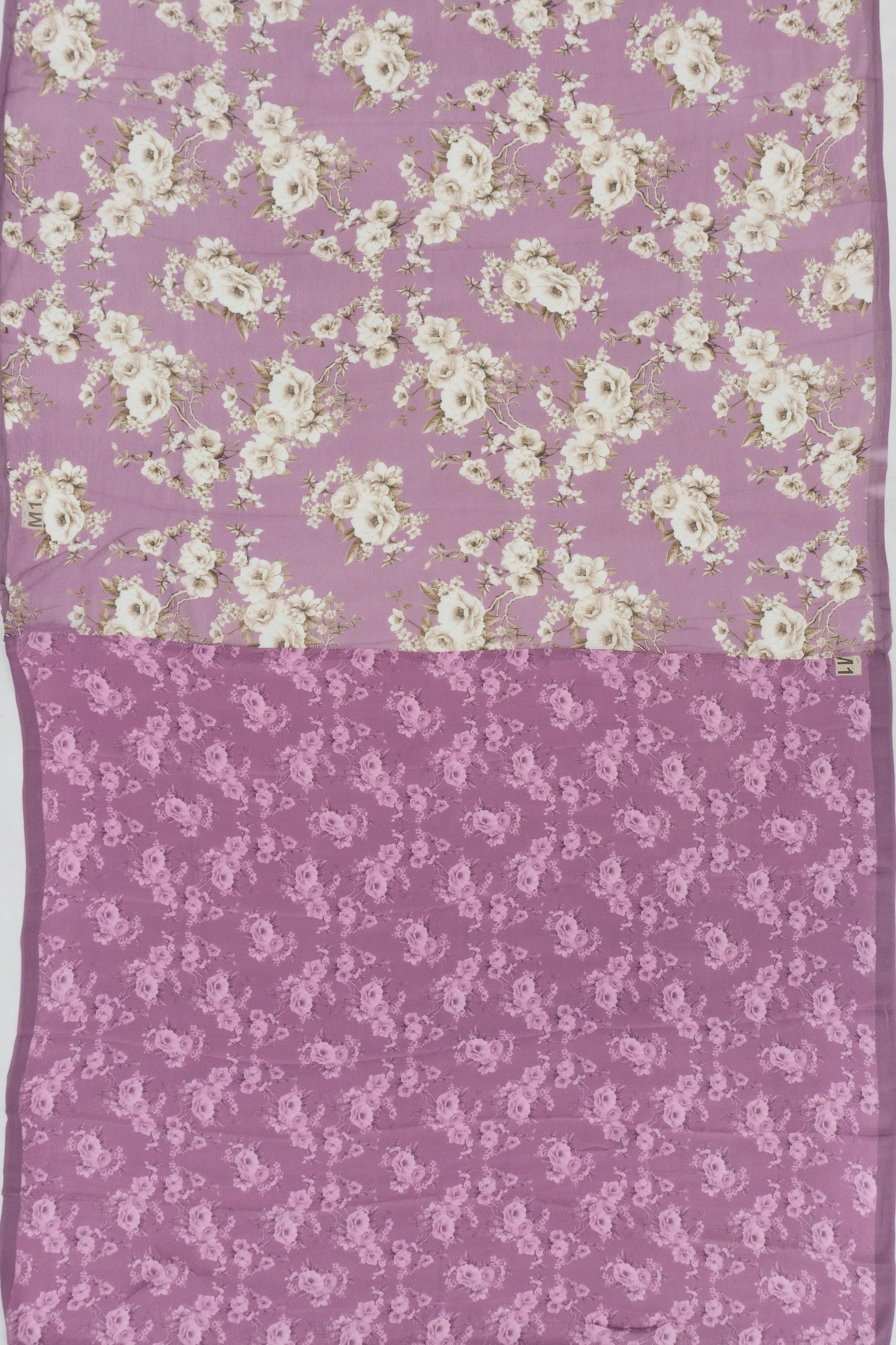 The saree features a captivating array of floral prints that dance across the lilac canvas, evoking the charm of a blossoming garden