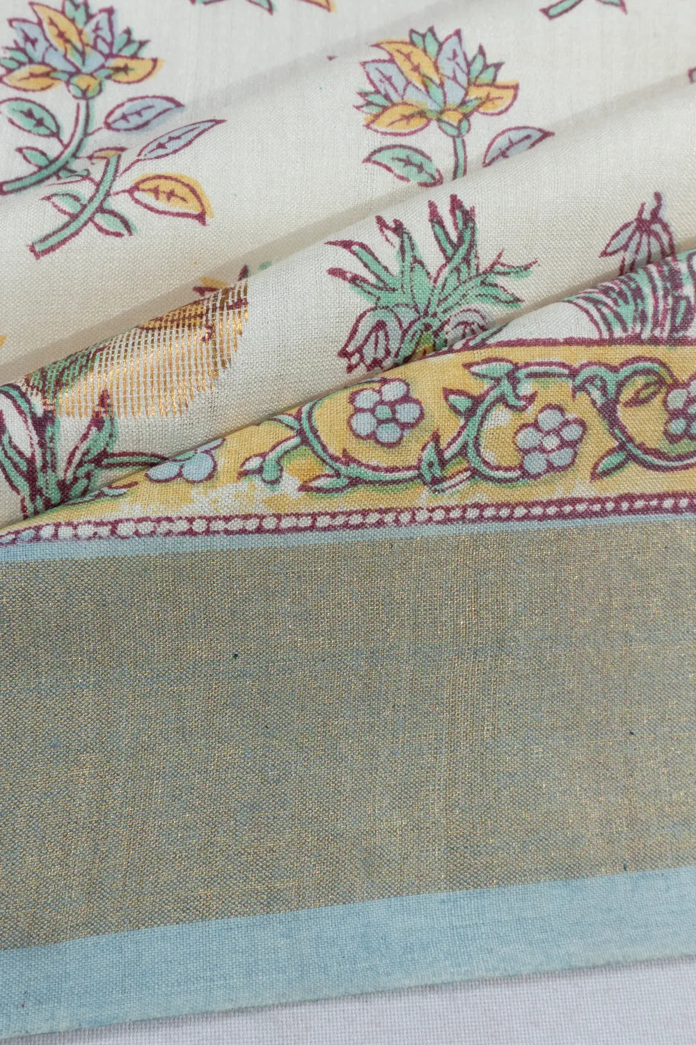 Designed with a contrast pastel blue small border in gold zari kaddi weave, offering a refreshing tone.
