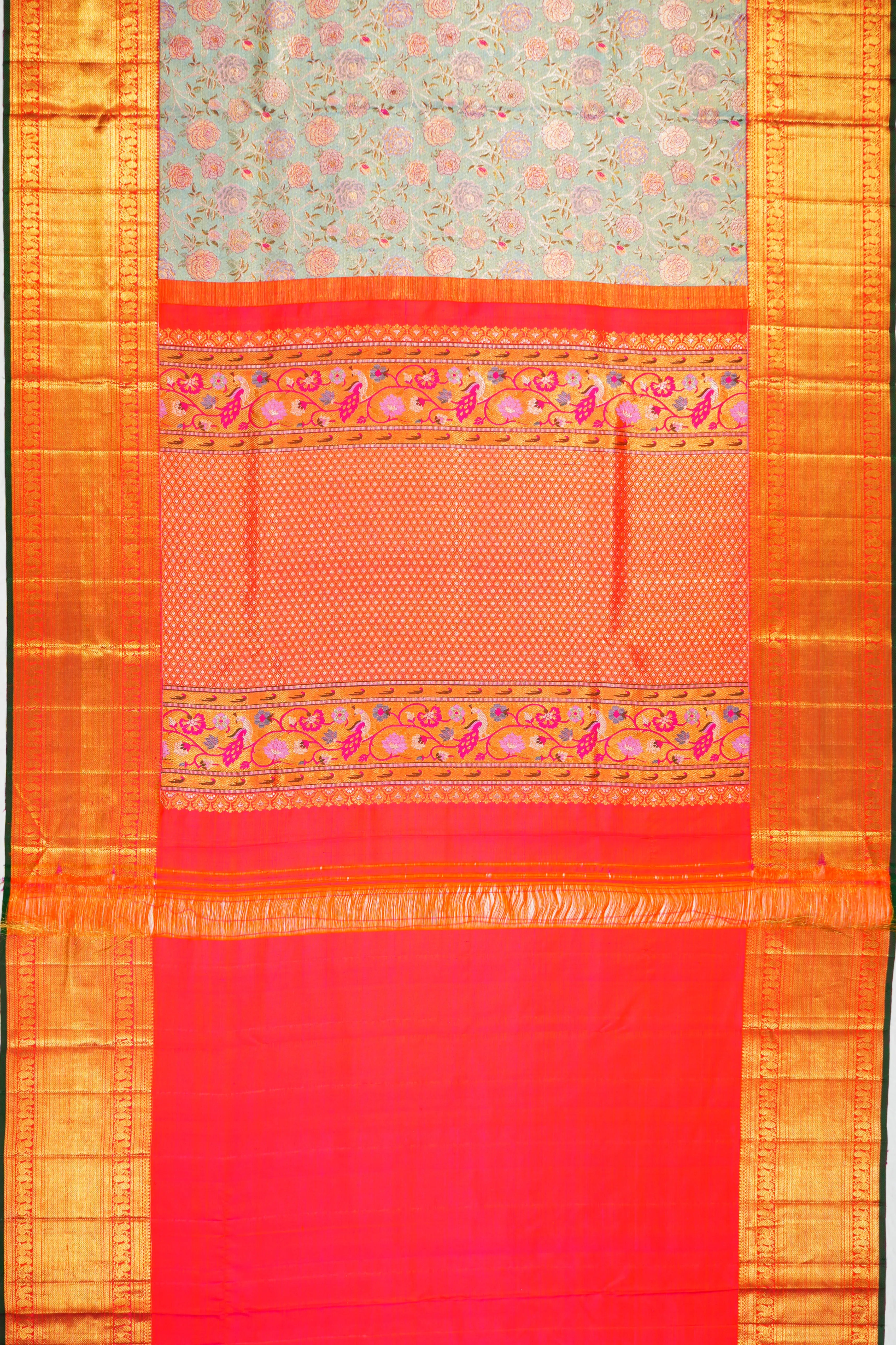 Contrast gold and silver zari floral brocade pallu with peacock motifs gracefully interlaced in floral vines, adding depth and texture.