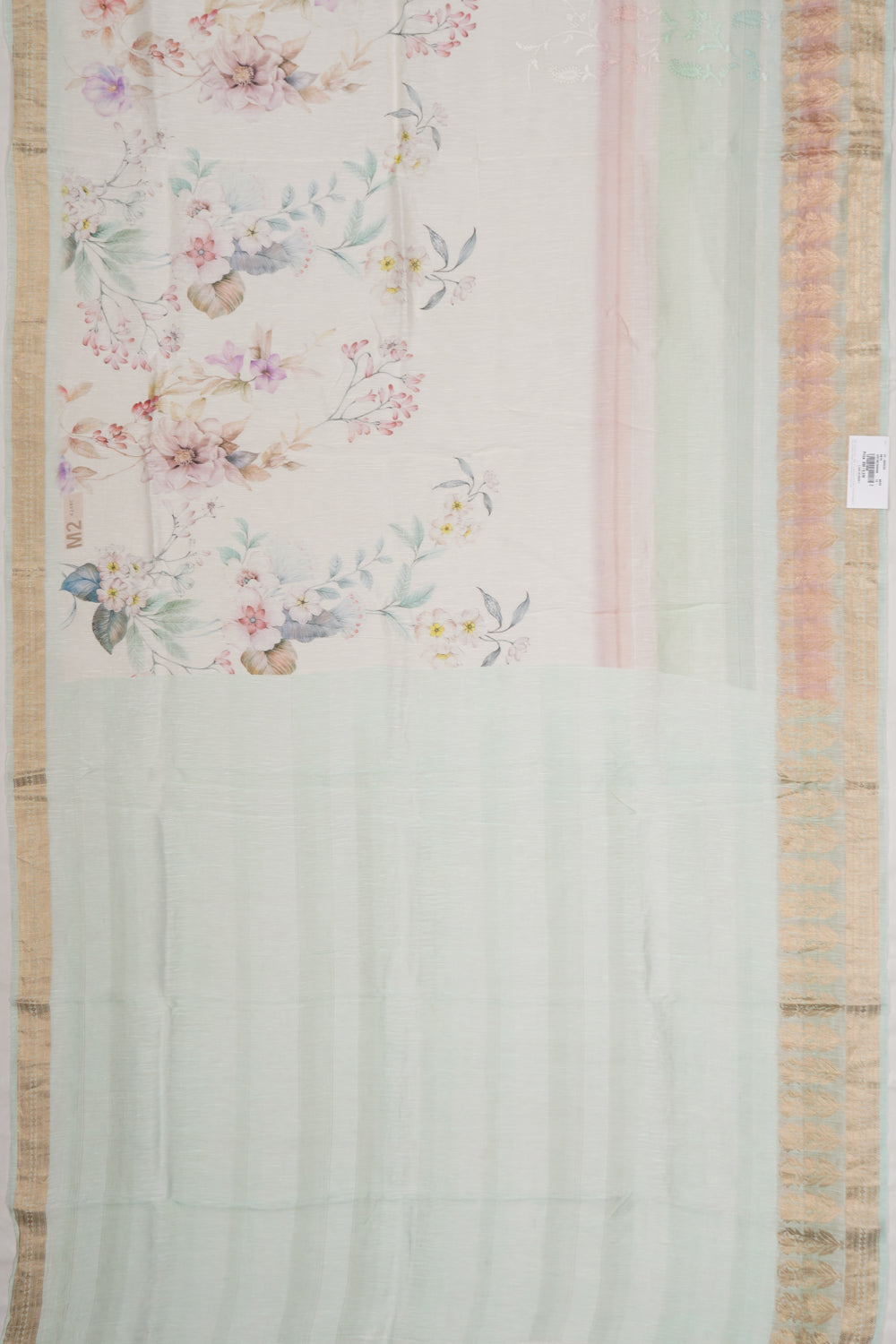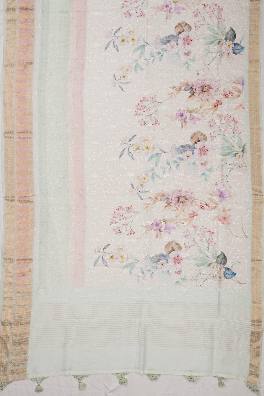 The body of the saree is adorned with vibrant prints, offering a refreshing blend of colors that evoke a sense of timeless elegance