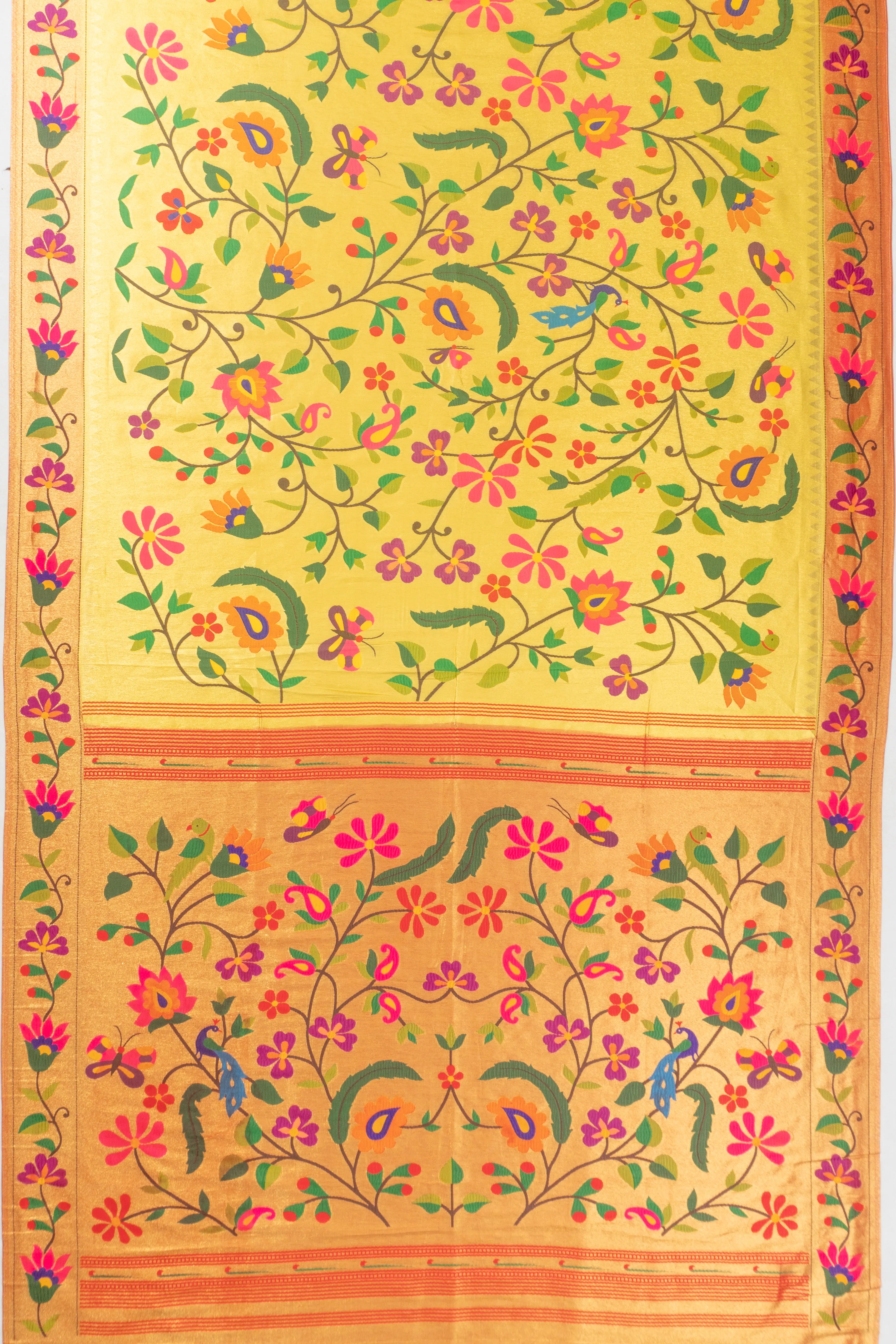The saree's body showcases a mesmerizing silk jaal pattern that glistens with golden hues, enhancing its luxurious appeal
