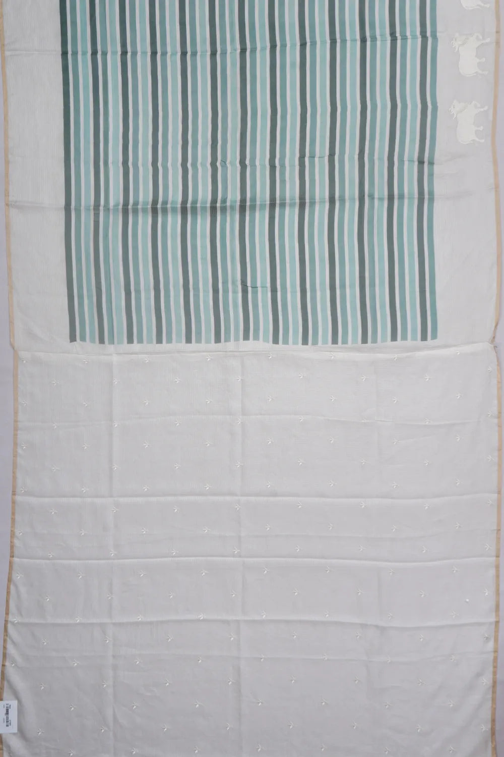 Accompanied by a beautifully coordinated white blouse featuring floral embroidery buttas, this saree is a perfect blend of tradition and elegance, ideal for any graceful occasion