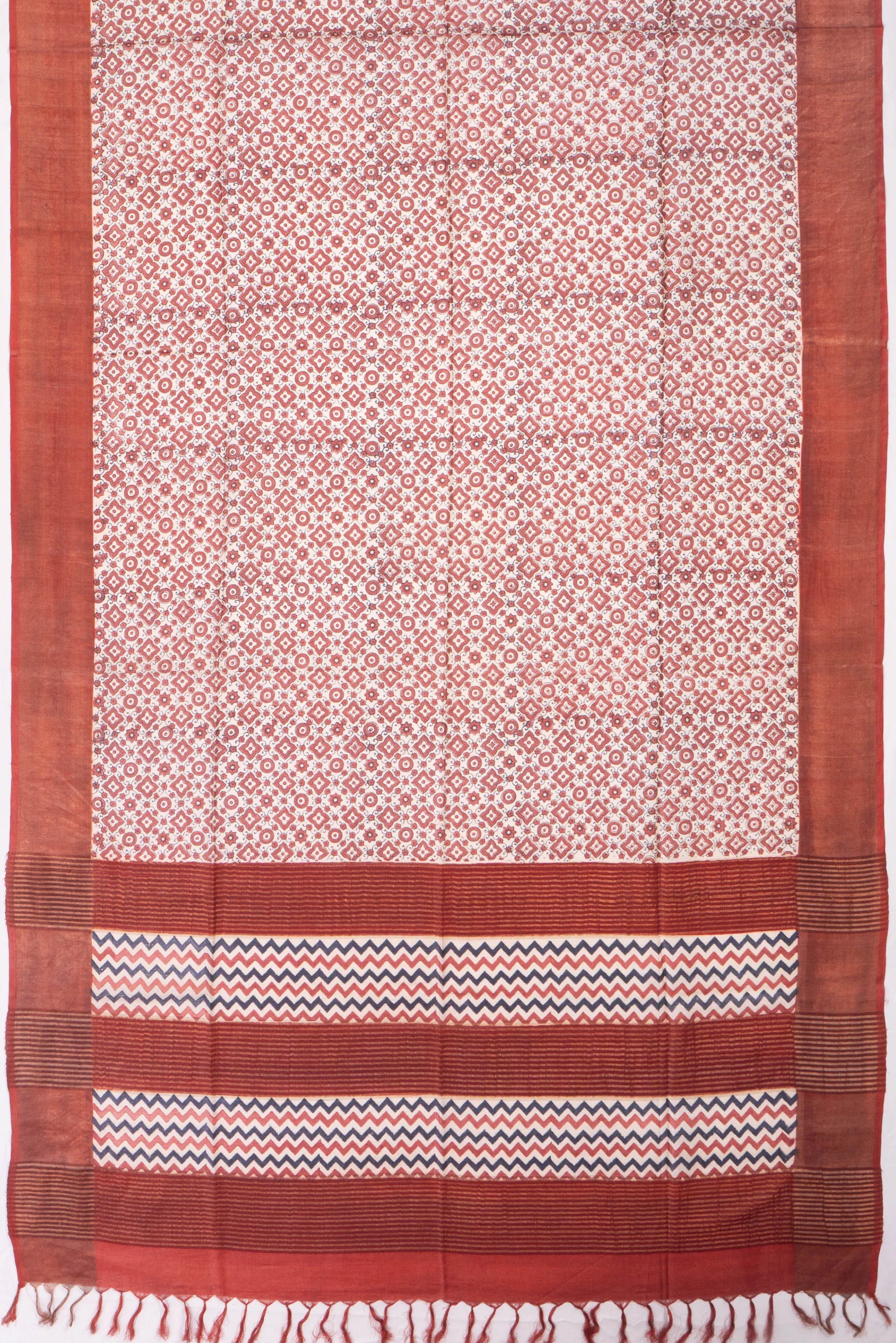 The saree's body is adorned with graceful floral batik prints that evoke a timeless charm, beautifully set against a pristine white backdrop